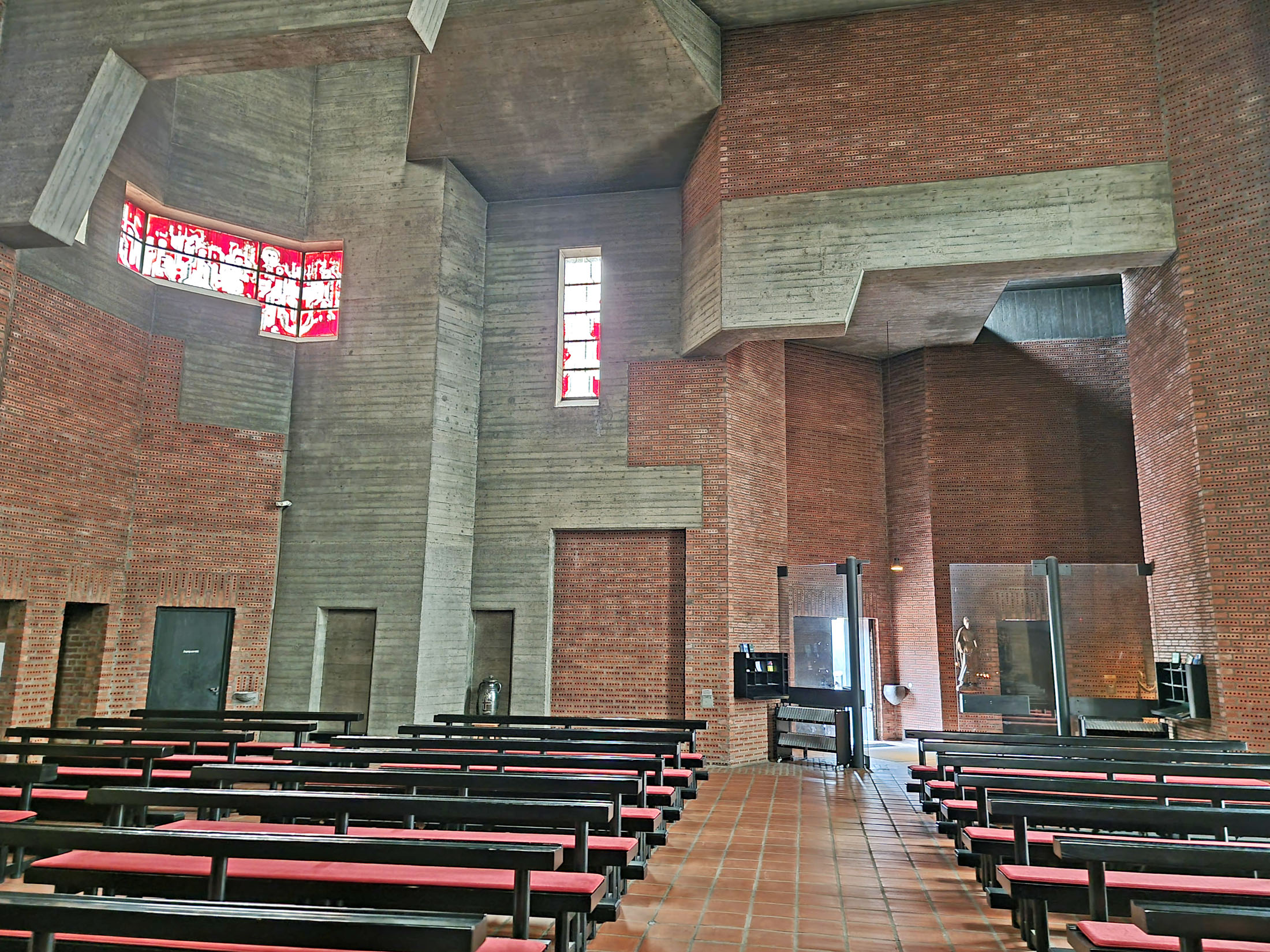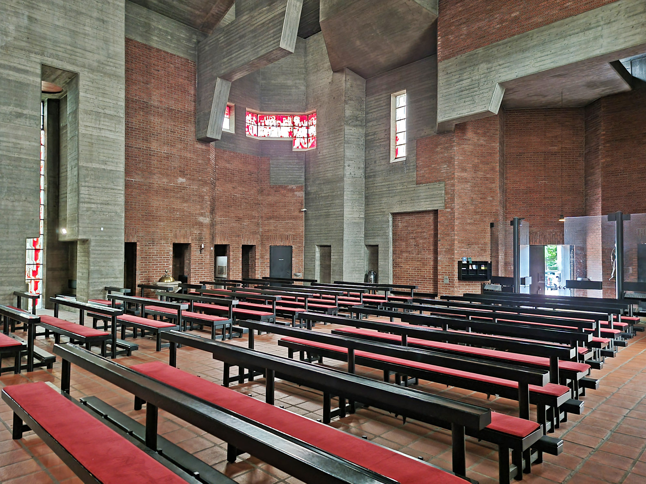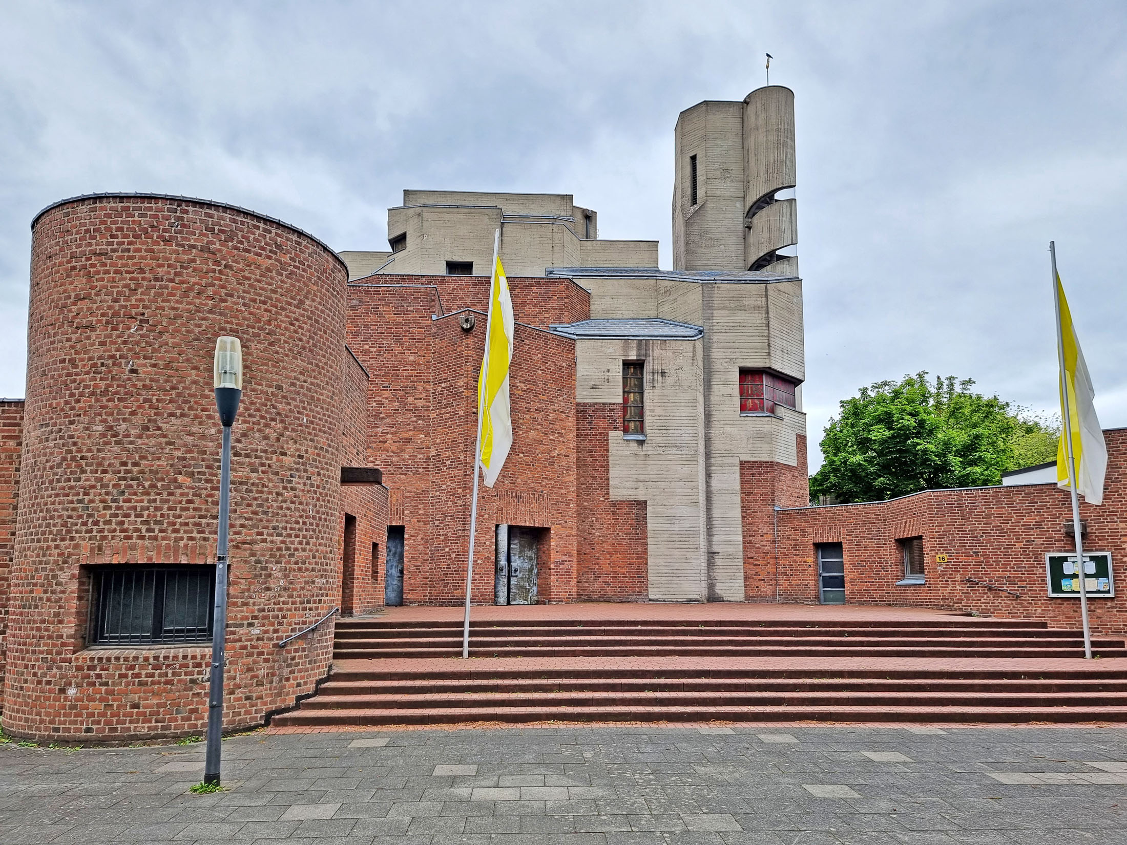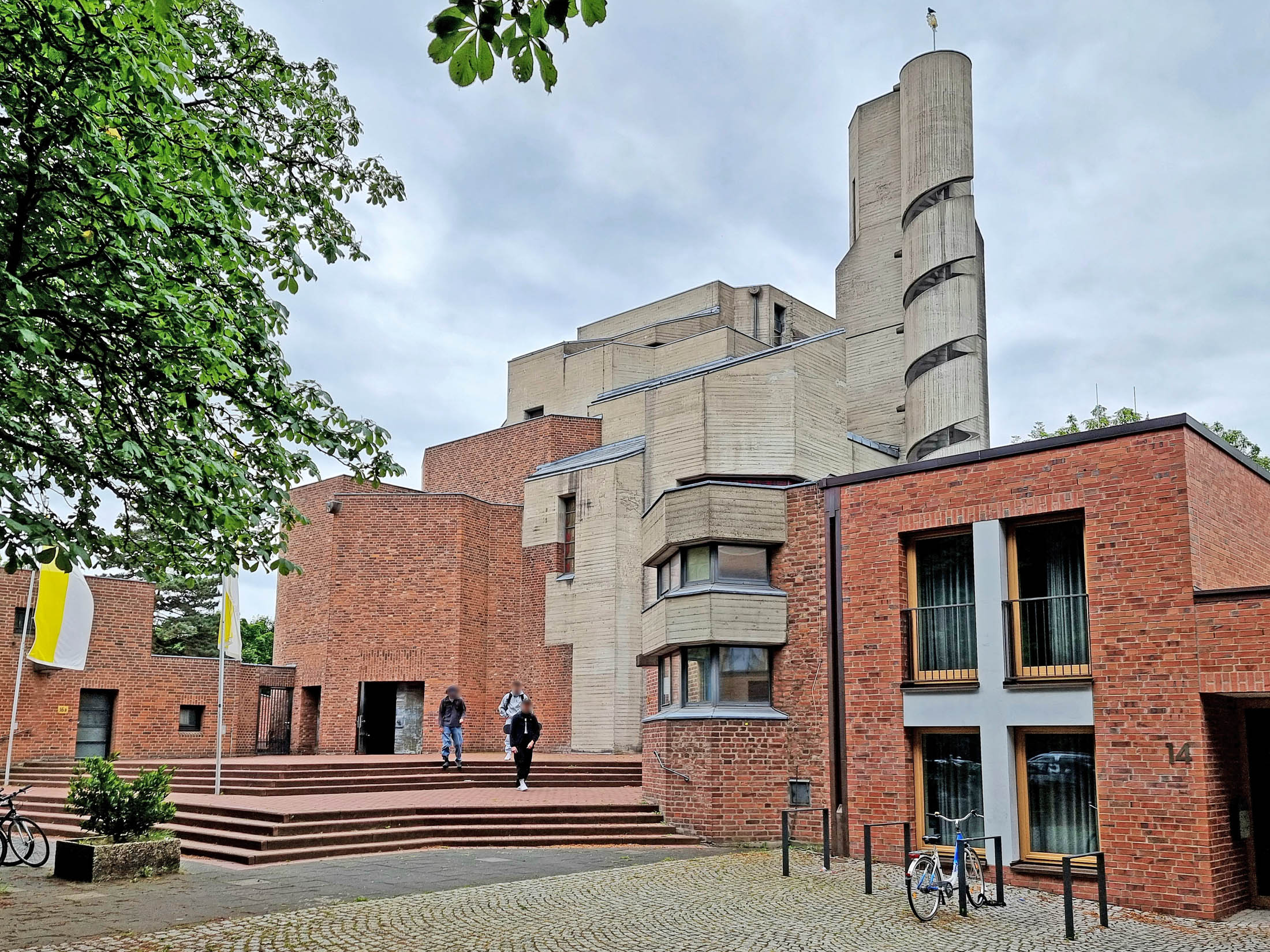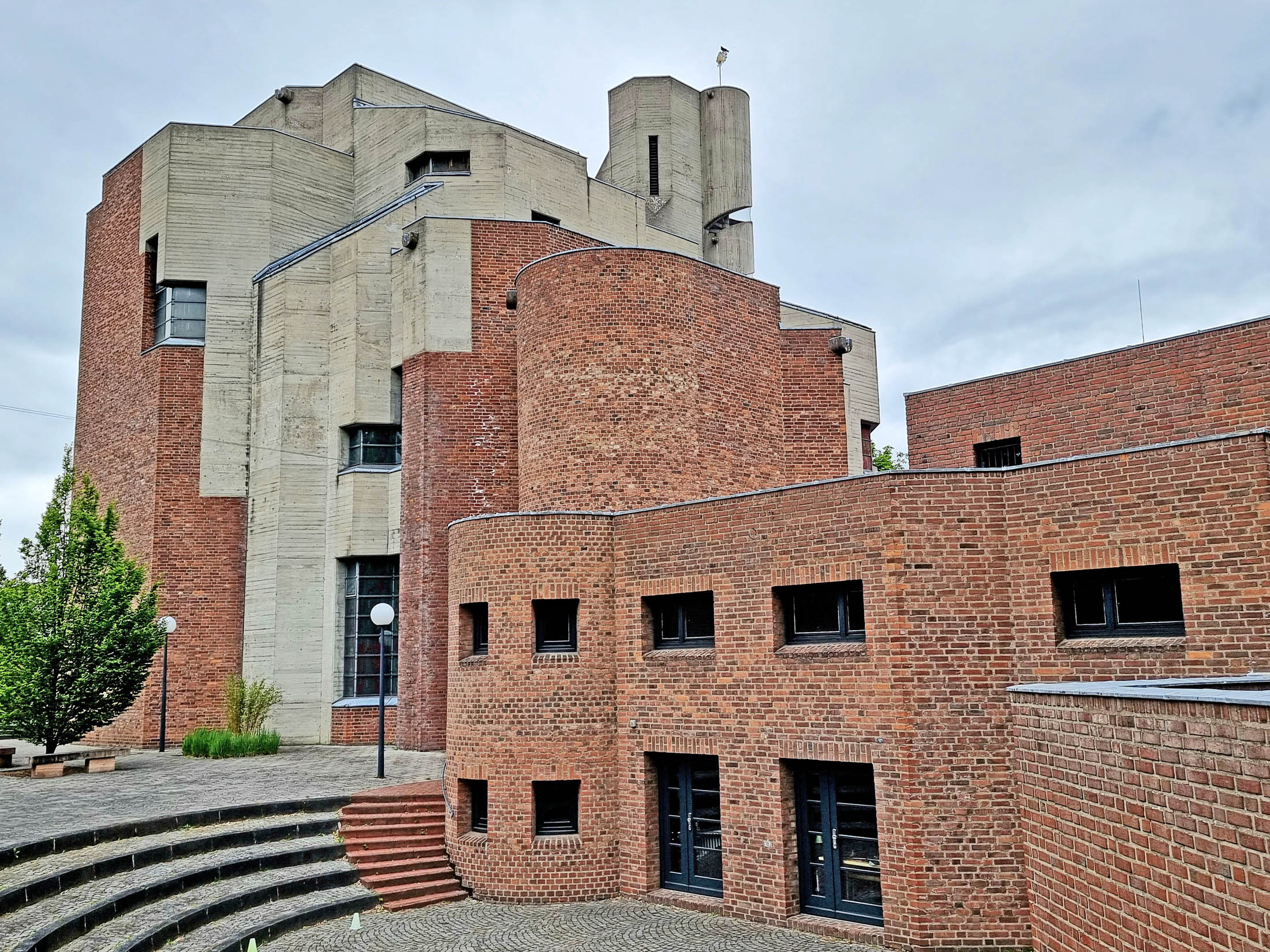 Bilder oben: die von Gottfried Böhm erbaute Kirche Christi Auferstehung mit begleitenden Pfarrbauten.