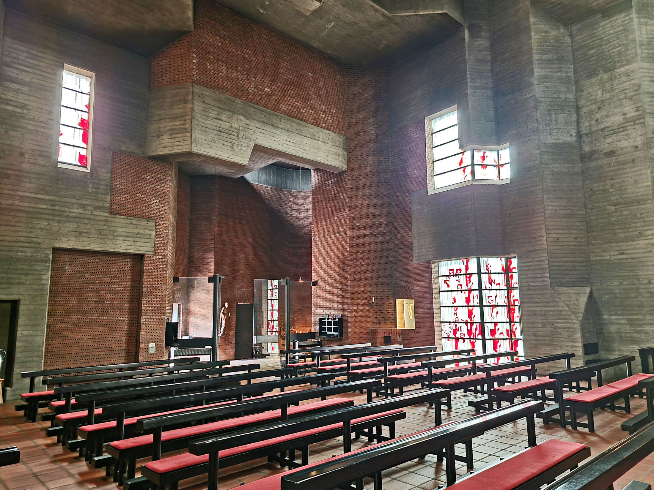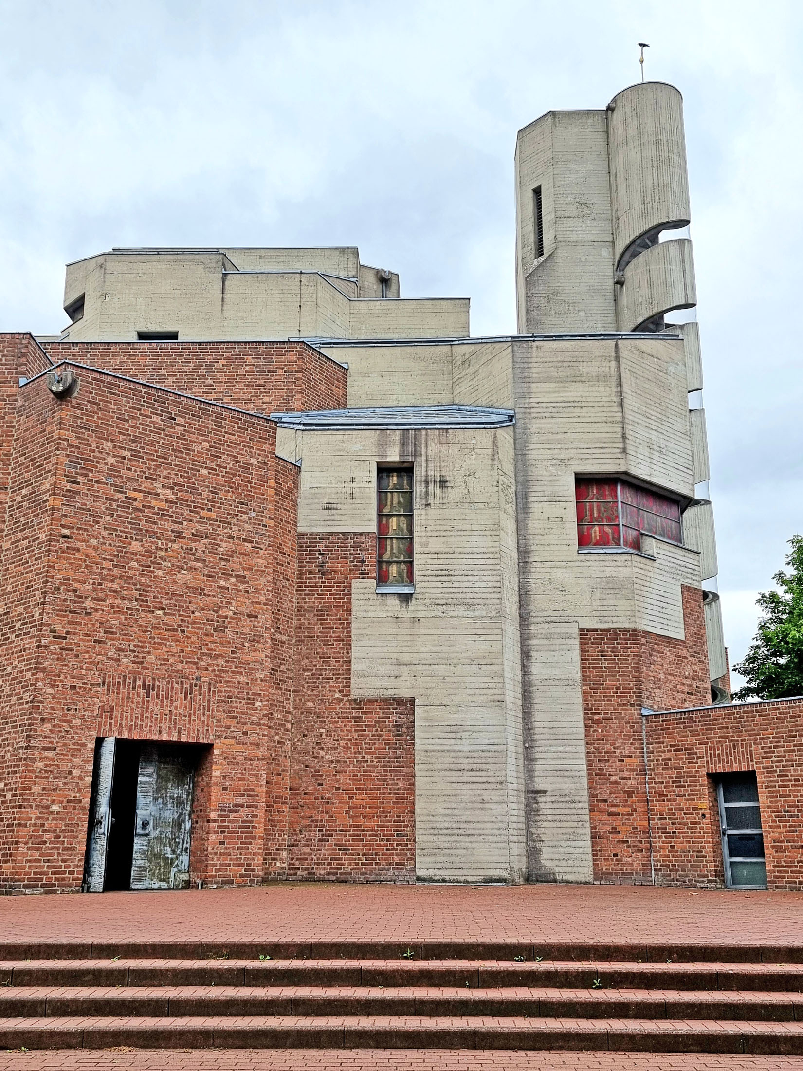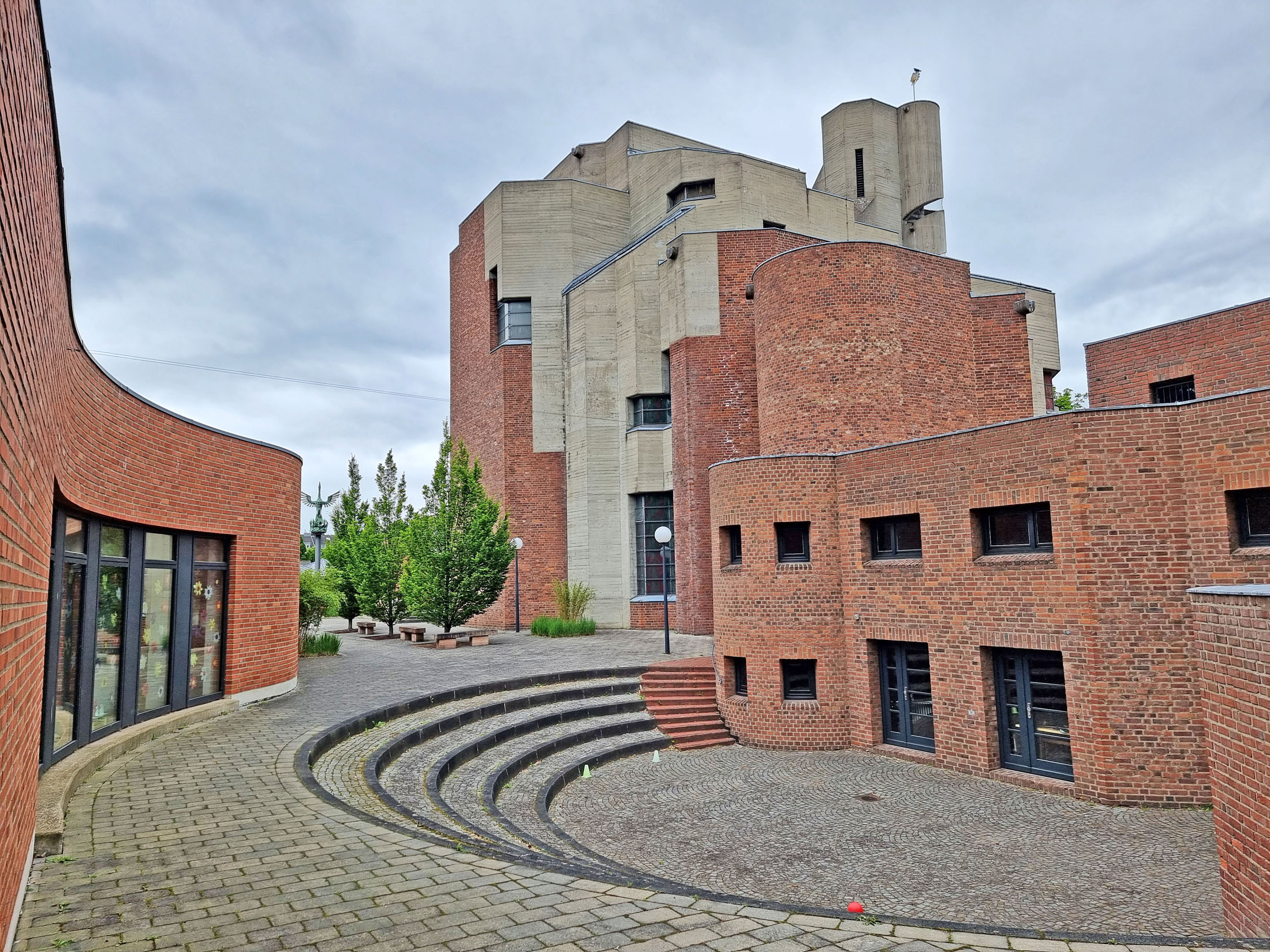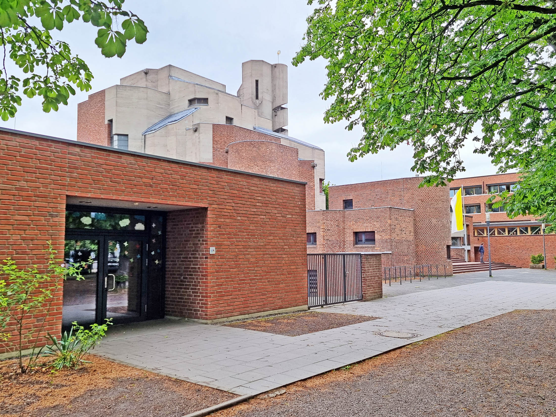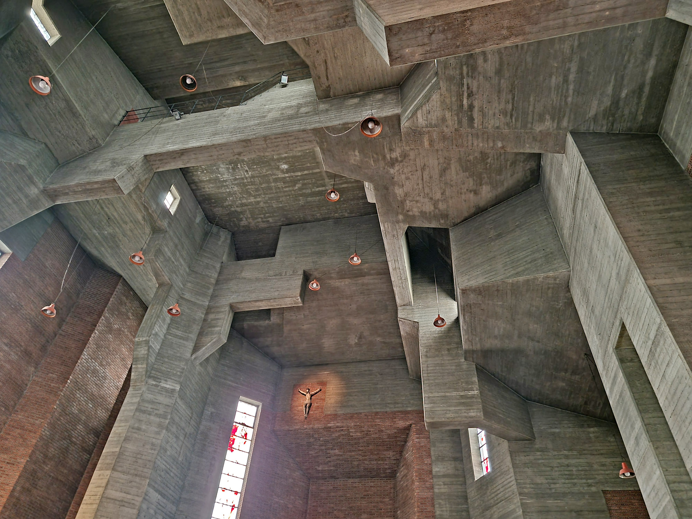 Bilder oben: die von Gottfried Böhm erbaute Kirche Christi Auferstehung mit begleitenden Pfarrbauten.