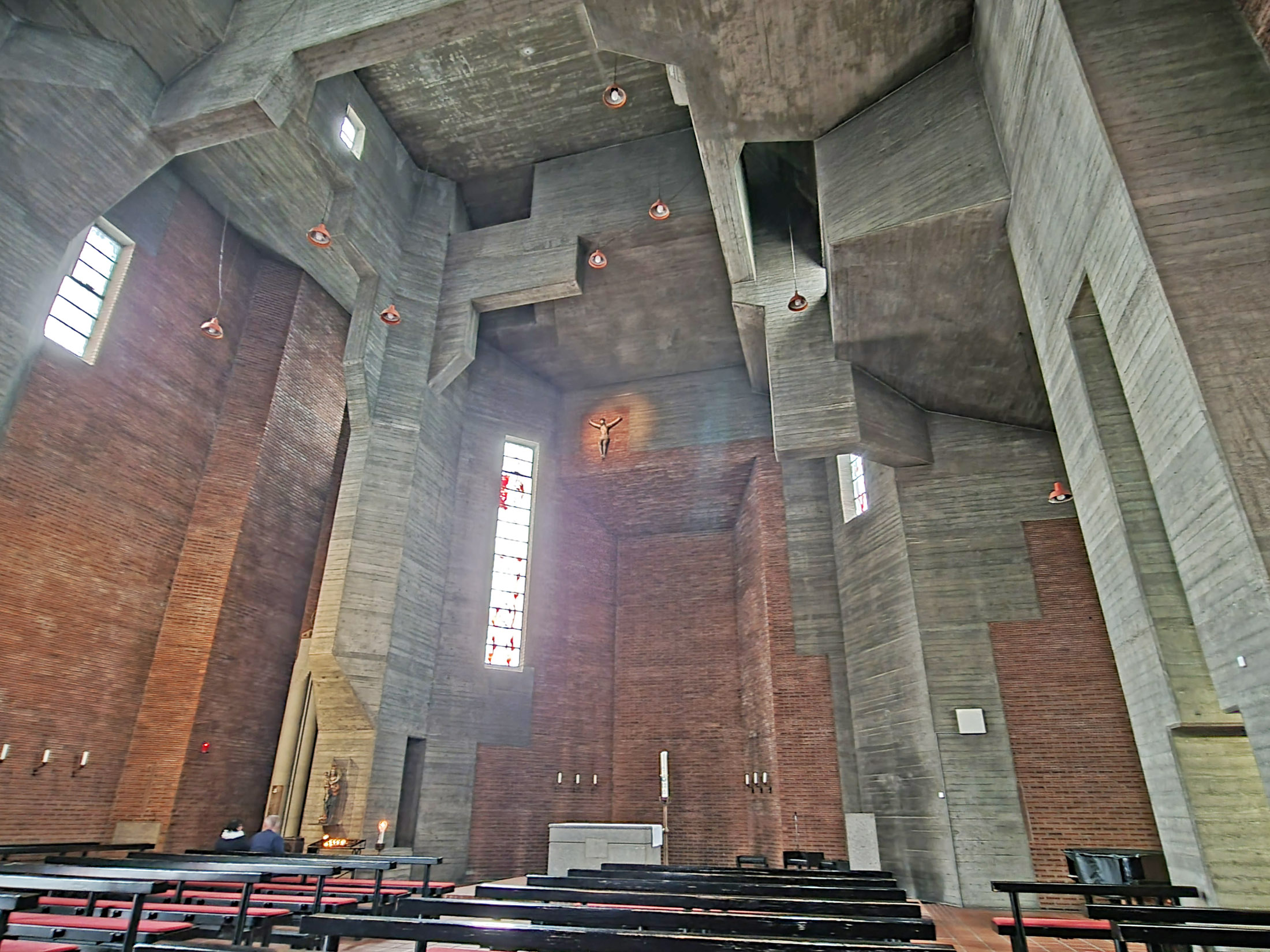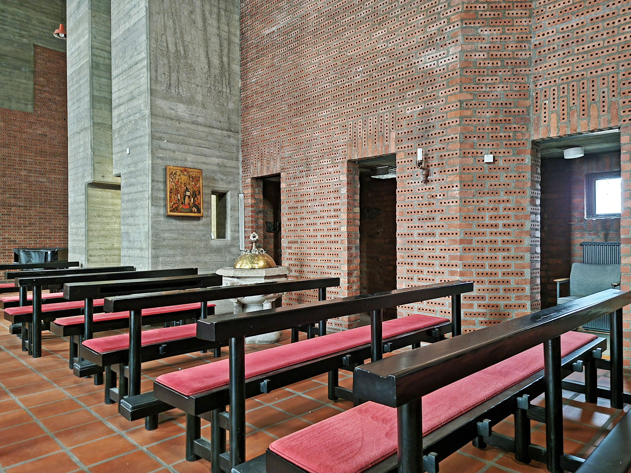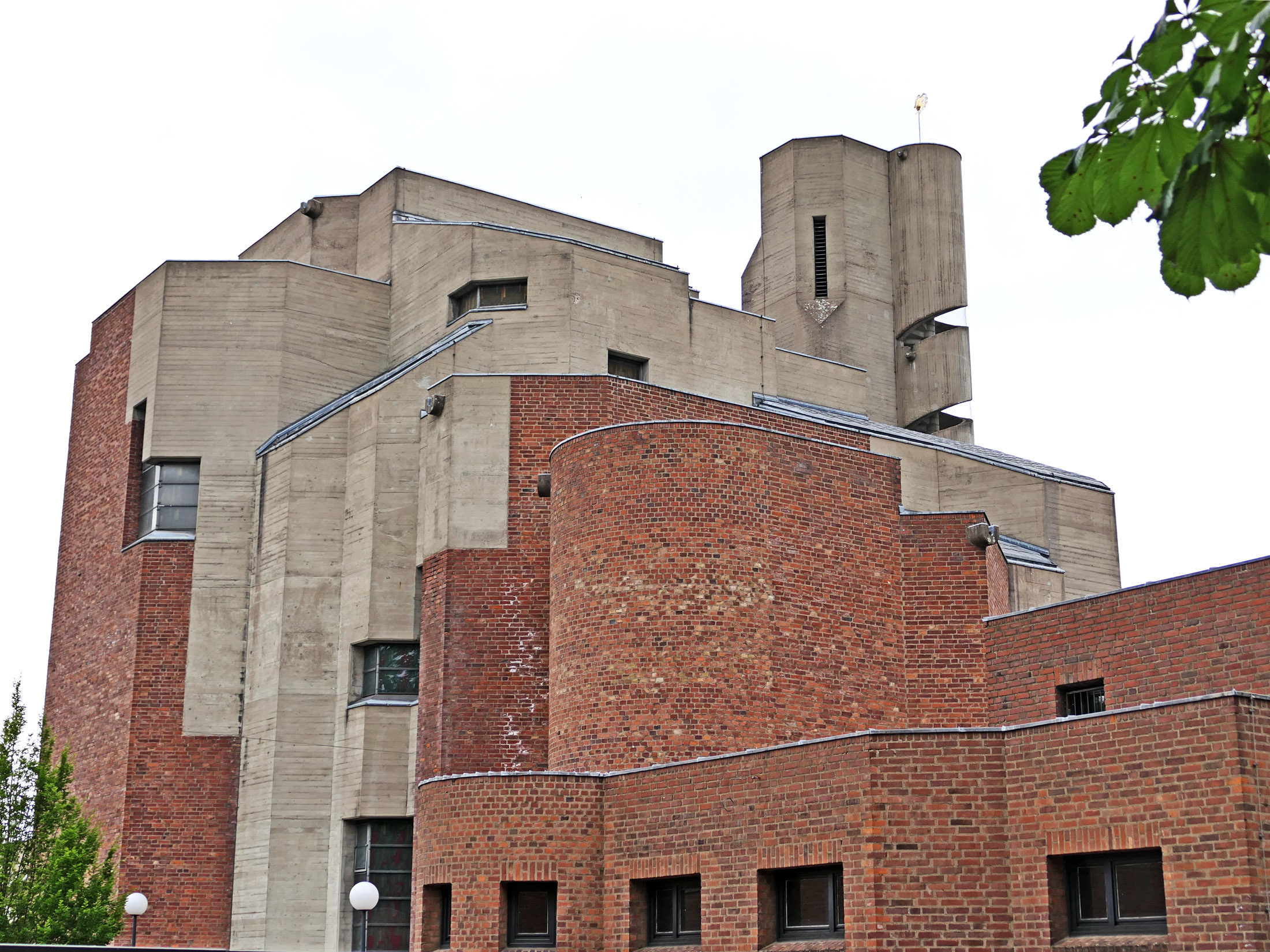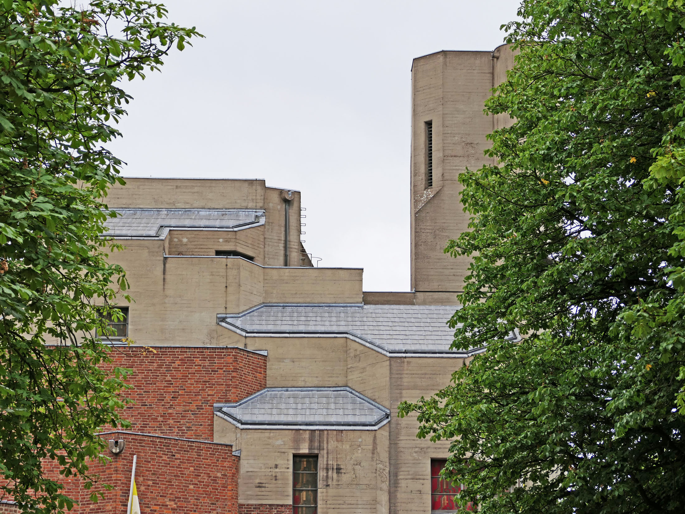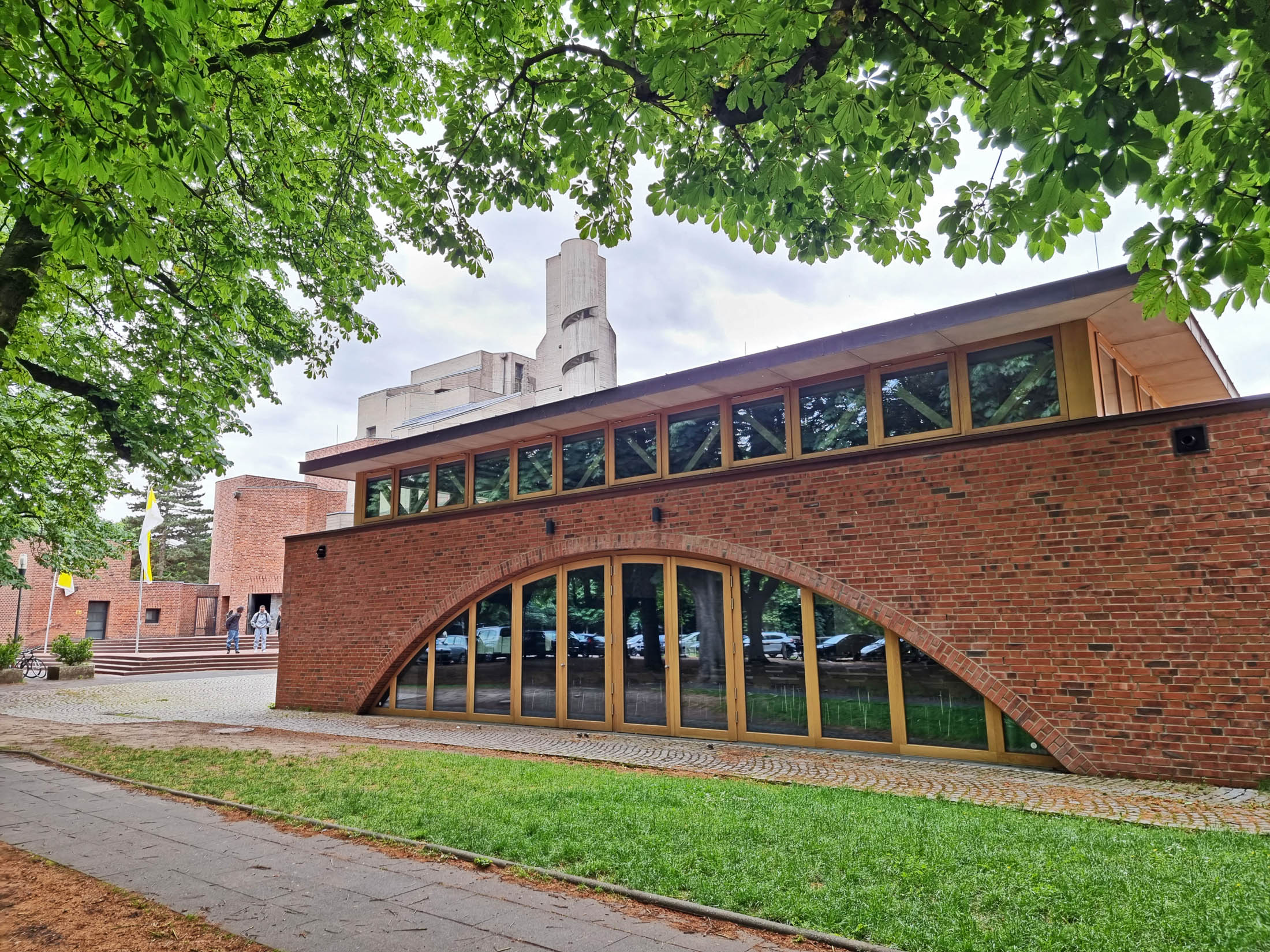 Bilder oben: die von Gottfried Böhm erbaute Kirche Christi Auferstehung mit begleitenden Pfarrbauten.