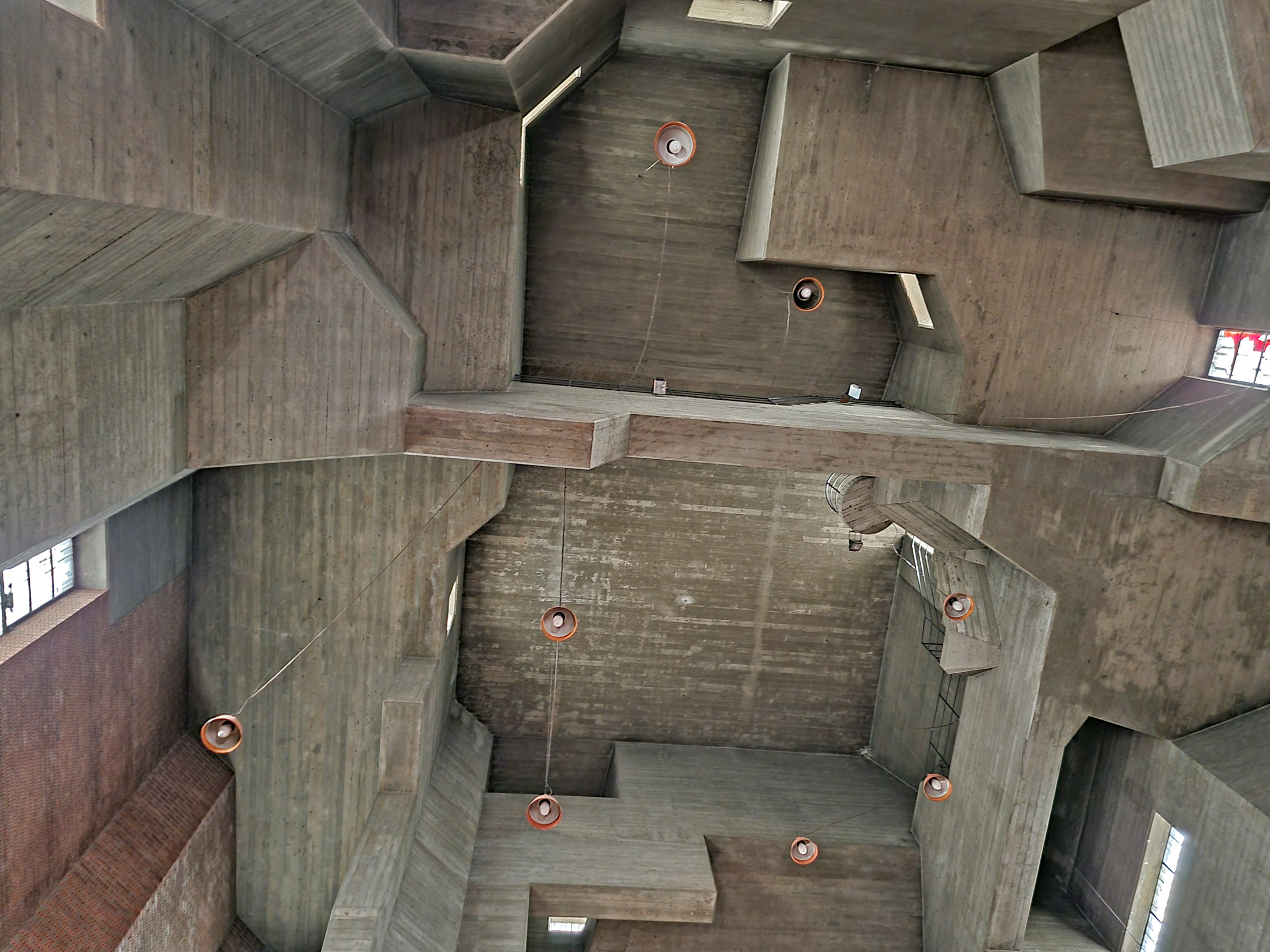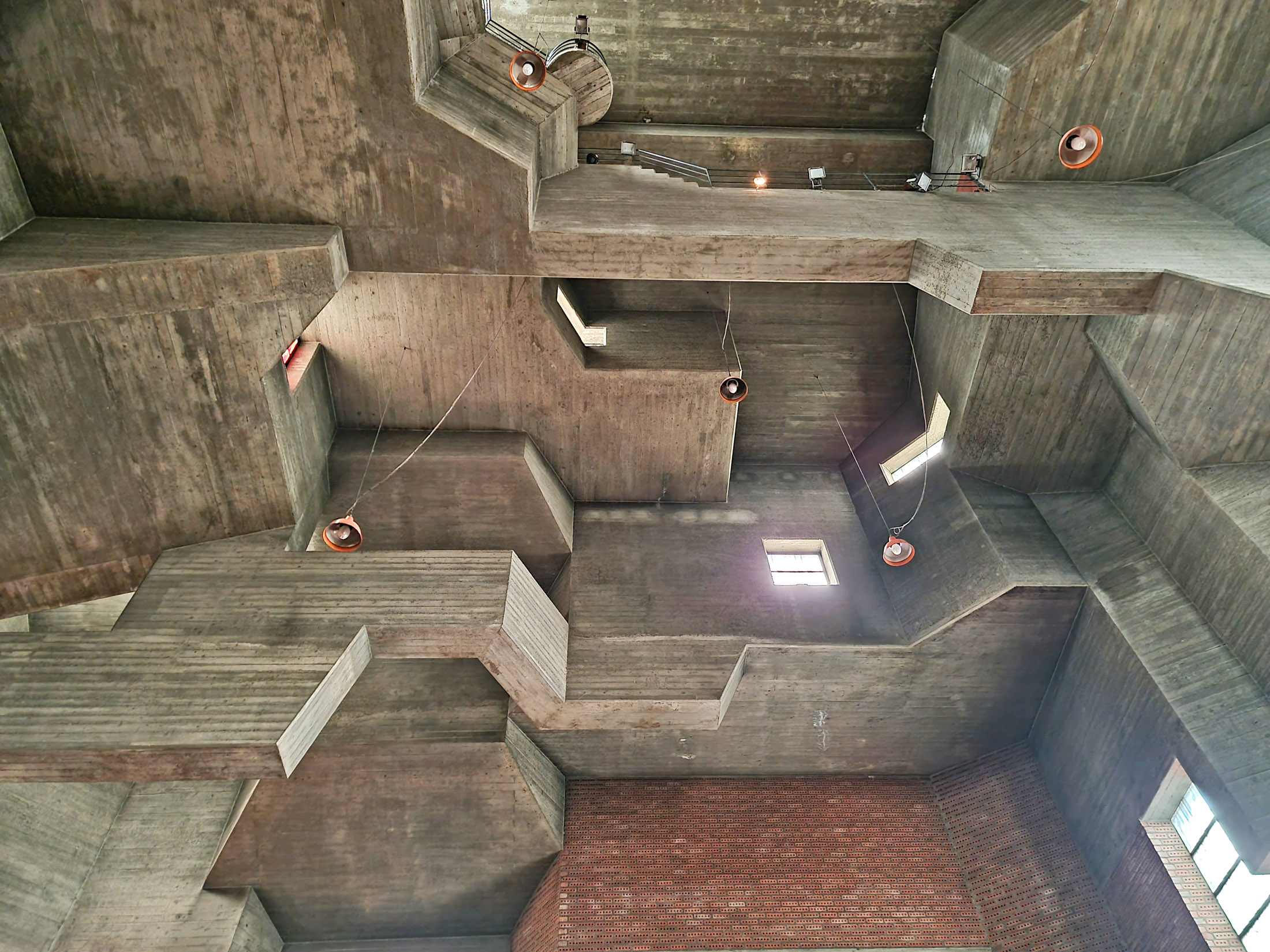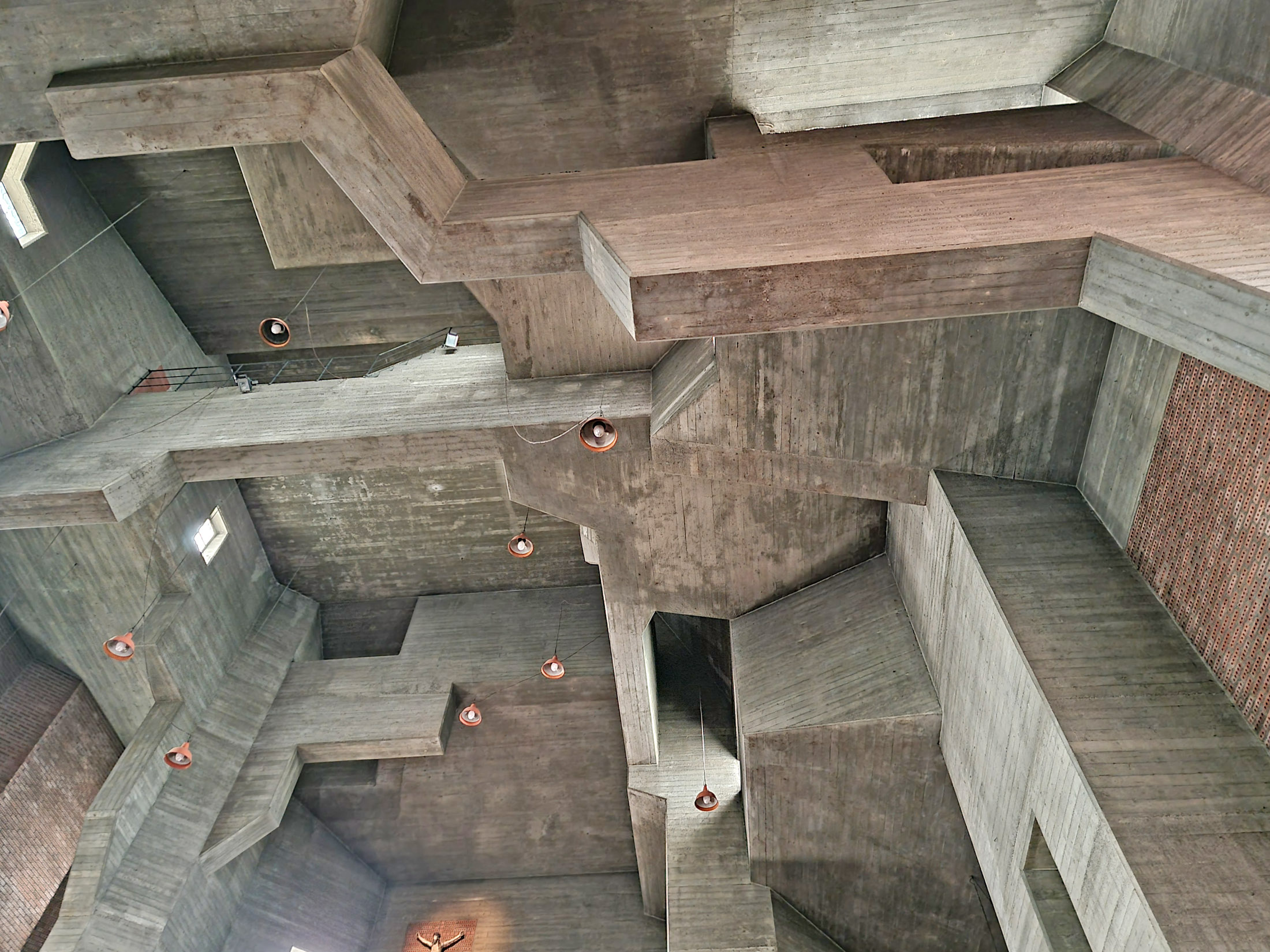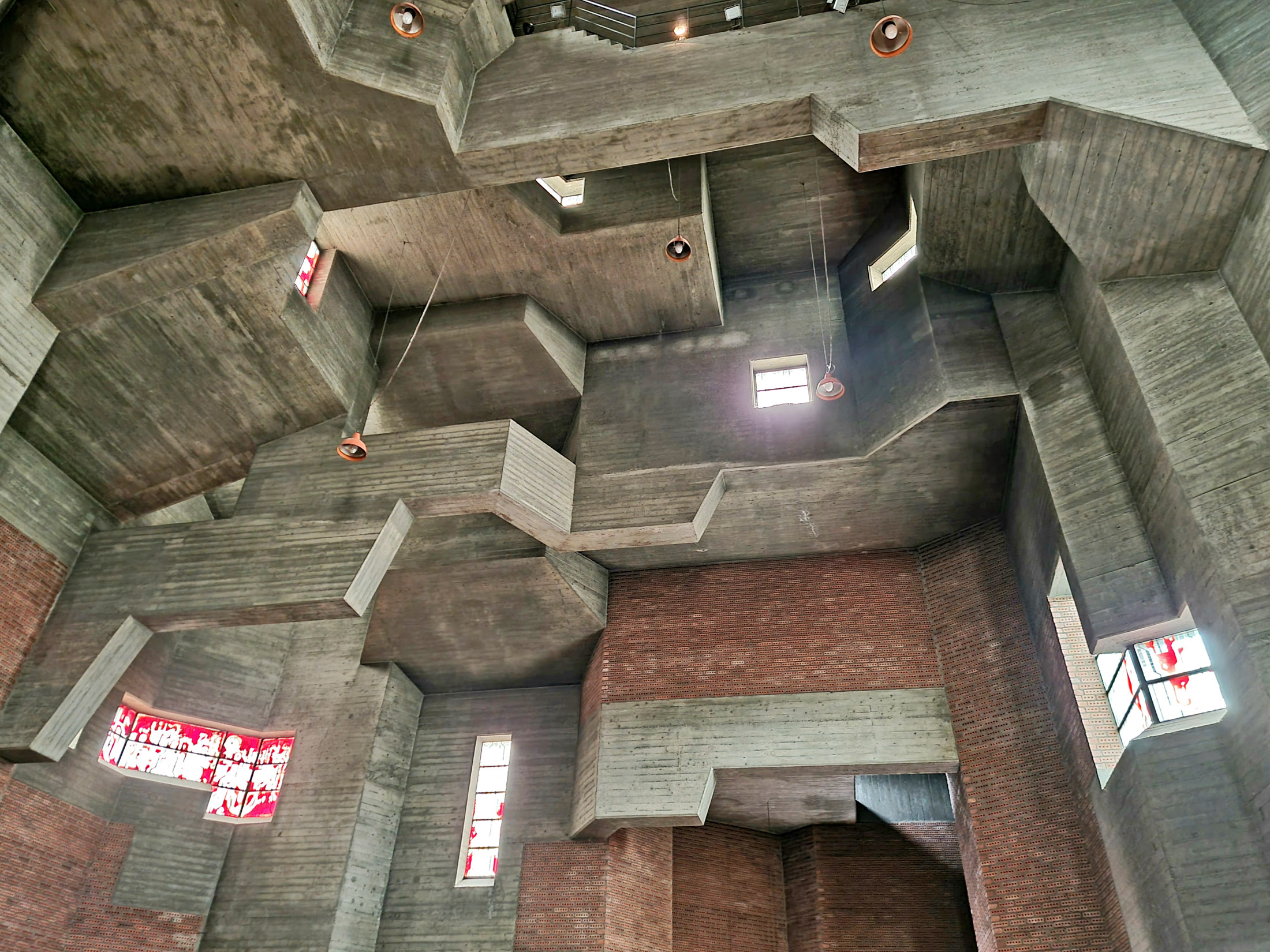Bilder oben: die Deckenkonstruktion des Kirchenraums; man fühlt sich ein bisschen wie in einer Höhle.