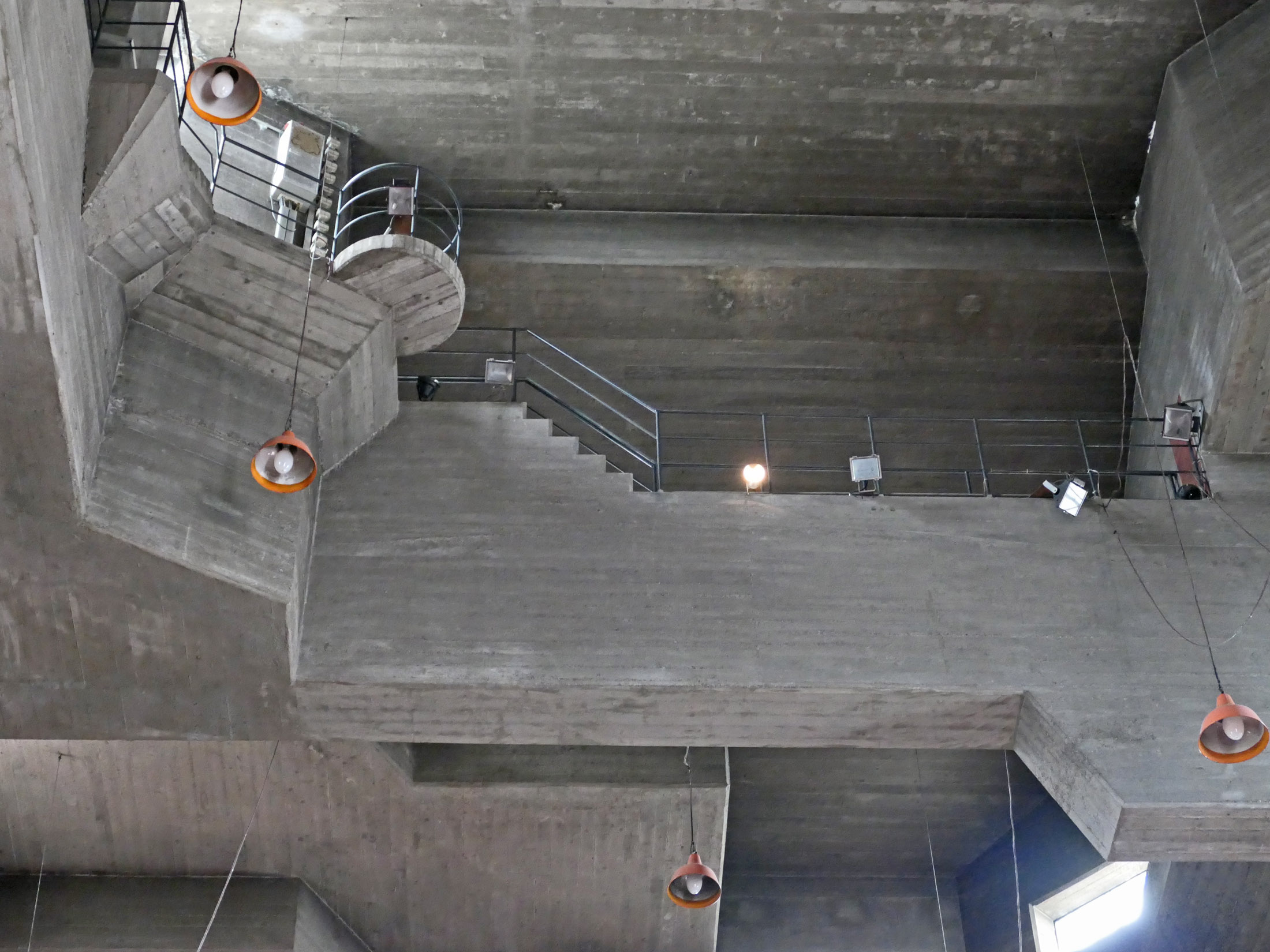 „Der Innenraum erscheint noch stärker plastisch gestaltet, auch hier prägen Ziegel und Sichtbeton die Materialität, wobei sich der Beton an mehreren Stellen pfeilerartig vom Boden bis zur Decke emporzieht und dort ein unregelmäßiges ‚Gewölbe‘system aus kräftigen Unterzügen und Stegen bildet. Dazwischen bestehen die Ziegelmauern aus liegend vermauerten Steinen, deren Lochung zum Raum zeigt. (…)