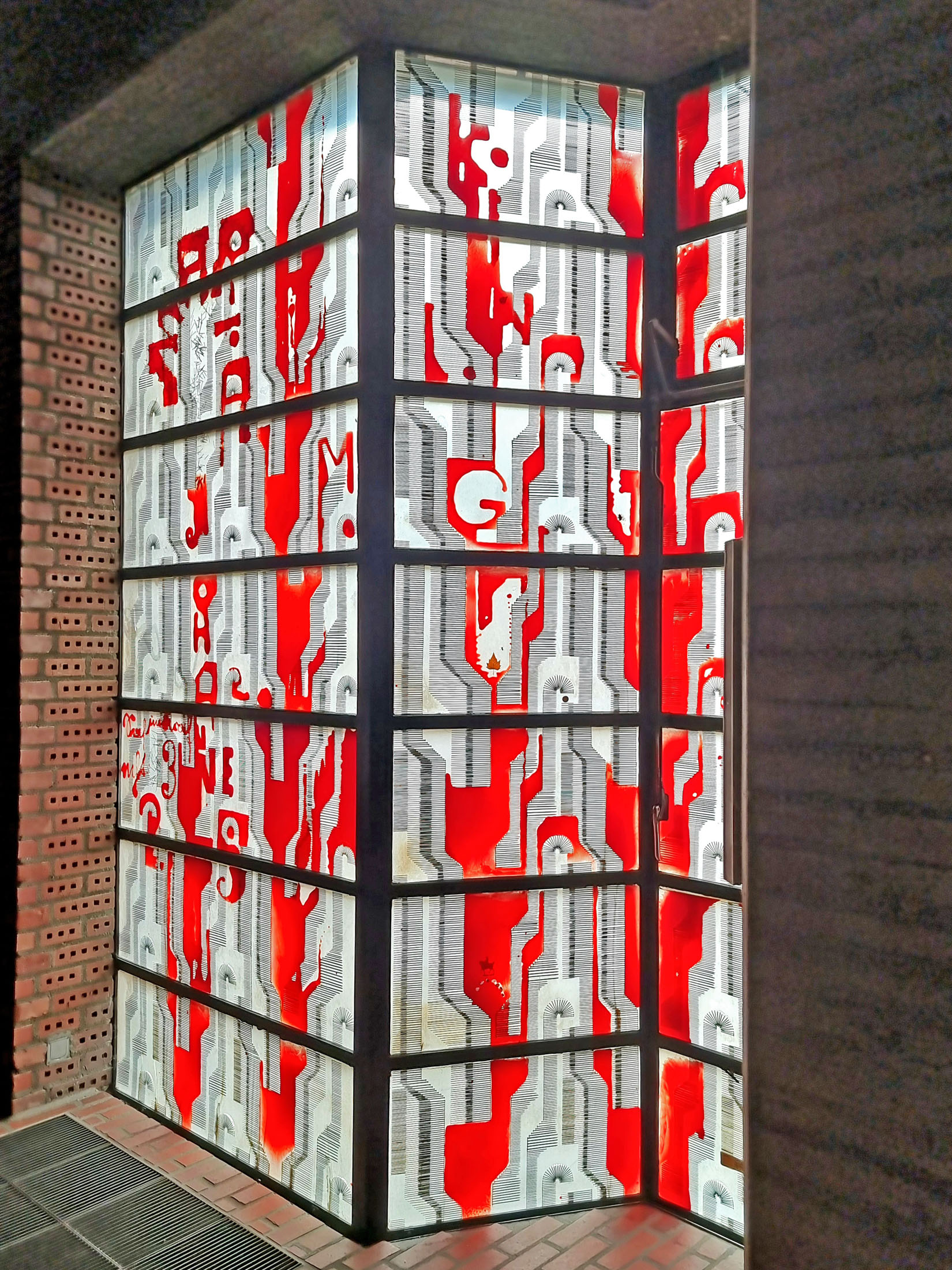 Die ungewöhnlichen, von Böhm gestalteten Fenster bestehen aus opakem Kunststoff, in den u.a. Muster aus Nägeln und roter Farbe eingegossen wurden. Der links der Altarapsis in einer schmalen Nische stehende, hochaufragende Tabernakel aus hellem Tuff wurde 1984 von Karl Matthäus Winter geschaffen. Die Entwürfe für Altar, Ambo und Orgelprospekt stammen aus dem Büro Böhm.“