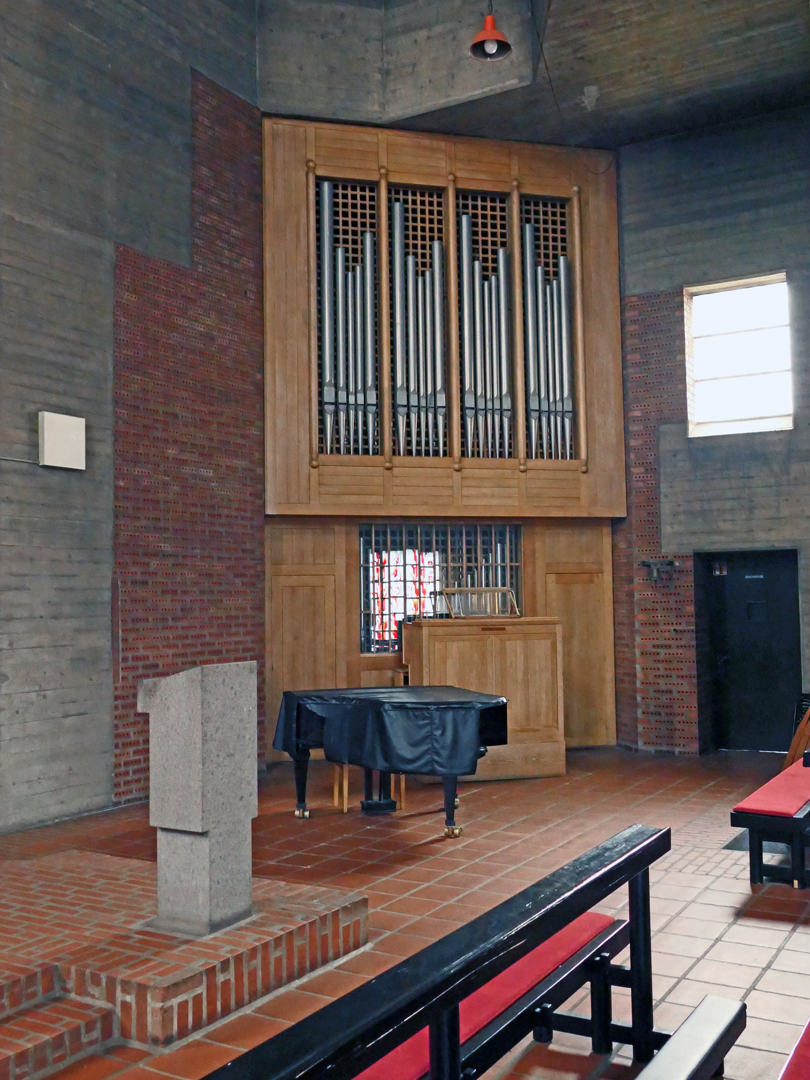 Bilder oben: die Orgel ist in eine Nische des polygonalen Innenraumes eingebaut; letztes Bild: eines der Glasfenster.