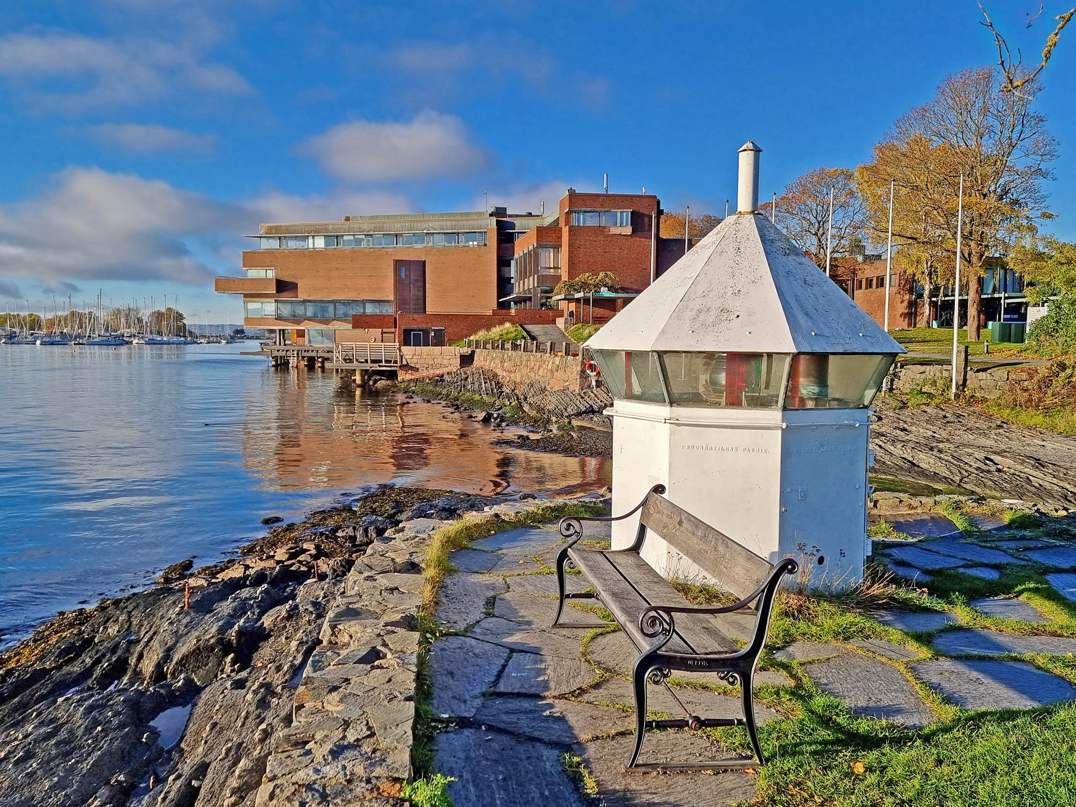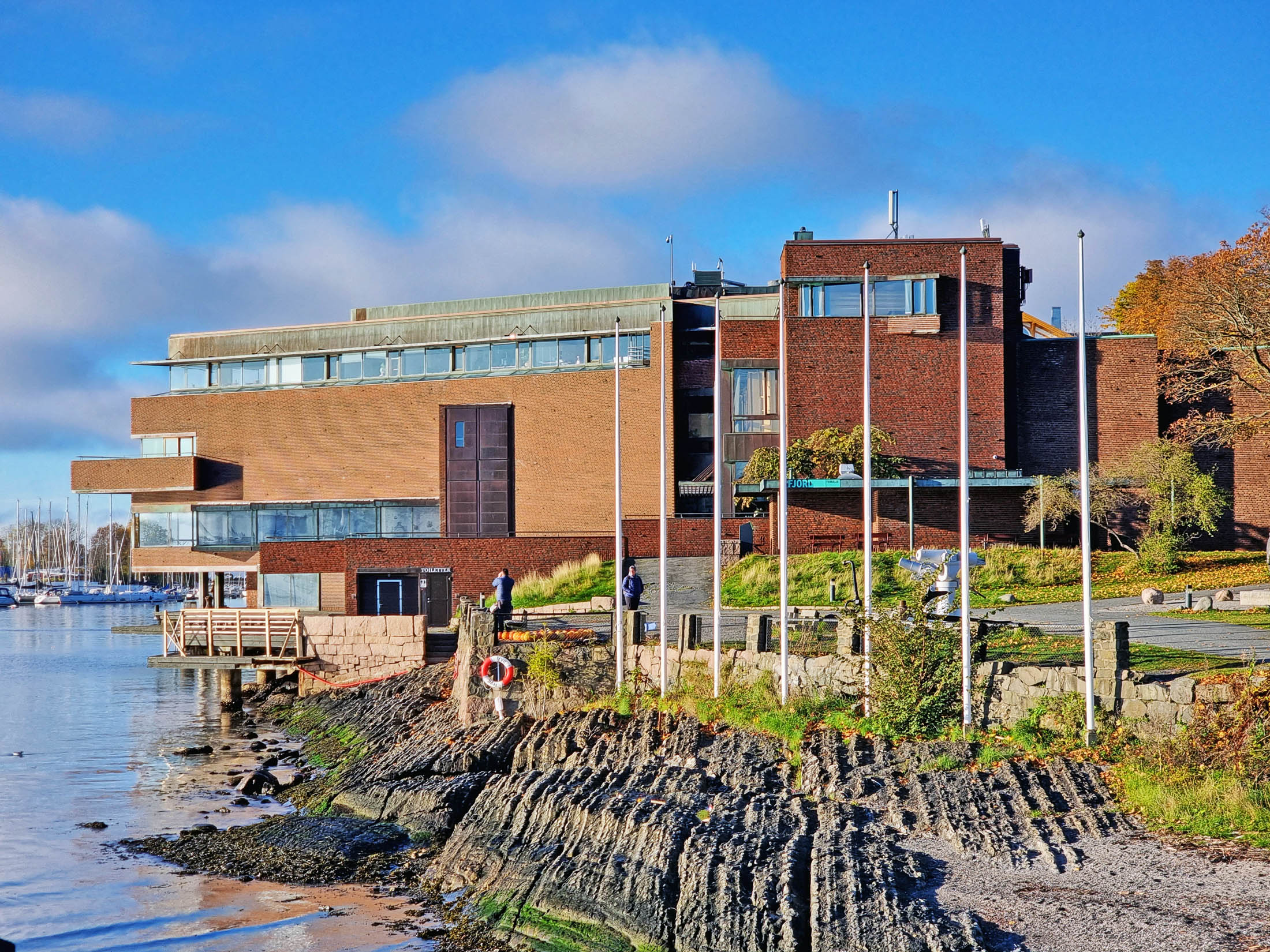 Bilder oben: Umgebung des Seefahrts-Museums; das Museumsgebäude liegt direkt am Fjord; vom Uferweg und der Promenade am Gebäude entlang kann man auf die Inseln im Fjord und zur Stadt hinübersehen.