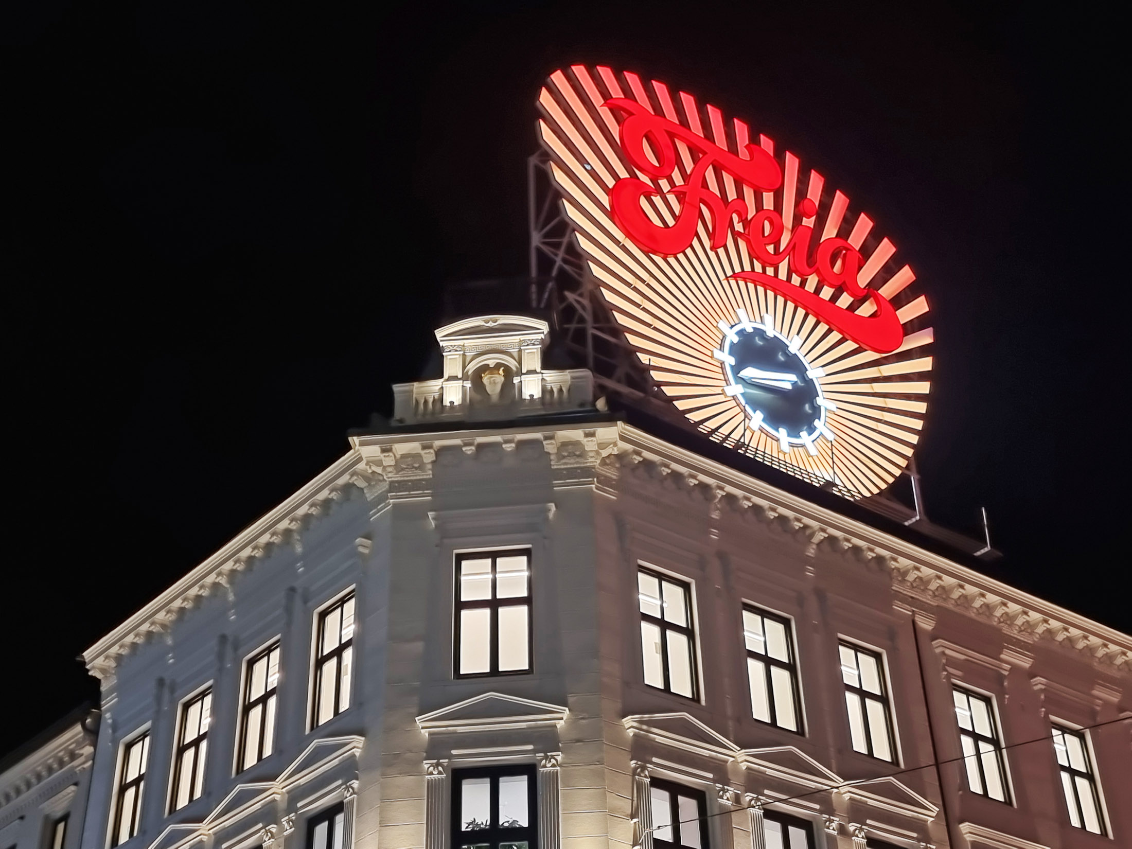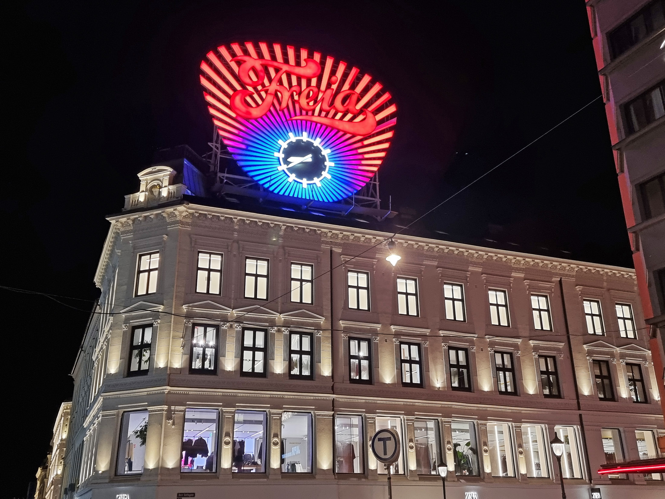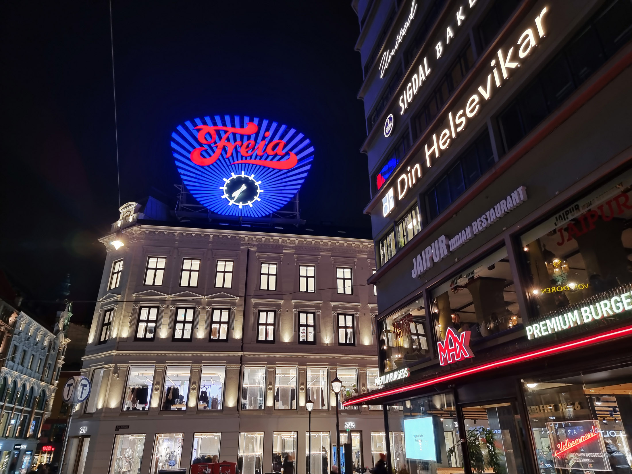 Bilder oben: auf einem Gebäude schräg gegenüber dem Horngården-Gebäude an der Kreuzung Karl Johans gate und Øvre Slottsgate befindet sich wohl die bekannteste Werbetafel der Stadt: die „Freia-Uhr“. Sie wurde 1925 aufgestellt und warb für das Unternehmen Freia, welches einige Zeit lang der größte skandinavische Hersteller von Schokolade(produkten) war. Längst ist die Firma von einem großen amerikanischen Lebensmittelkonzern „geschluckt“ worden, doch die Marke und damit auch die Werbetafel (inklusive der Uhr) blieben erhalten.