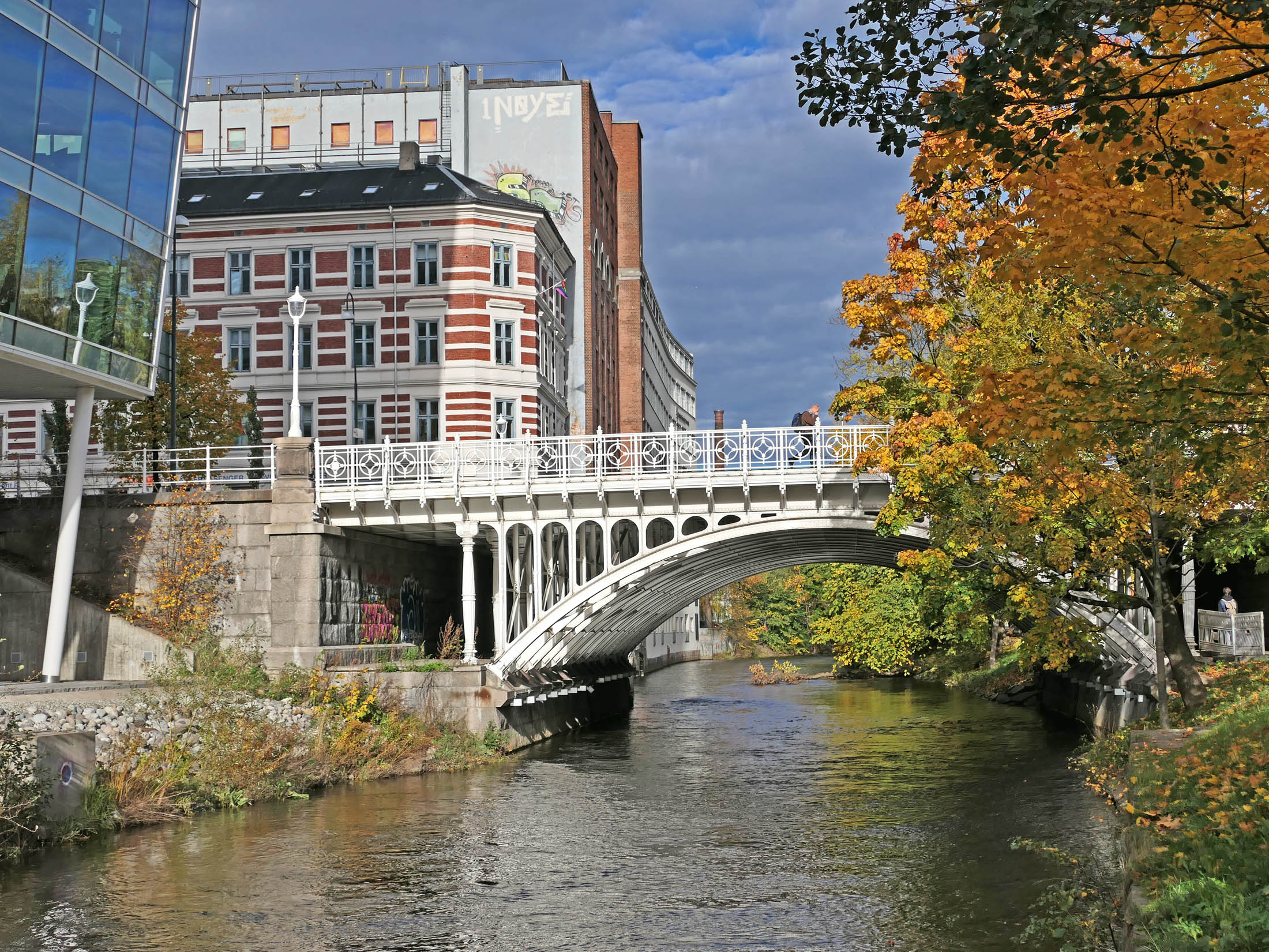 Bild oben: die Hausmann-Brücke (Hausmanns bro) über die Akerselva; im Vordergrund links das Gebäude des Akerselva Atrium.