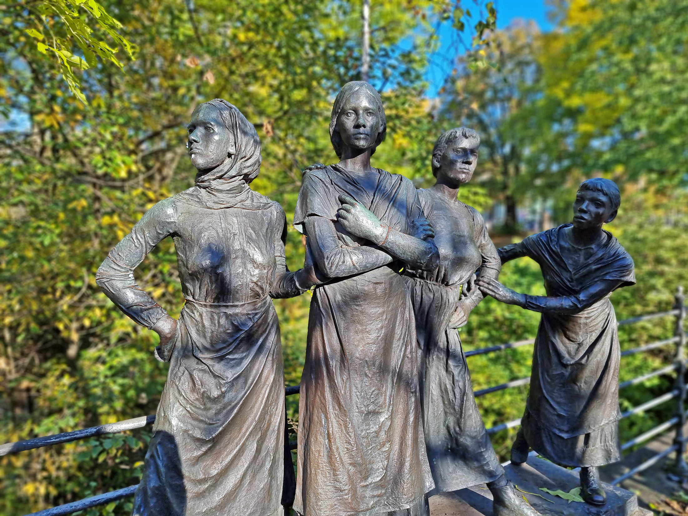Bild oben: den jungen Arbeiterinnen der Textilfabriken wurde auf der über die Akerselva führende Brücke Beierbrua ein Denkmal gesetzt.