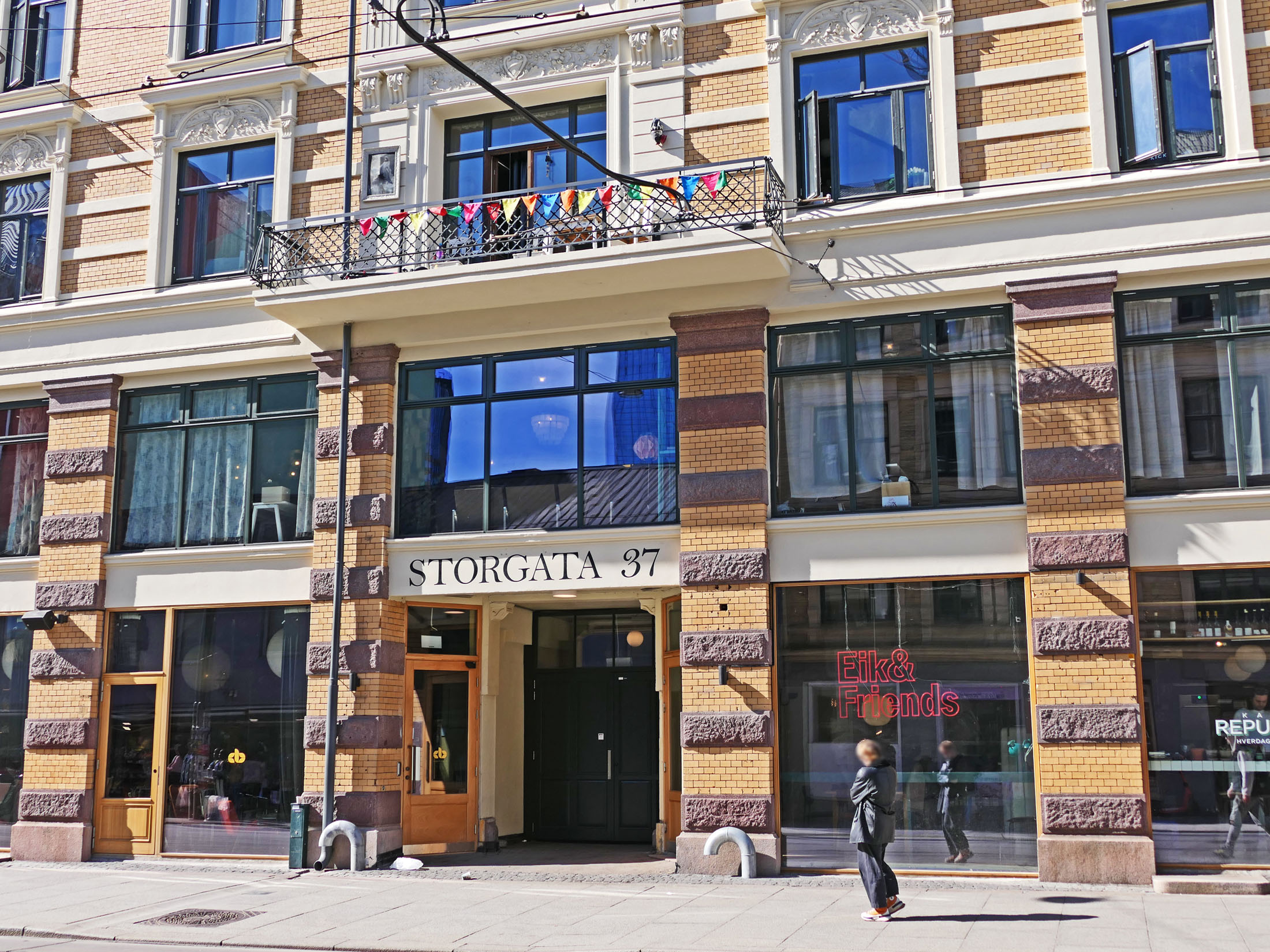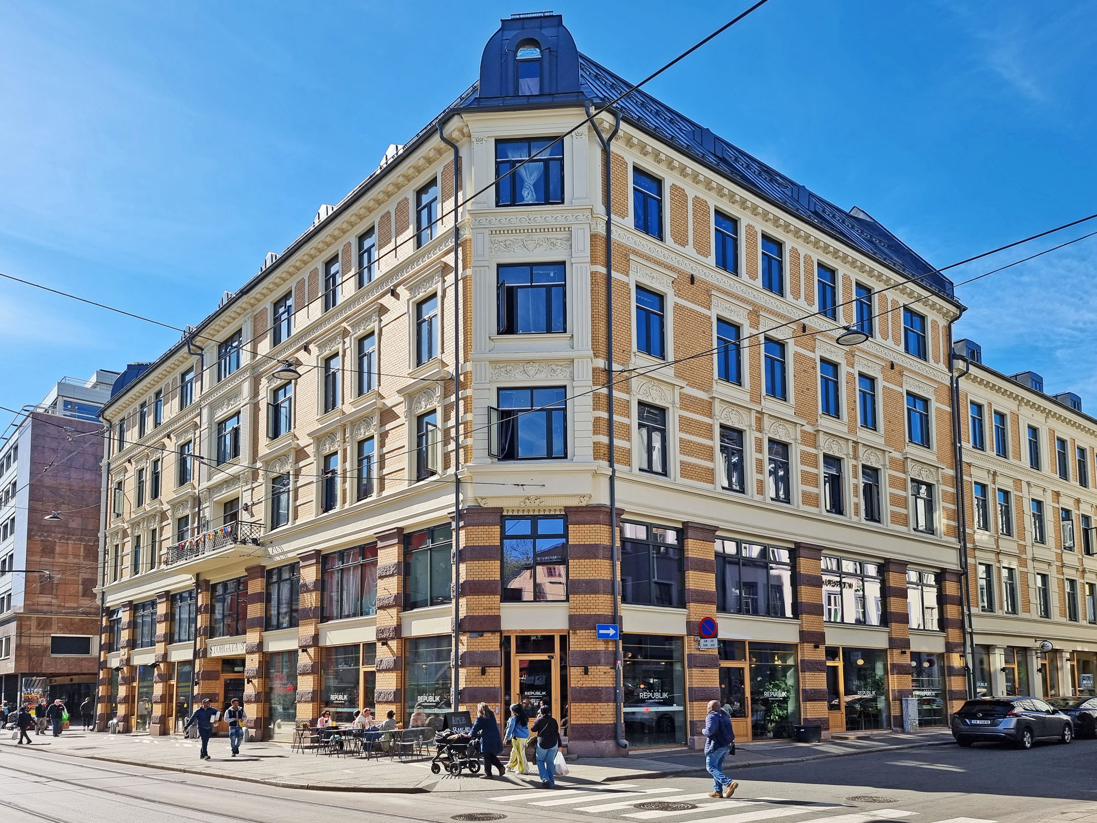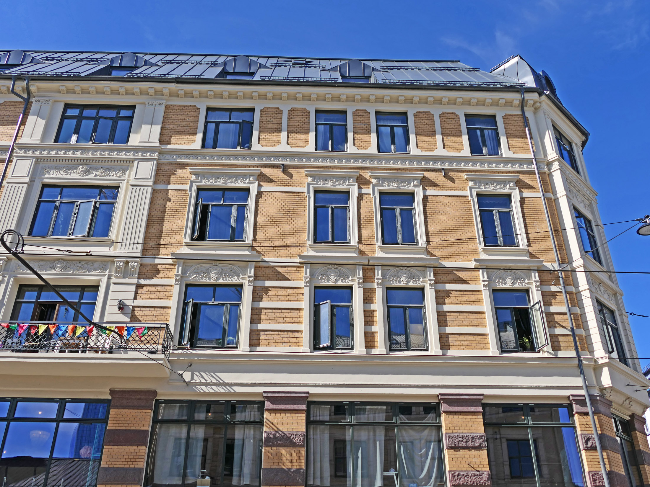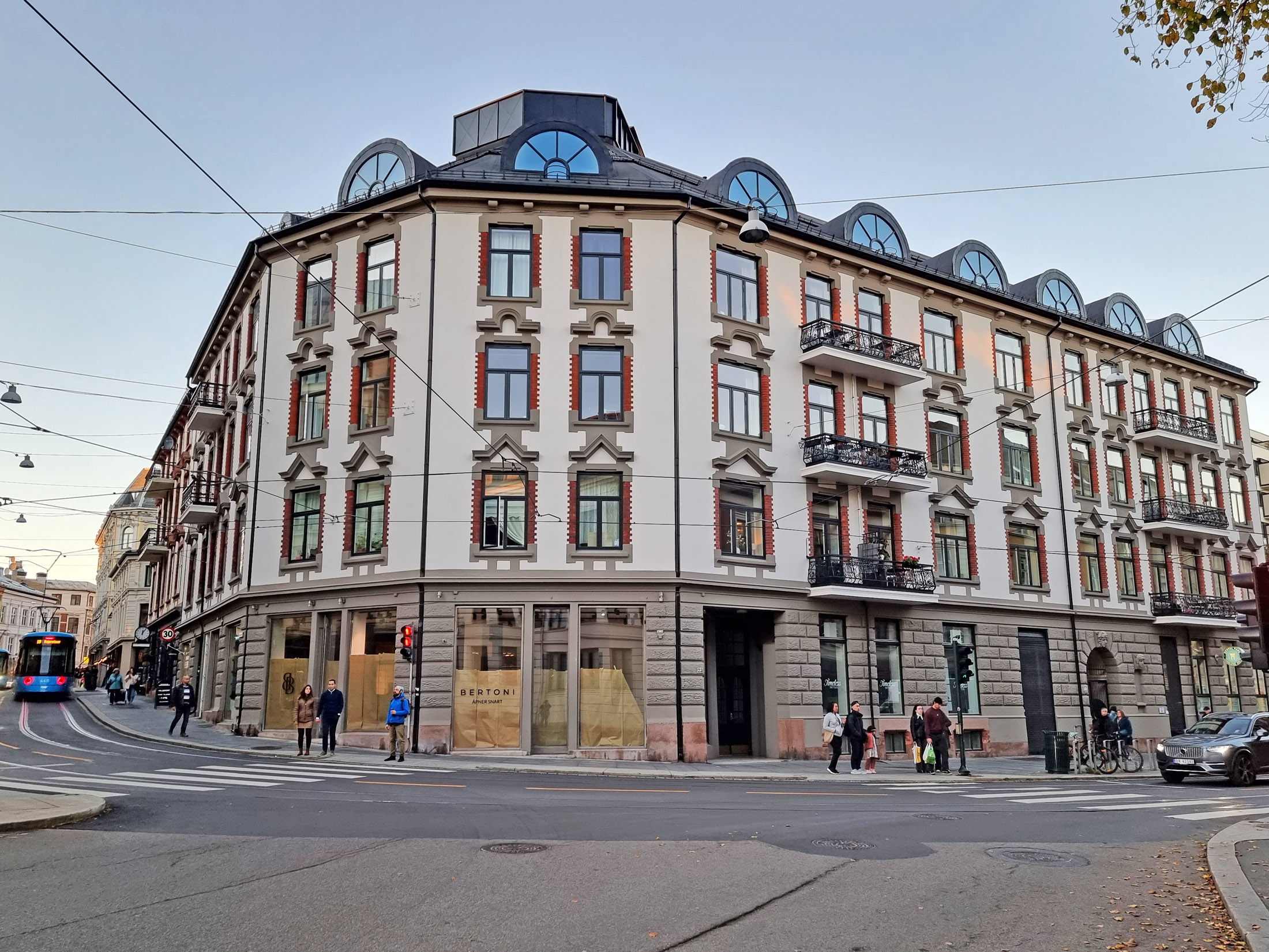 Bilder oben: neu renoviertes Büro- und Geschäftshaus an der Møllergata am Stortorvet (früher Sitz der Kreditkassen).