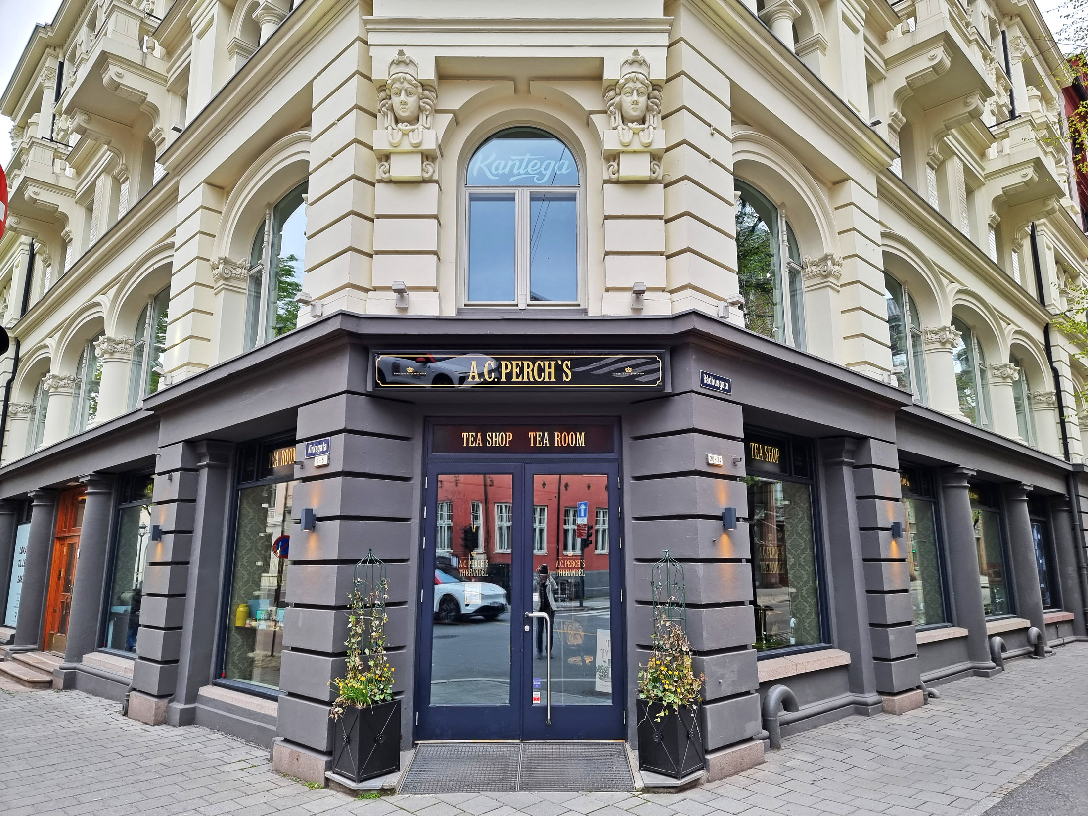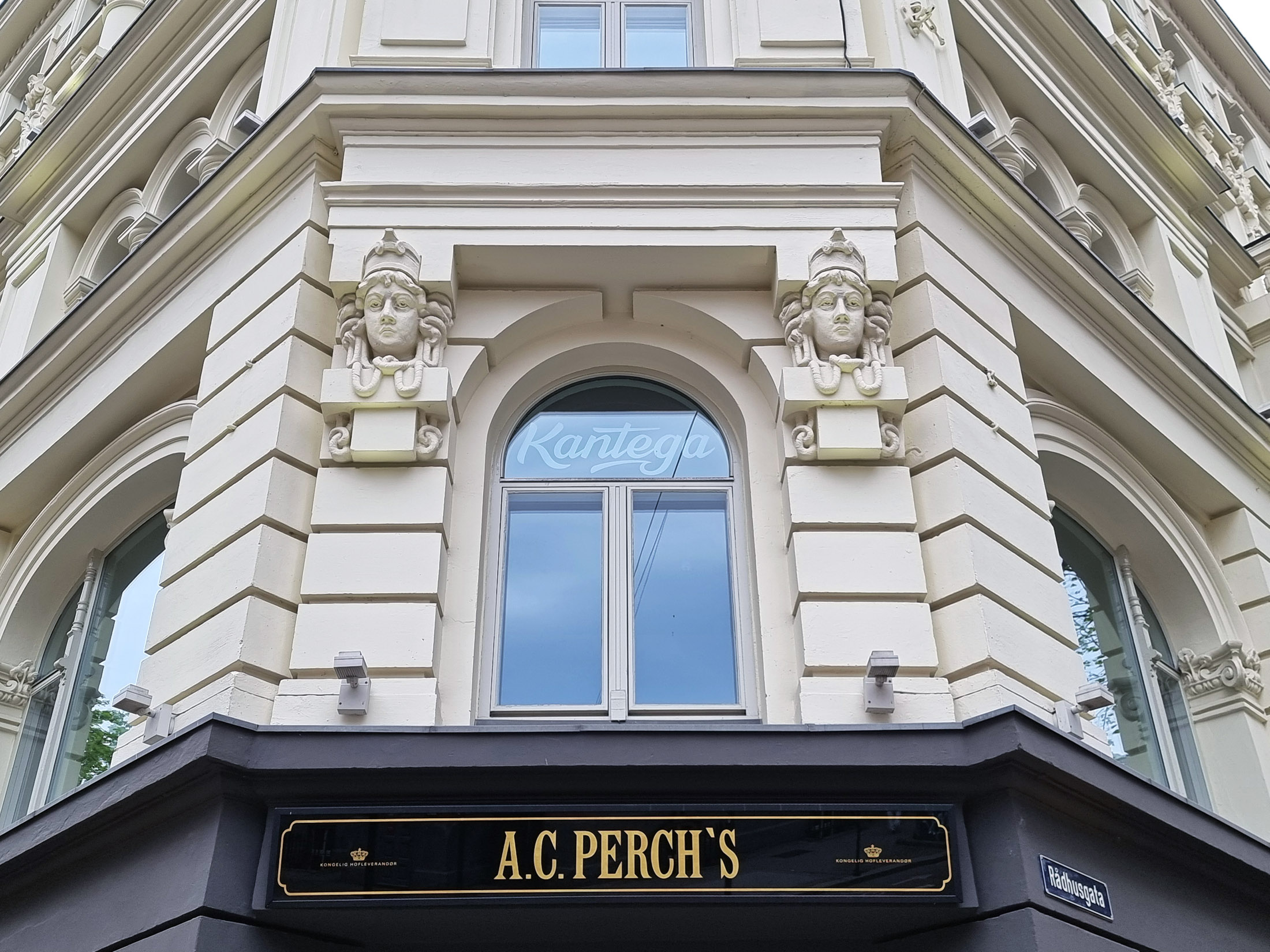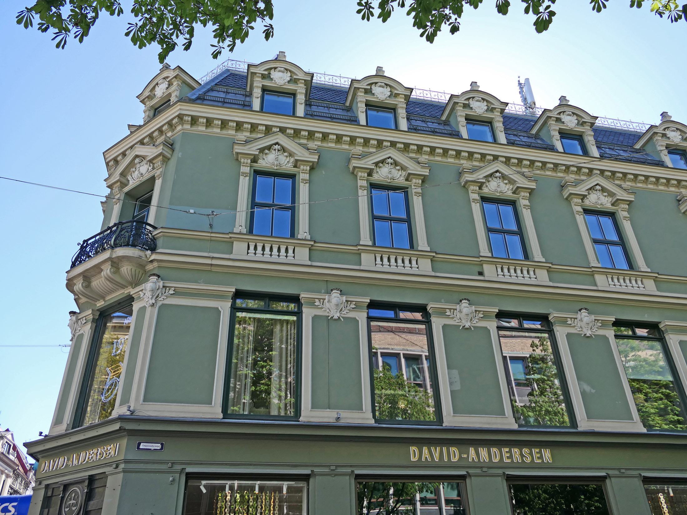 Bilder oben: diagonal gegenüber dem Café Magnat liegt an der Ecke Rådhusgata / Kirkegata ein Jugendstilgebäude mit einem Teehandelsgeschäft.