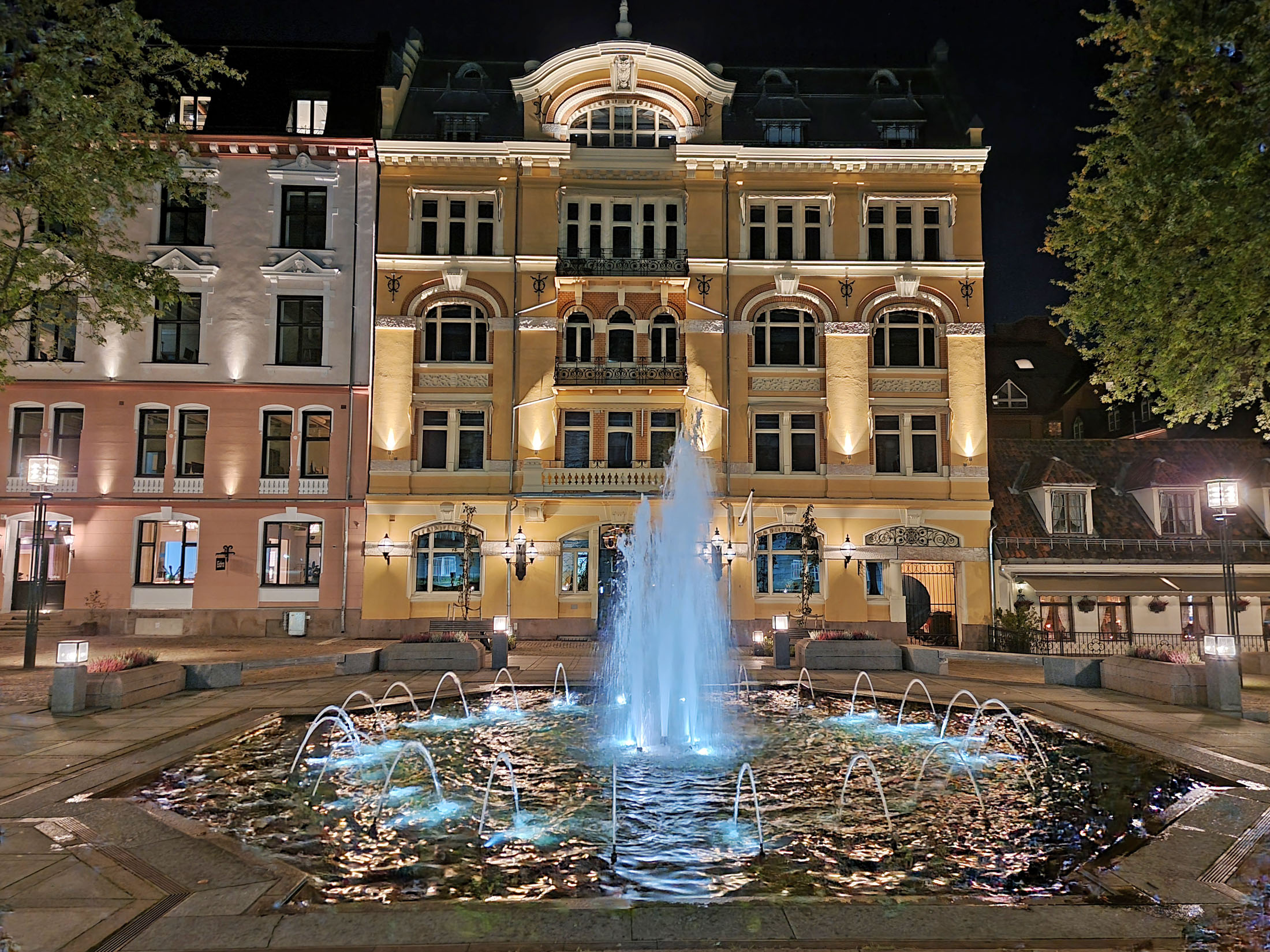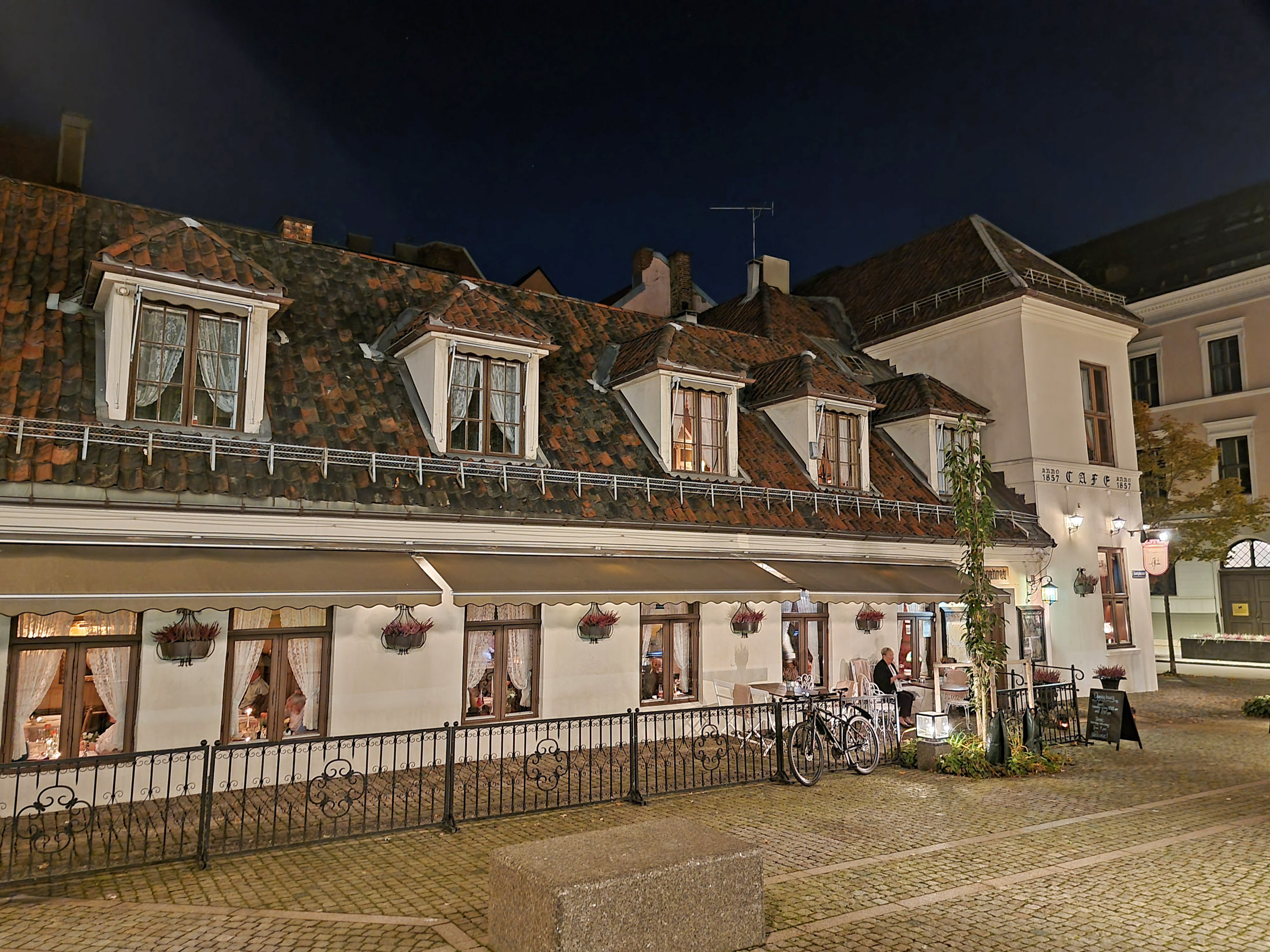 Bilder oben: abendlich beleuchtete Brauerei-Gaststätte an der Nybrua.