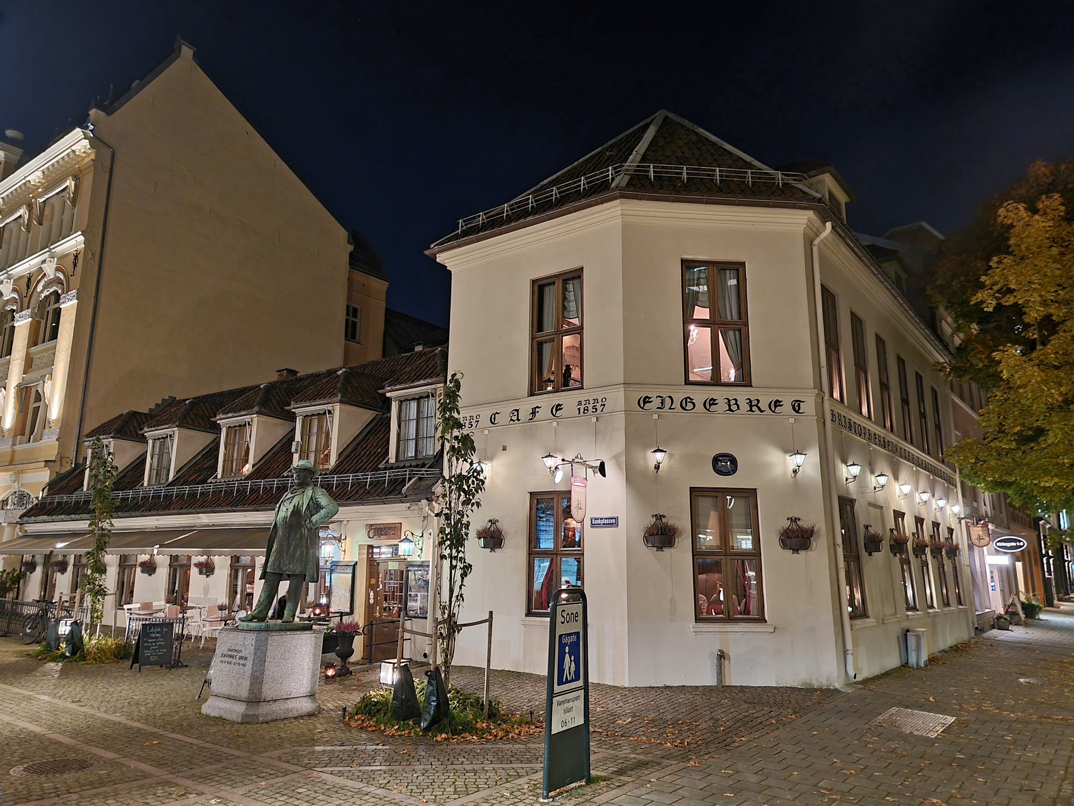 Bilder oben: Gebäude am Bankplassen 1a (Bankenplatz), neben dem bekannten Engebret-Café.