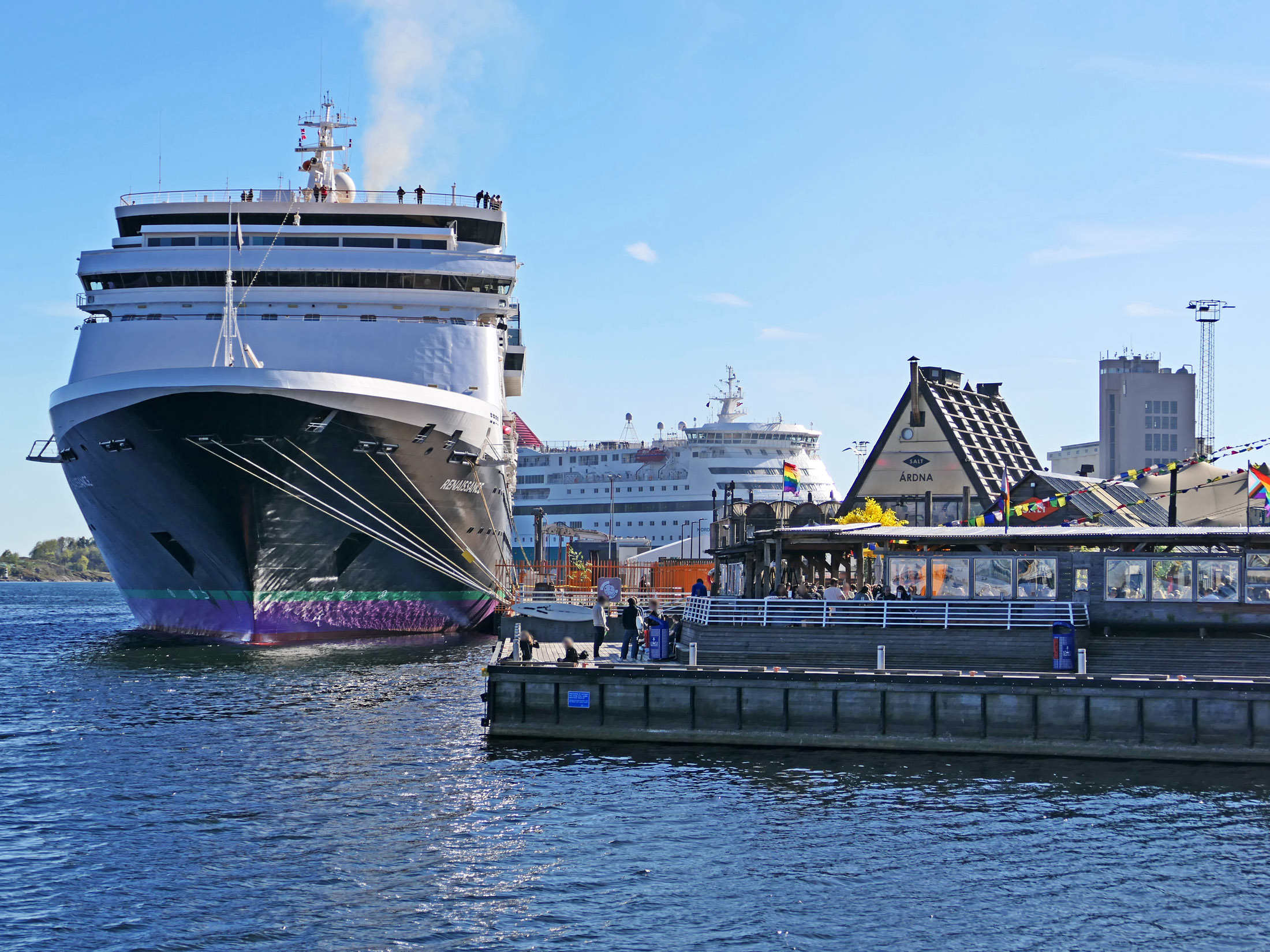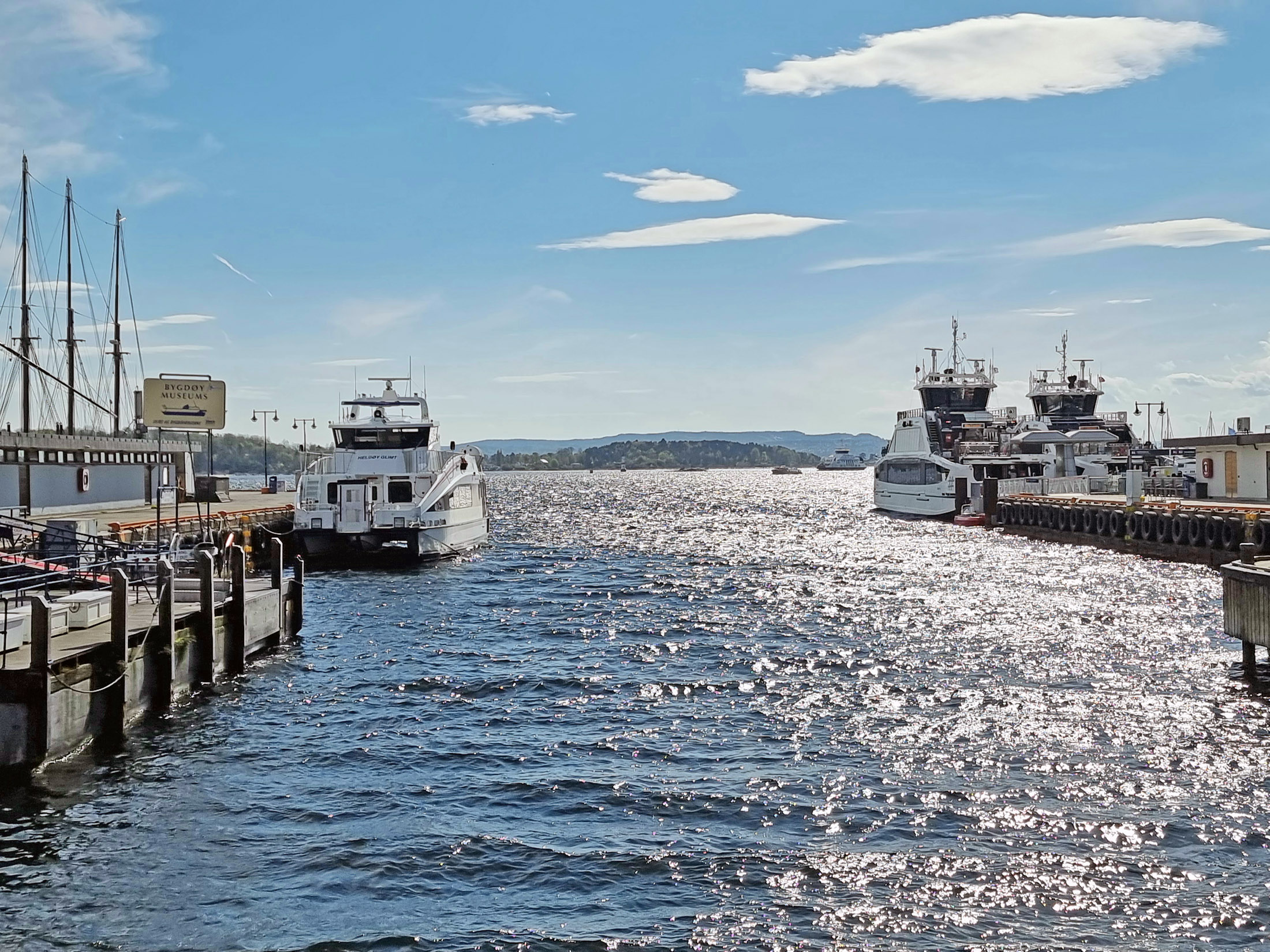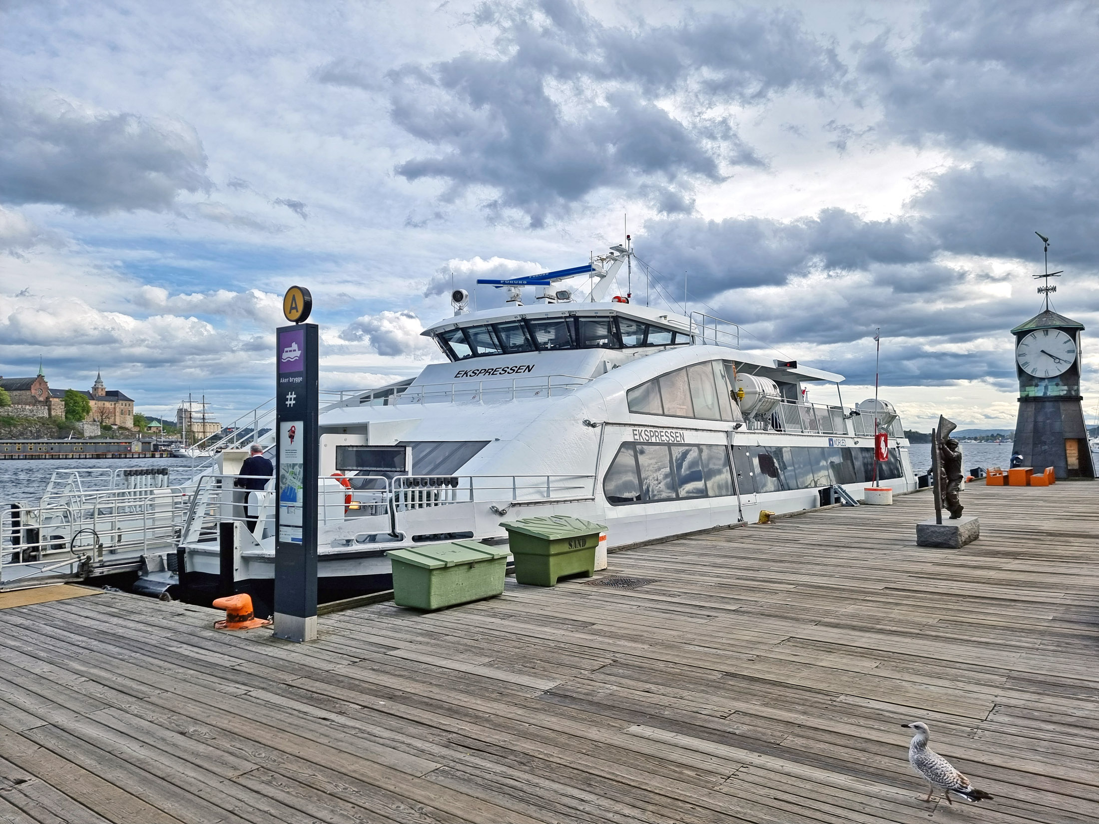 Bilder oben: südlich des Rathausplatzes bei Akerbrygge befinden sich die Fähranleger für die Fähren, die zu den Inseln im Oslofjord verkehren. Diese gehören zum Nahverkehrsunternehmen #Ruter, d.h. mit dem Nahverkehrsticket kann man von der Straßenbahn auf das Boot umsteigen.