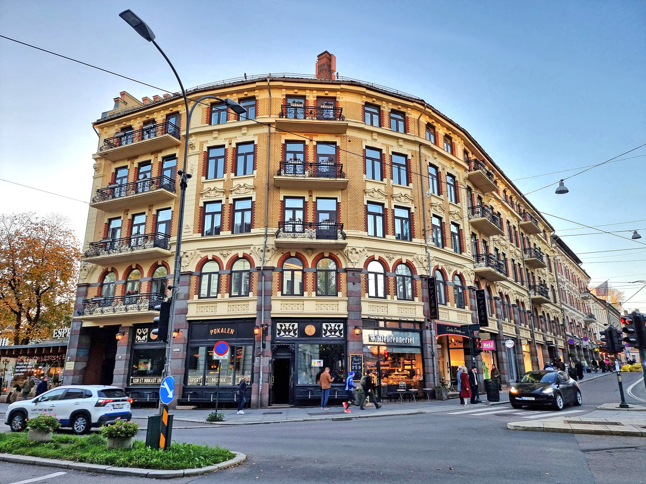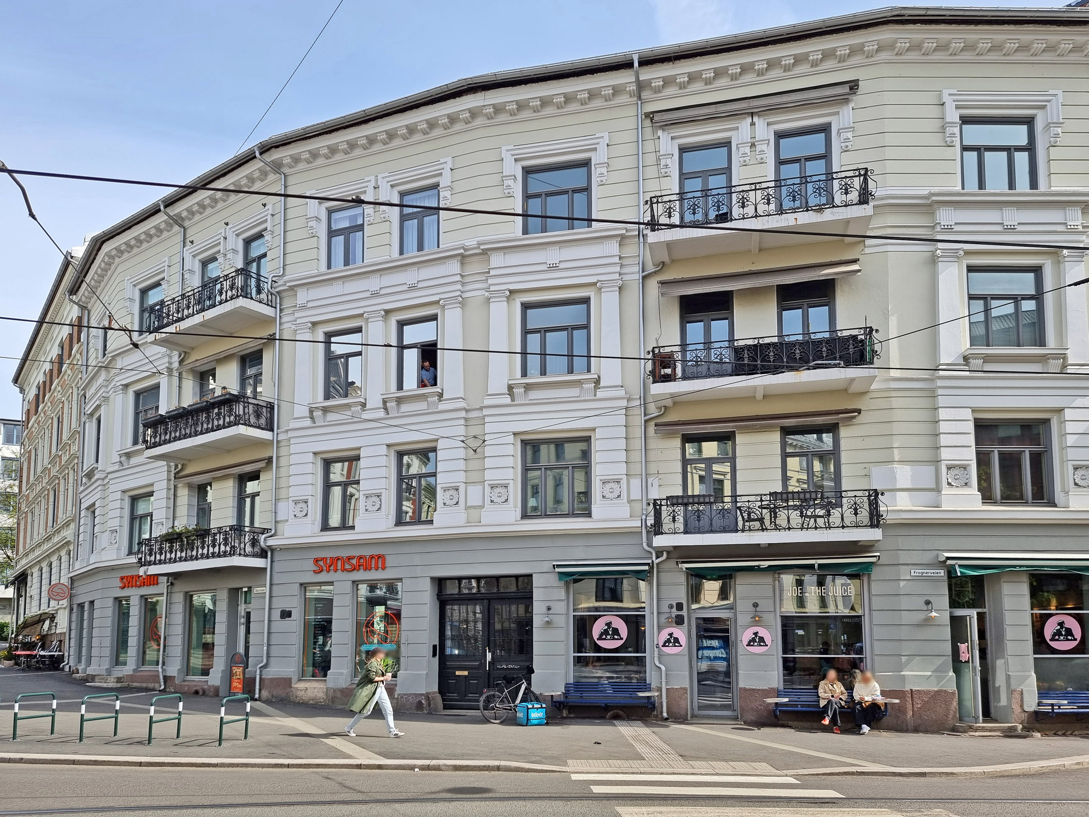 Bilder oben: Geschäftshäuser und Gastronomie: an der Kreuzung von Frognerveien und Skovveien unweit des Solli plass mit der Norwegischen Nationalbibliothek liegt das Café „Kaffebrenneriet Dept. Skovveien“.