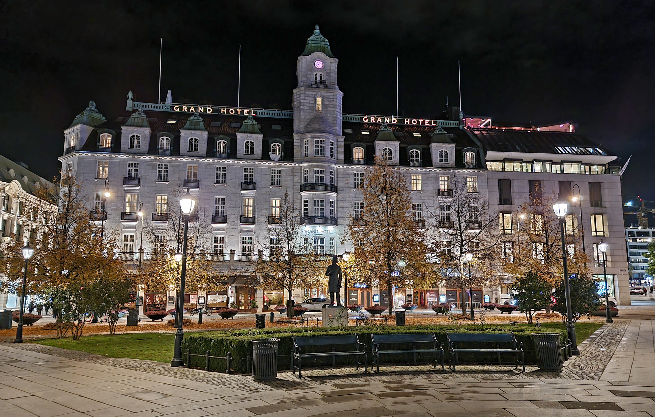 Bilder oben: nächtlich beleuchtete Geschäftshäuser im Stadtzentrum an der Nedre Slottsgate und der Karl Johans gate.