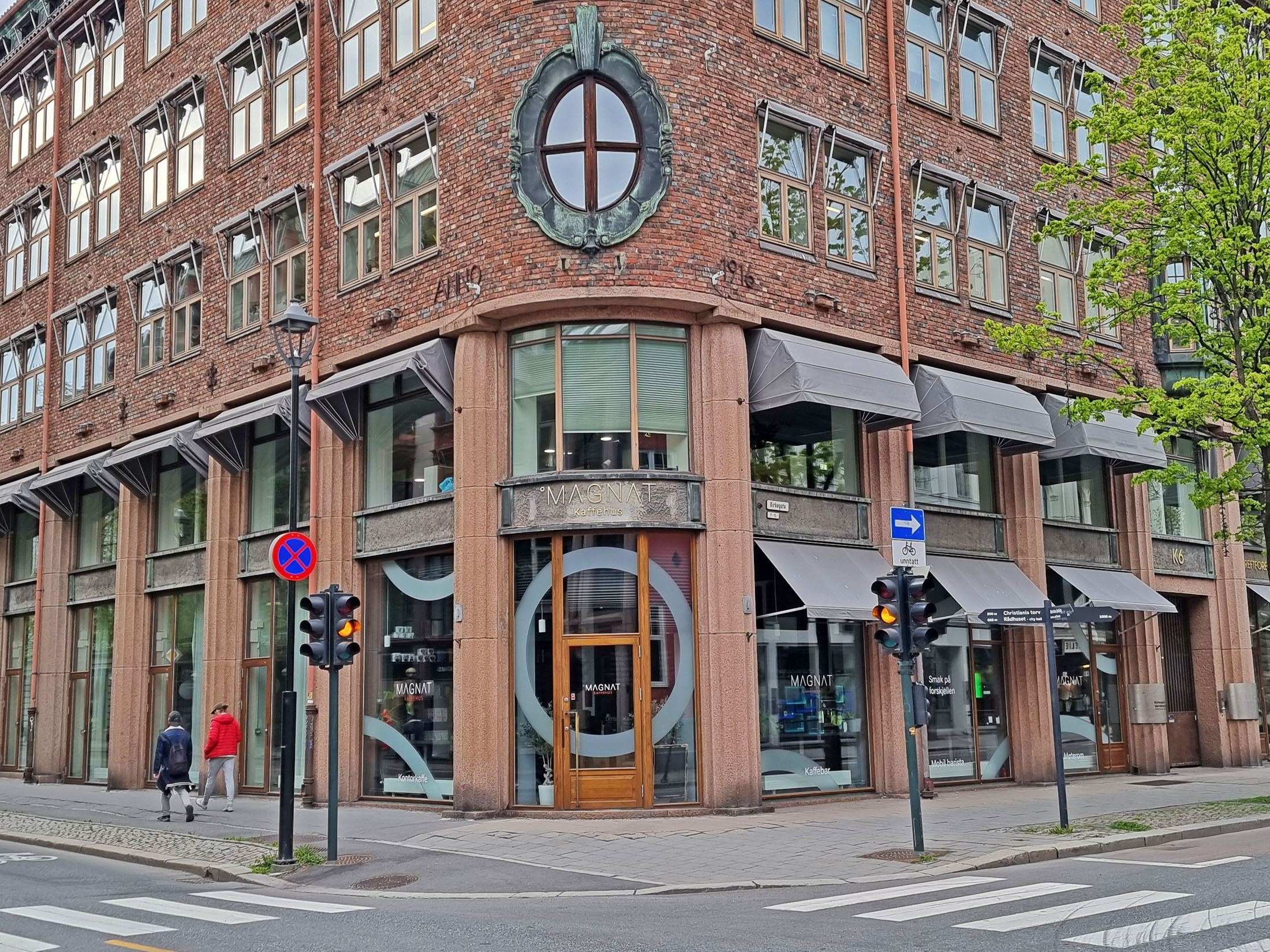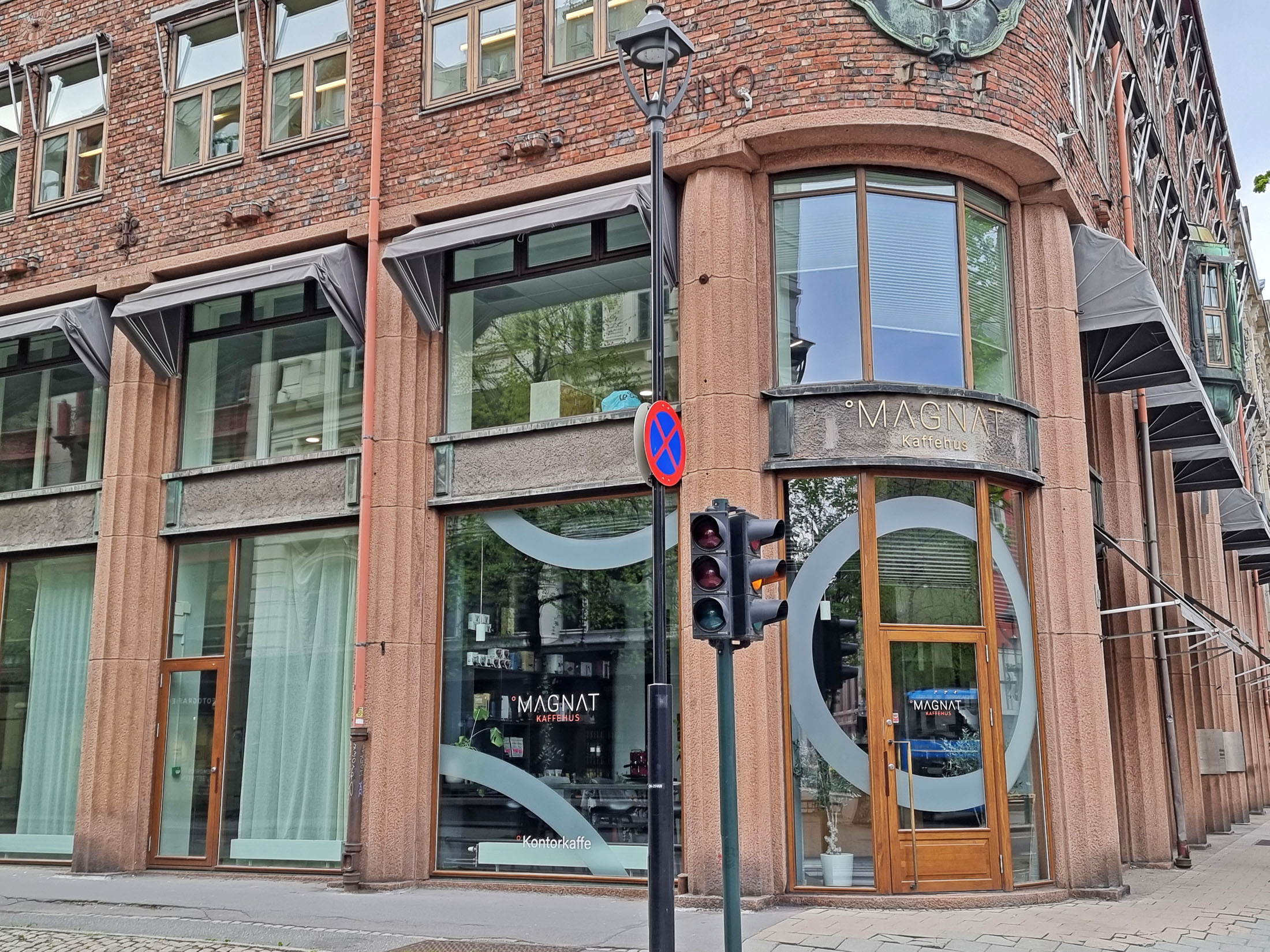 Bilder oben: das Café Magnat liegt an der Ecke Rådhusgata / Kirkegata.