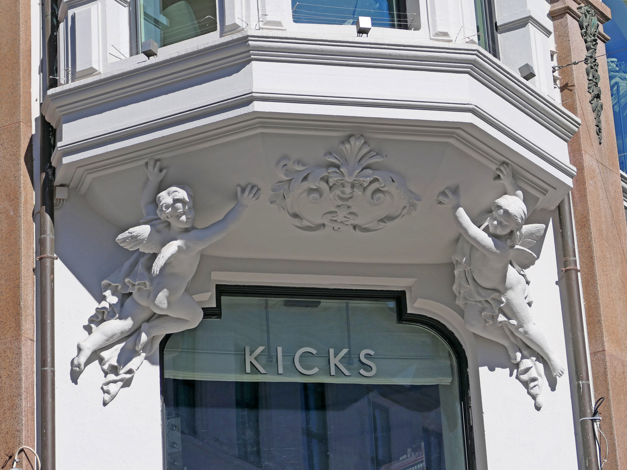 Bilder oben: auf einem Gebäude schräg gegenüber dem Horngården-Gebäude an der Kreuzung Karl Johans gate und Øvre Slottsgate befindet sich wohl die bekannteste Werbetafel der Stadt: die „Freia-Uhr“. Sie wurde 1925 aufgestellt und warb für das Unternehmen Freia, welches einige Zeit lang der größte skandinavische Hersteller von Schokolade(produkten) war. Längst ist die Firma von einem großen amerikanischen Lebensmittelkonzern „geschluckt“ worden, doch die Marke und damit auch die Werbetafel (inklusive der Uhr) blieben erhalten.
