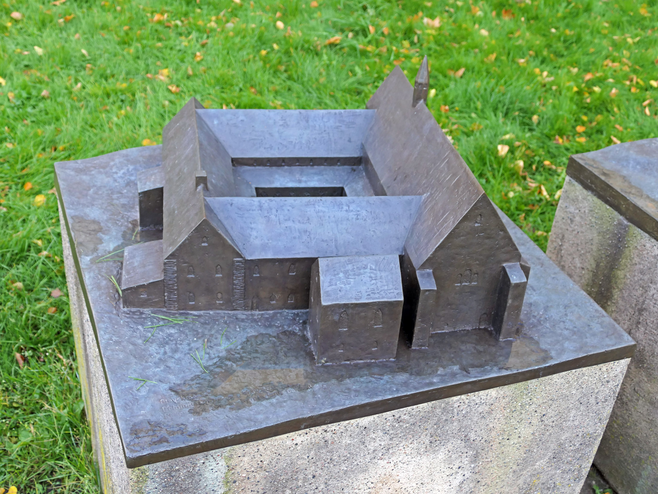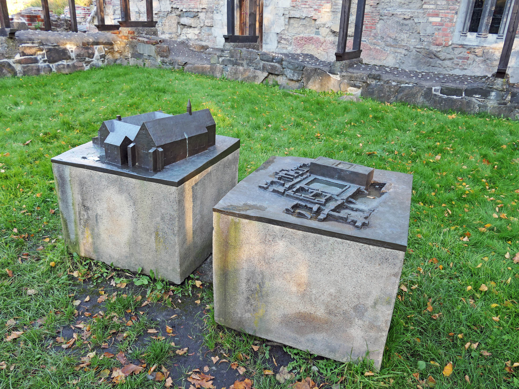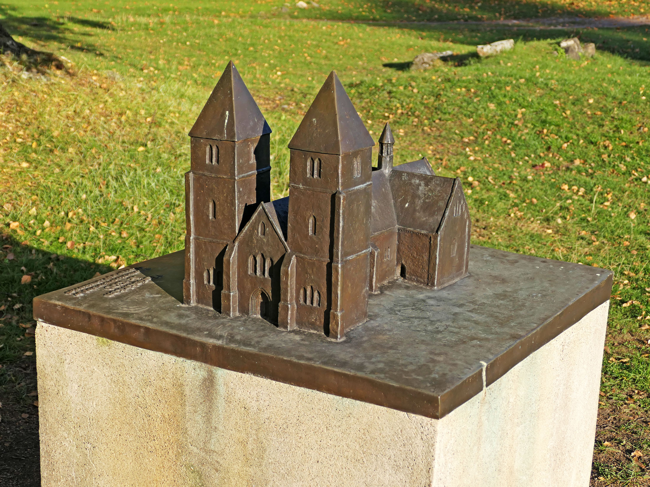 Bilder oben: Infotafel und Bronze-Modell der Gebäude in den Ruinen des Olavsklosters.