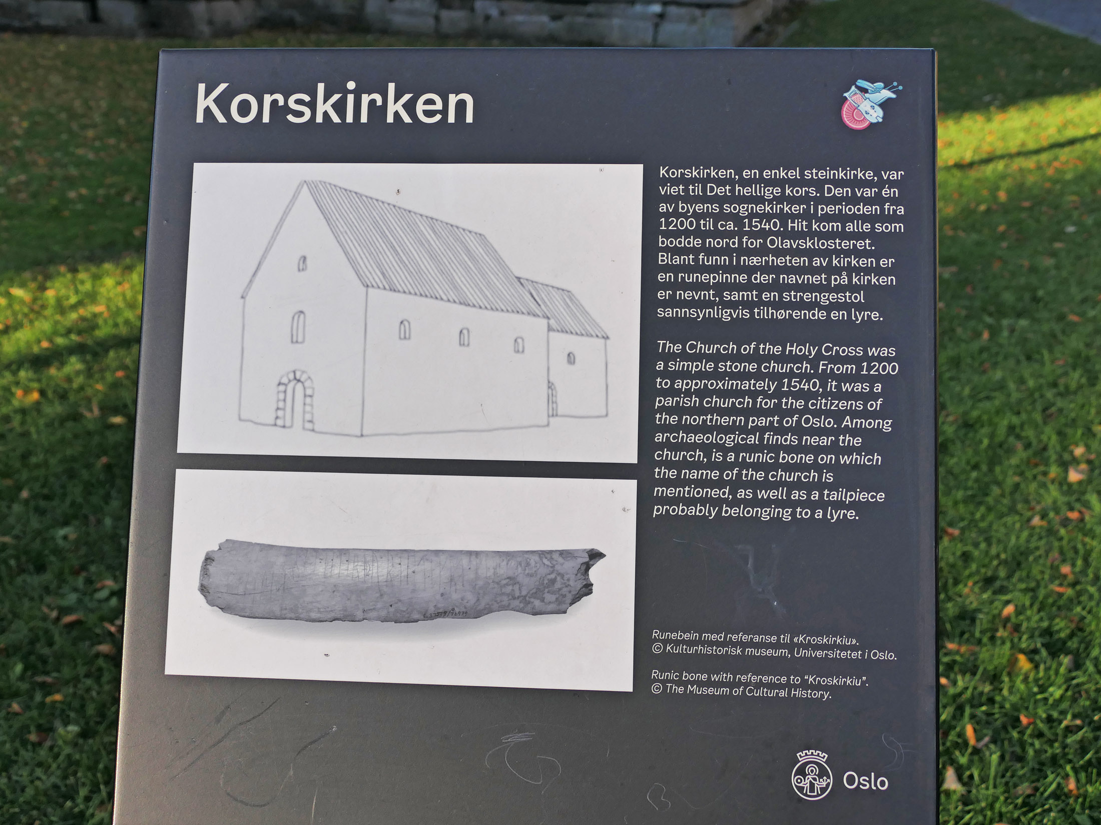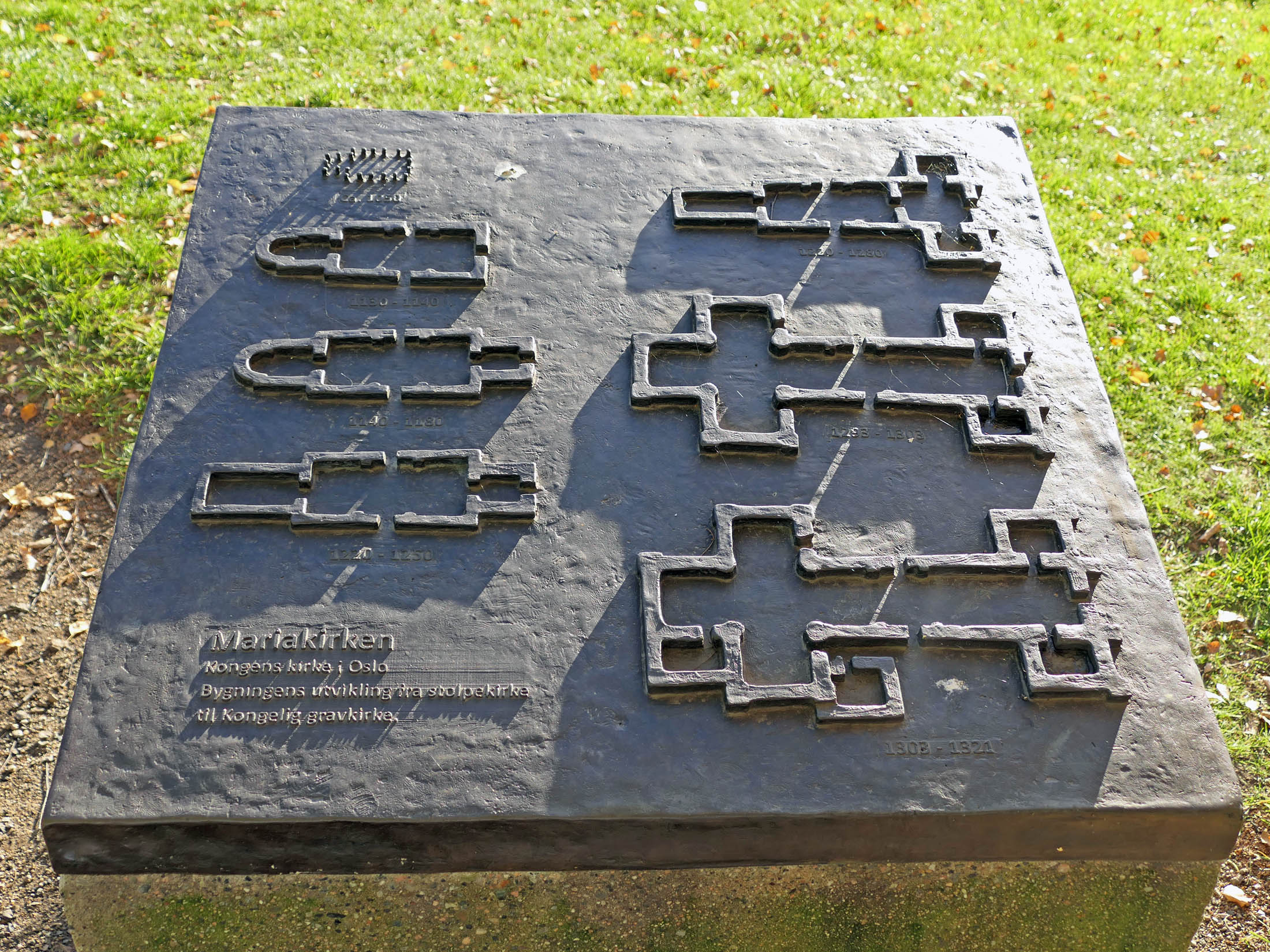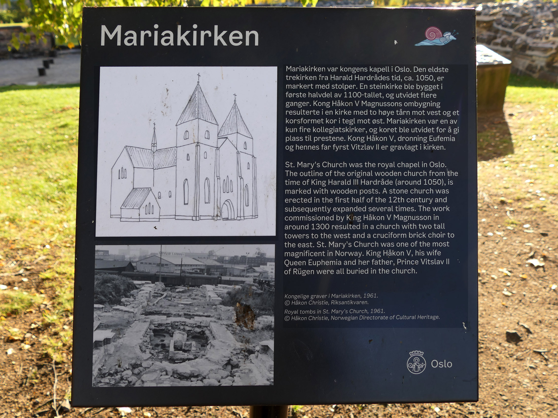 Auf einer Info-Tafel neben den Grundmauern der Ruine kann man das Folgende lesen (sinngemäß aus dem Englischen übersetzt): „Die Kirche St. Maria war die königliche Kapelle in Oslo. Der Umriss der ursprünglich hölzernen Kirche aus der Zeit von Harald III. Hardråde (um 1050) sind auf dem Gelände durch Holzpfosten markiert.