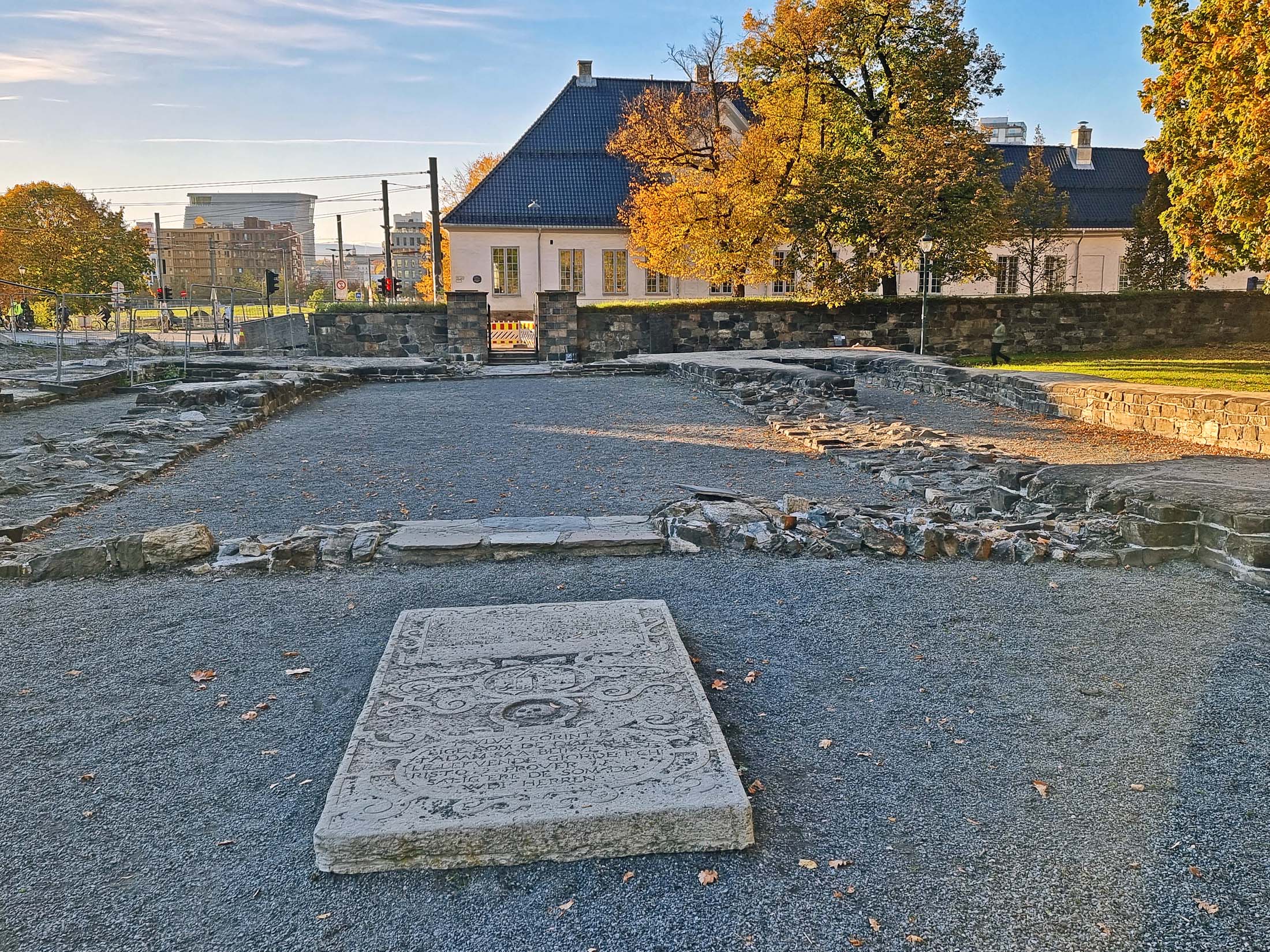 Bilder oben: die Grundmauern der St. Hallvards-Kathedrale und bei den Grabungen aufgefundene Grabsteine.