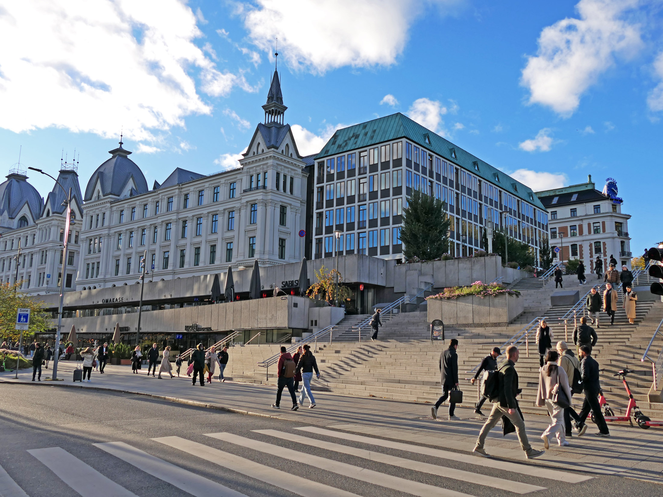 Bilder oben: Jugendstilpaläste und andere Geschäftshäuser an der zentralen Osloer Prachtstraße Karl Johans gate.