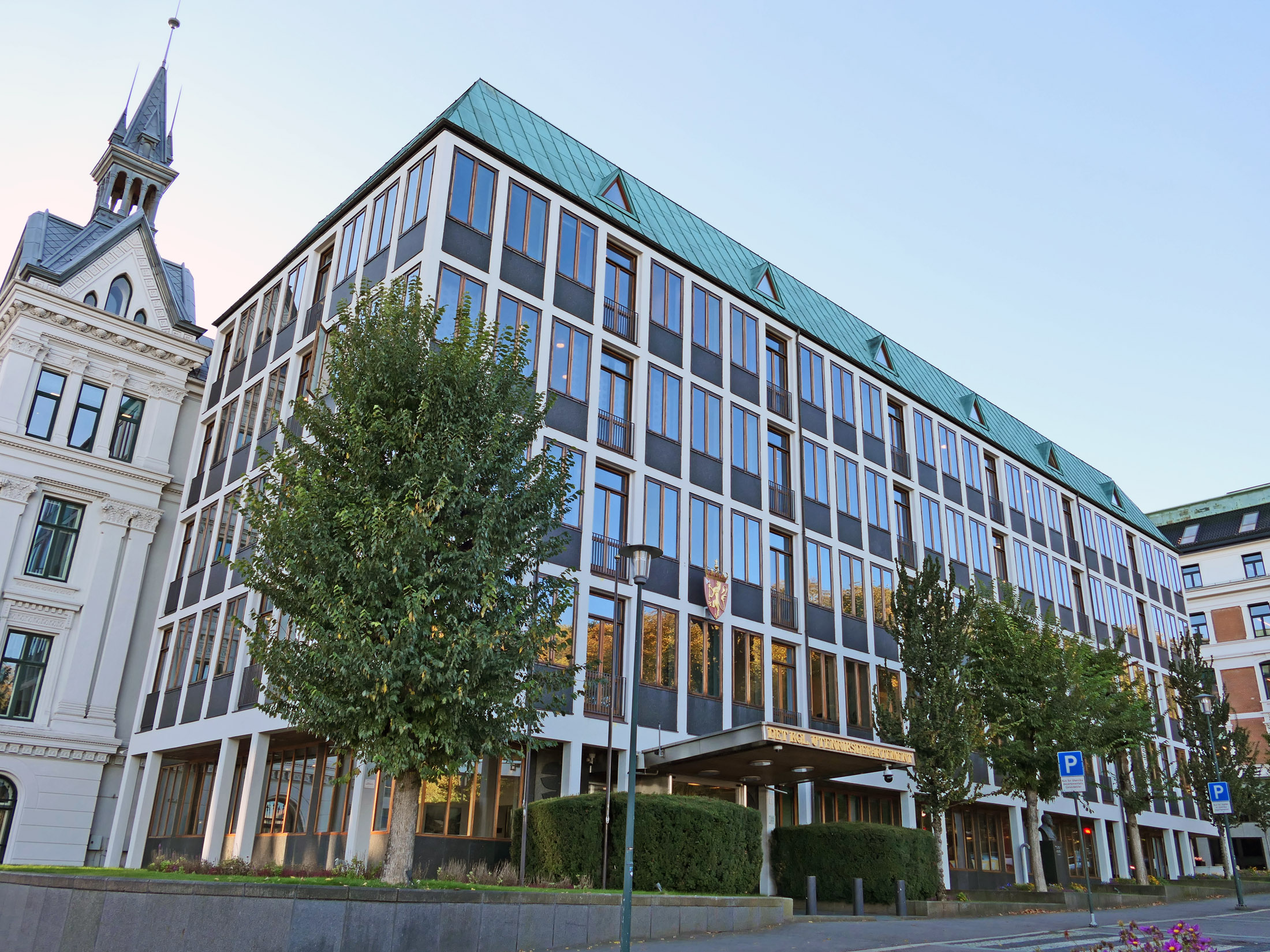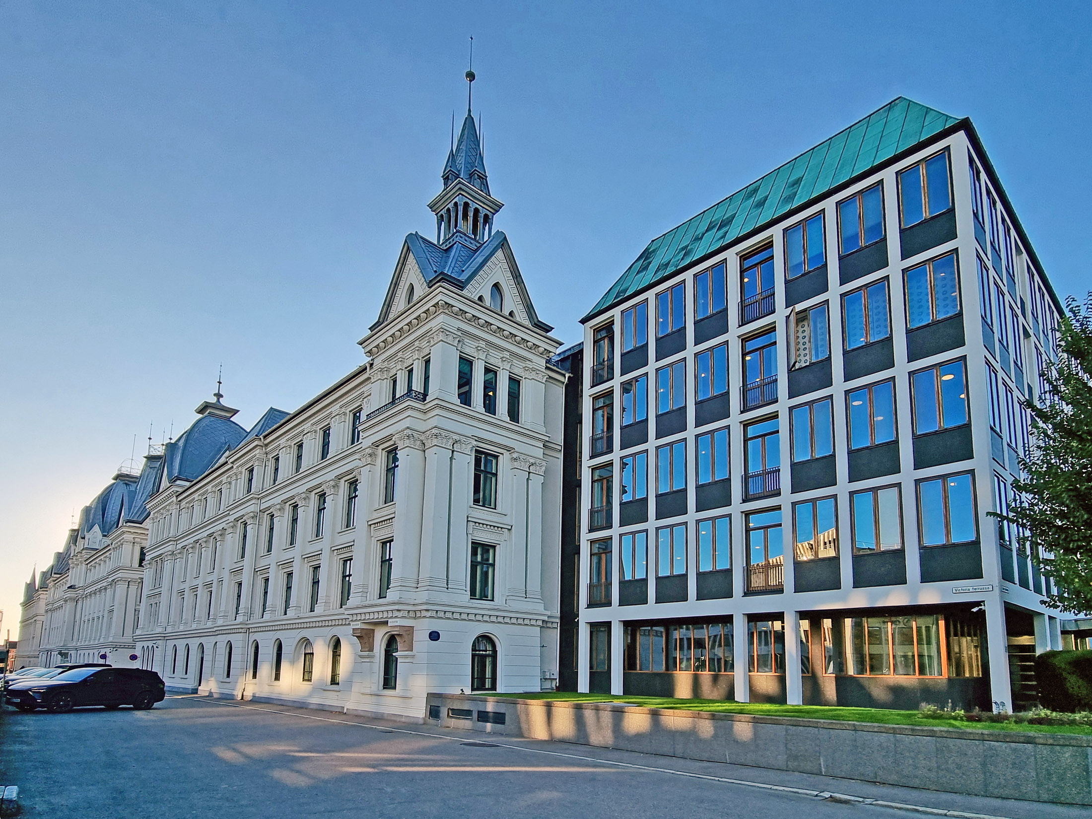 Bild oben: Blick vom Ruseløkkveien auf die Vikaterrassen und den modernen Anbau des norwegischen Außenministeriums.