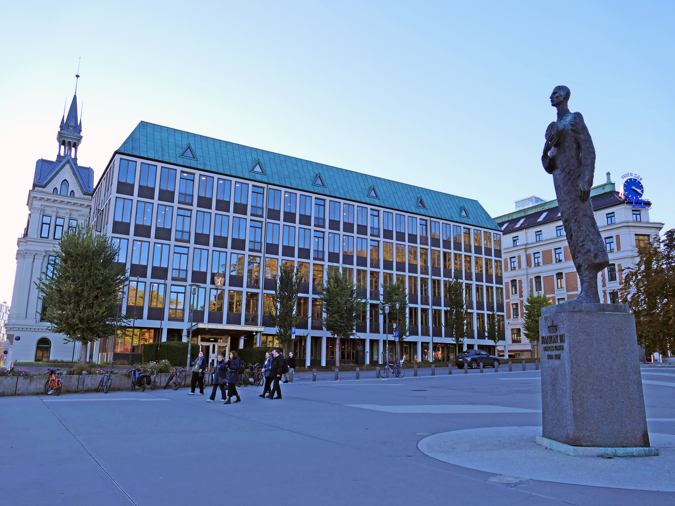 Bilder oben: weitere Büros für die Mitarbeiter/innen sind in einem modernen Anbau entstanden; das norwegische Außenministerium gehört vom Personal her zu den größten Ministerien. Auf dem Platz vor dem Gebäude steht ein Standbild von Haakon VII, der von 1905 bis 1957 König von Norwegen war.