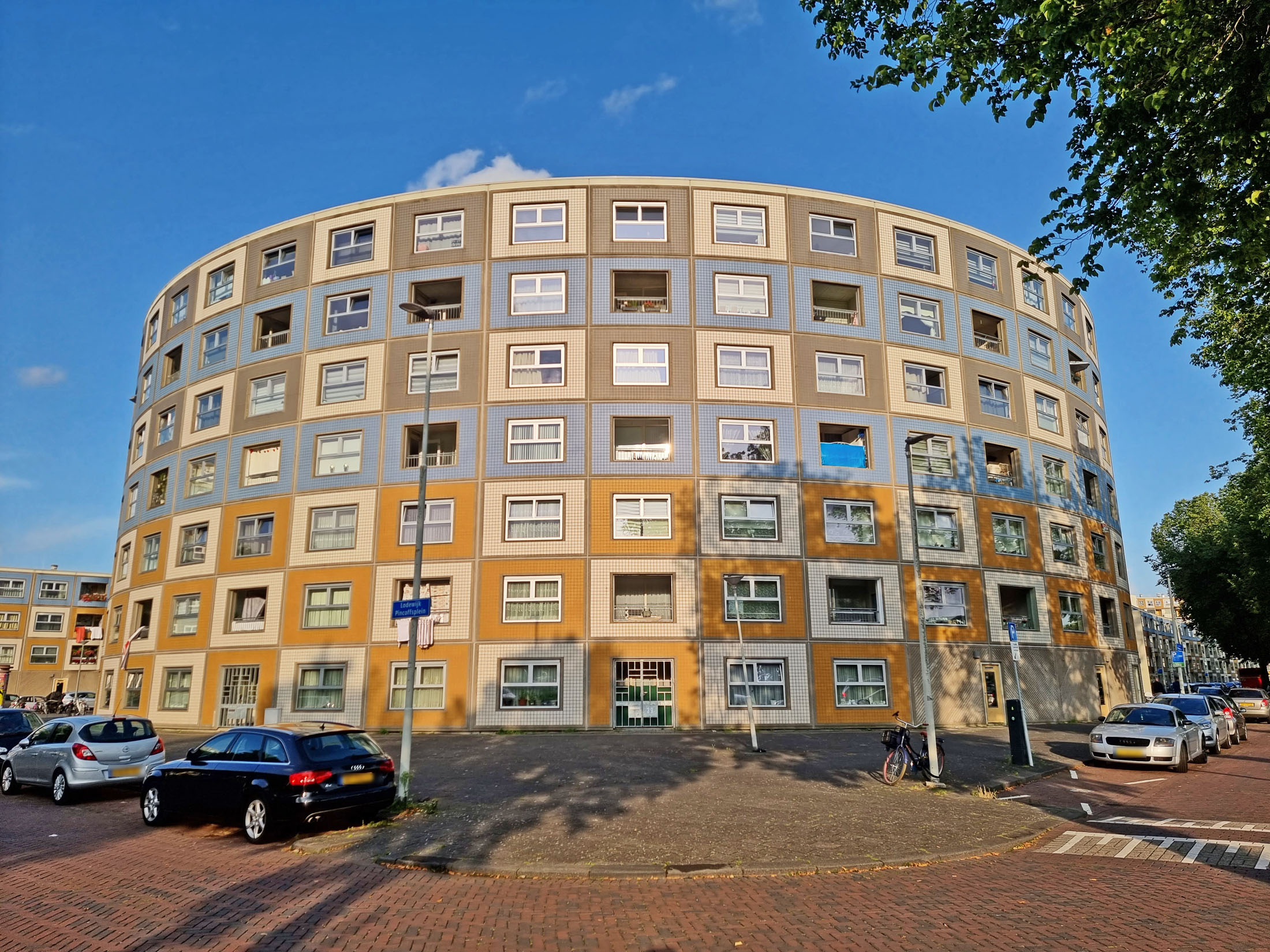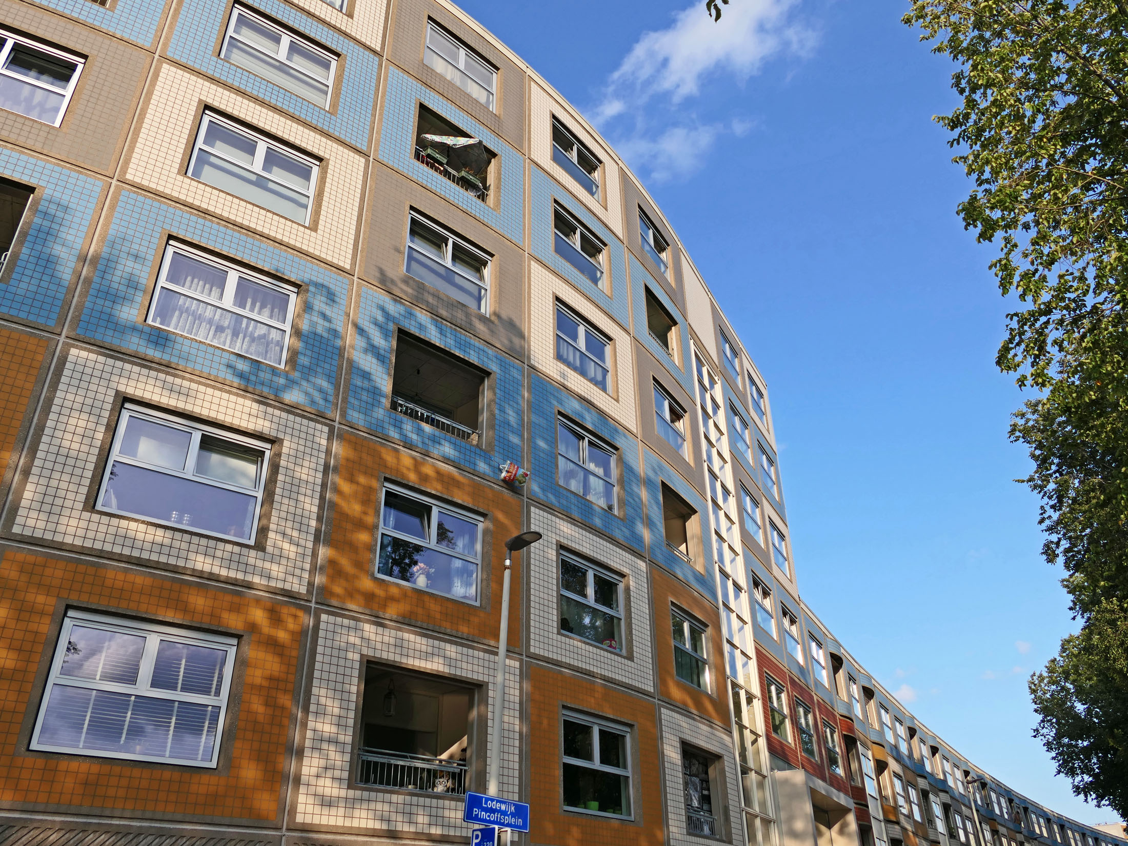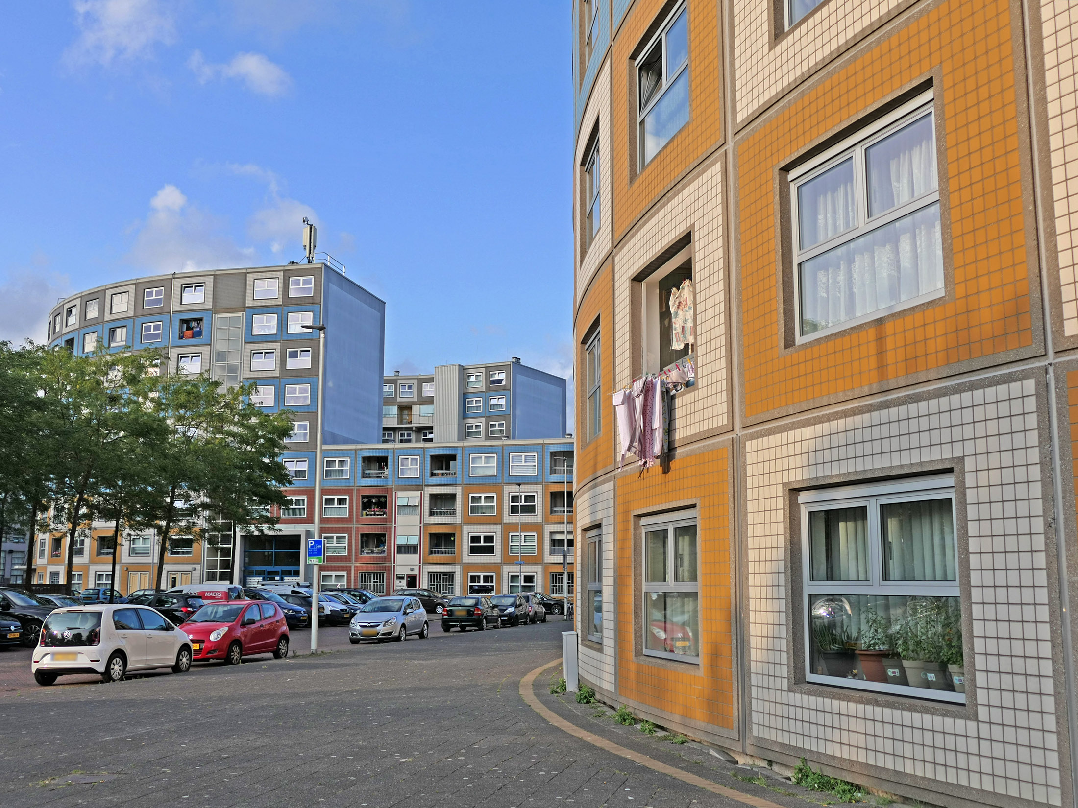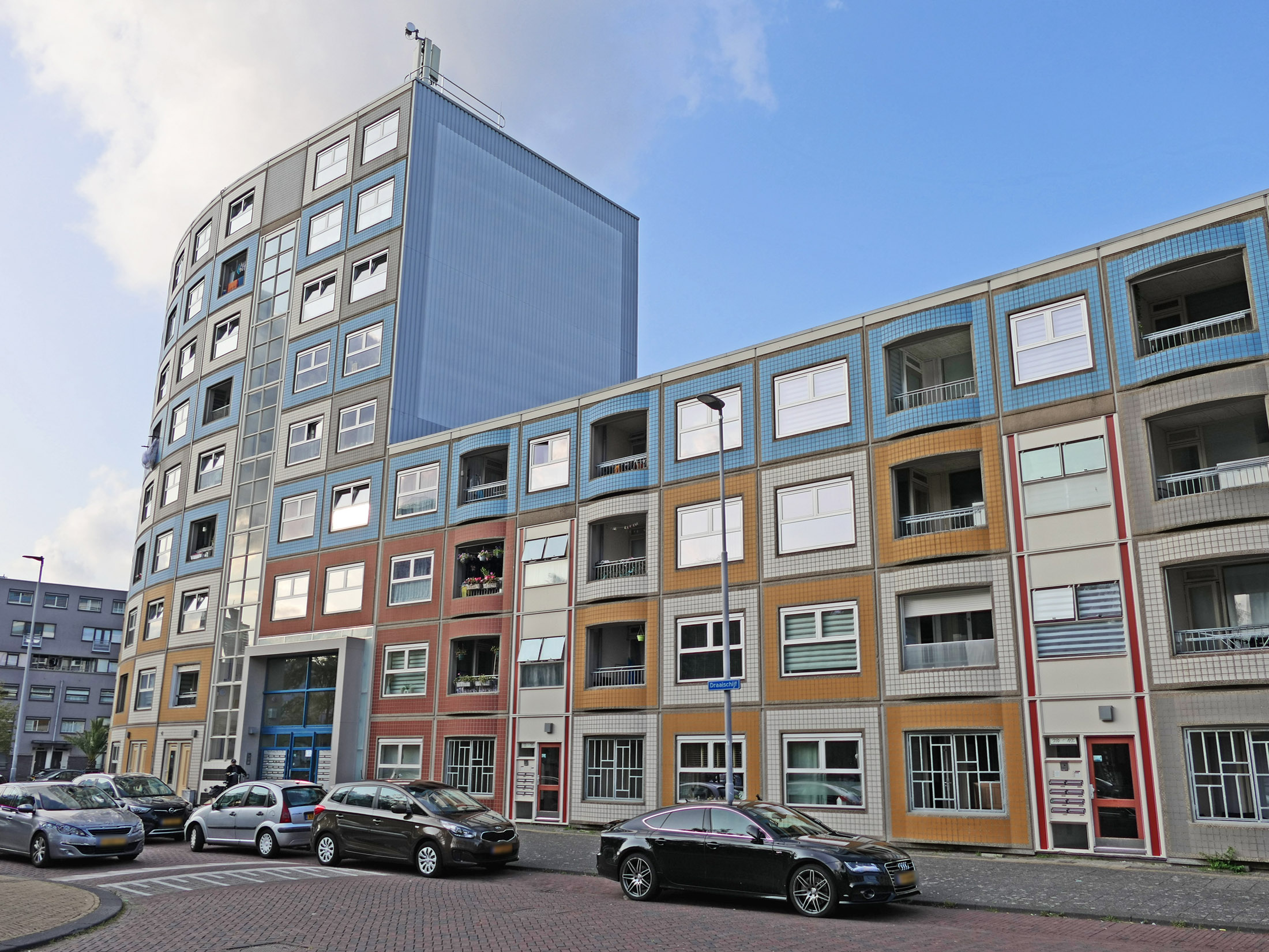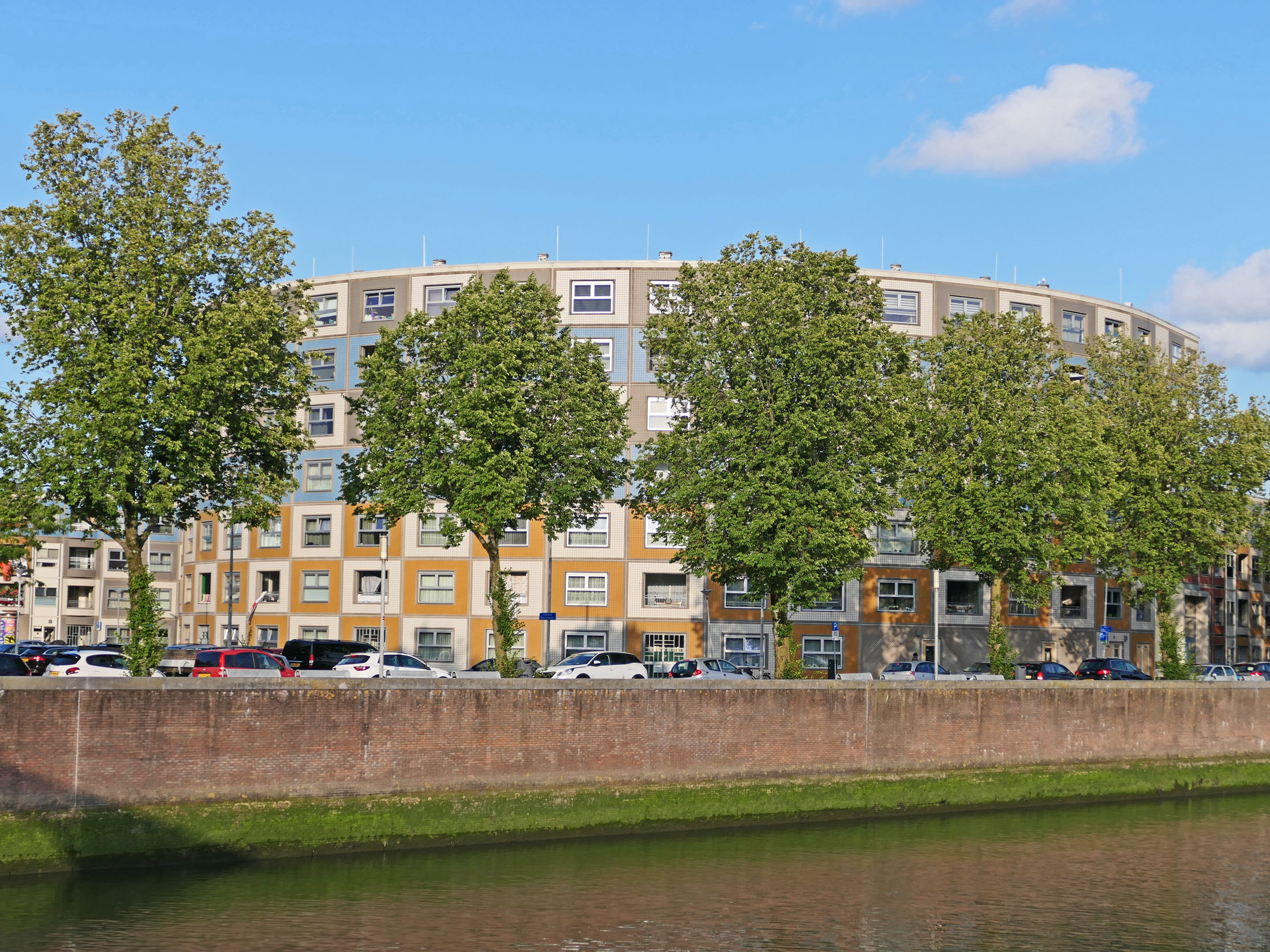 Bilder oben: Wohnen am Wasser (am Kanal Delftsevaart): die Gebäude wurden zwischen 1975 und 1979 von Jan Hoogstad und Aat van Tilburg im Auftrag der Stadt, wie eine ganze Reihe ähnlicher Bauten zwischen Pompenburg entlang dem Flüsschen Rotte bis Leuvehaven errichtet. Mit der Schaffung verdichteten Wohnraumes sollte die Innenstadt lebendiger werden.