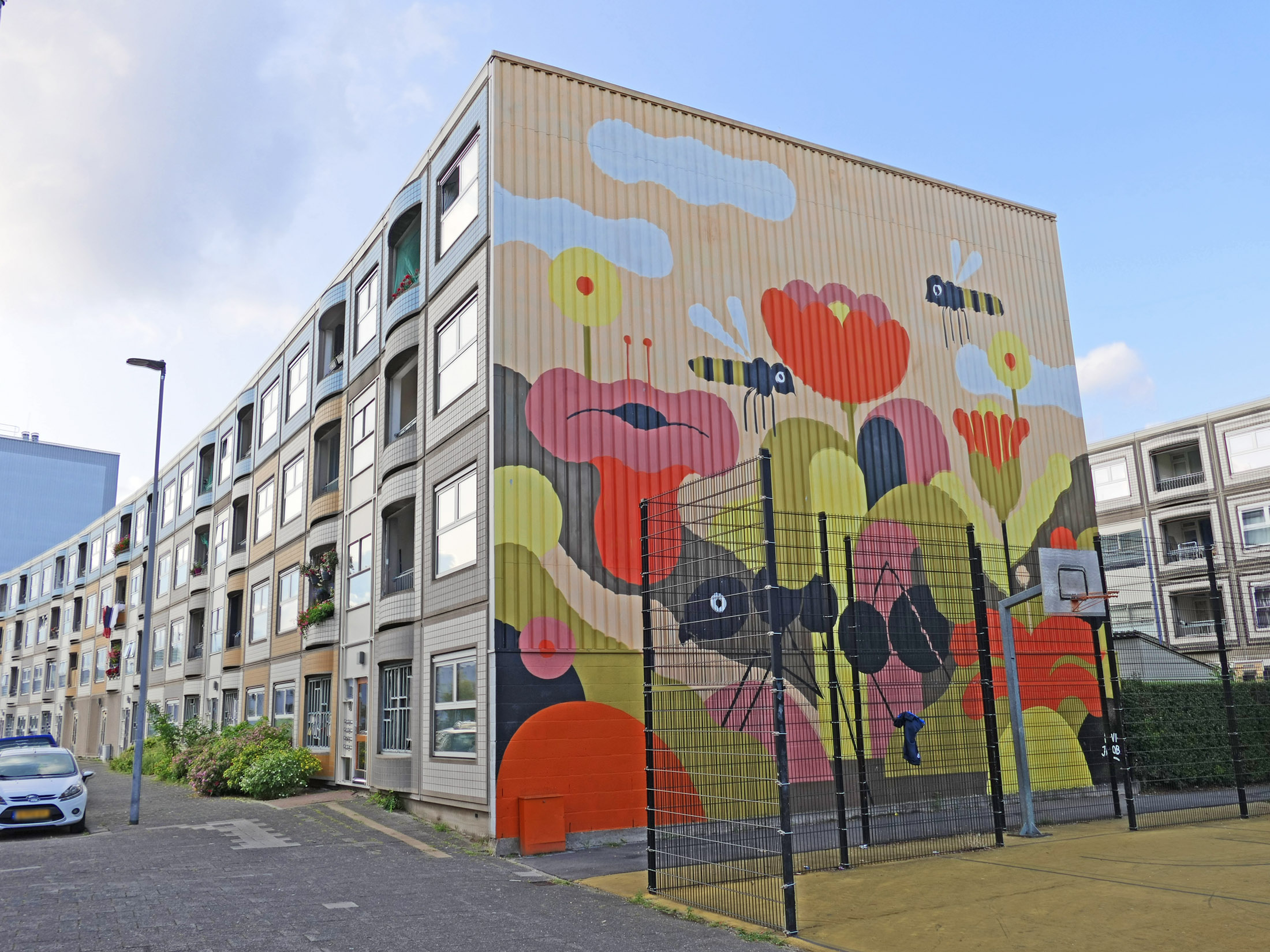 Bild oben: Wandgemälde an einem Gebäudeende im Innenhof; hier befindet sich auch ein Ballspielfeld.