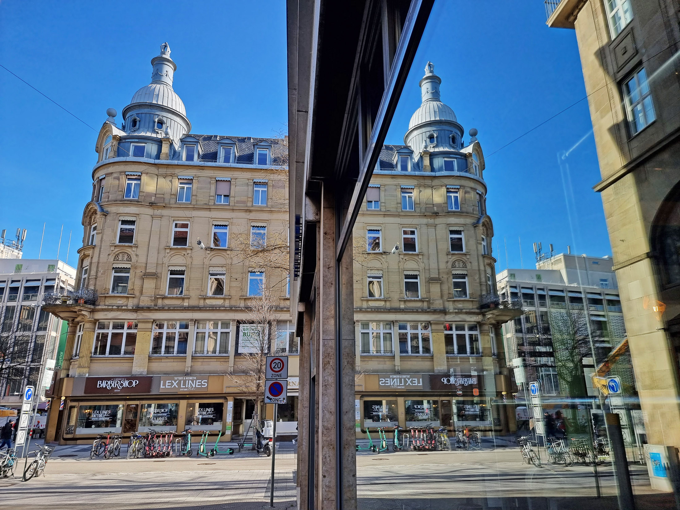 Bilder oben: der Carl-Eugen-Bau spiegelt sich in der Fassade des gegenüberliegenden Bankgebäudes.