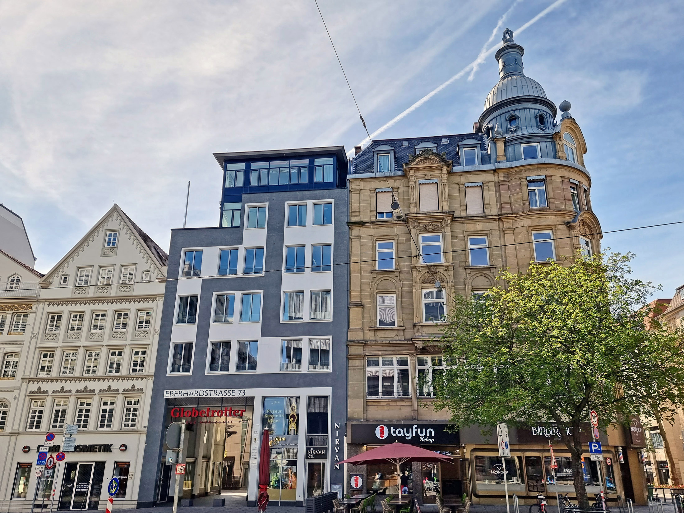 Zum Bild: Blick von der Eberhardstraße und von der Nesenbachstraße auf den Tagblatt-Turm.
