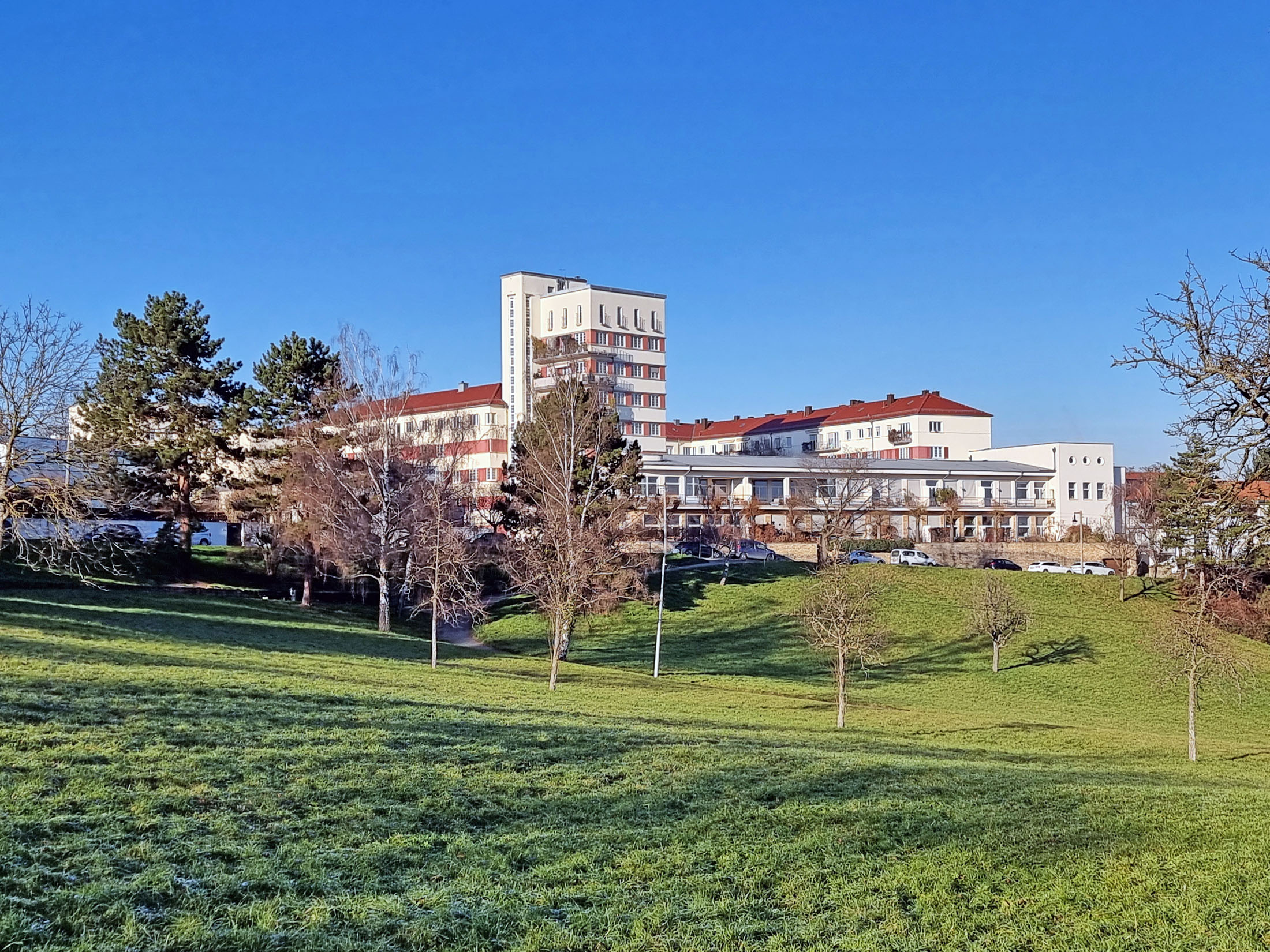 Der Wohnkomplex befindet sich in unmittelbarer Nachbarschaft der Weißenhofsiedlung, wurde auch etwa zeitlich mit dieser erbaut, gehört aber nicht zu den Mustergebäuden der Werkbundausstellung von 1927.