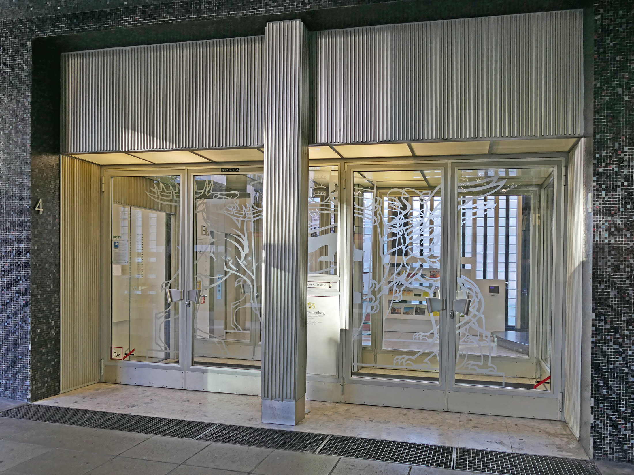 Das kubische Gebäude der ehemaligen Württembergischen Bank (heute: BW-Bank) wurde zwischen 1963 und 1968 von Rolf Gutbrod erbaut. Heute bildet der Kubus ein Pendant zum gläsernen „Kunst-Kubus“, dem Kunstmuseum (von Hascher und Jehle).
