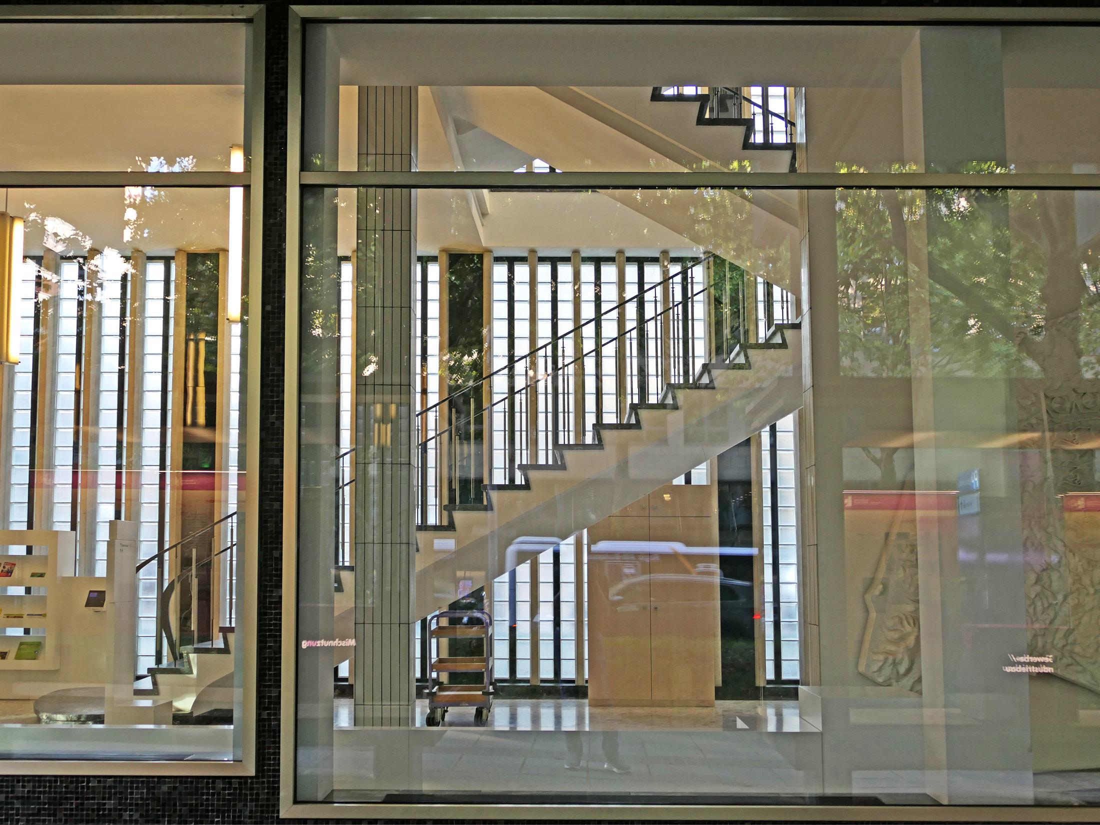 Die Rasterfassade des Bankhauses hat Gutbrod nicht so uniform gestaltet wie andere Bürogebäude aus dieser Zeit: hier sind die Fensterstreifen unterschiedlich breit und getrennt durch rhombenförmig gestaltete vertikale Elemente aus dunklem Naturstein, was der Fassade eine ausgesprochene Plastizität verleiht.