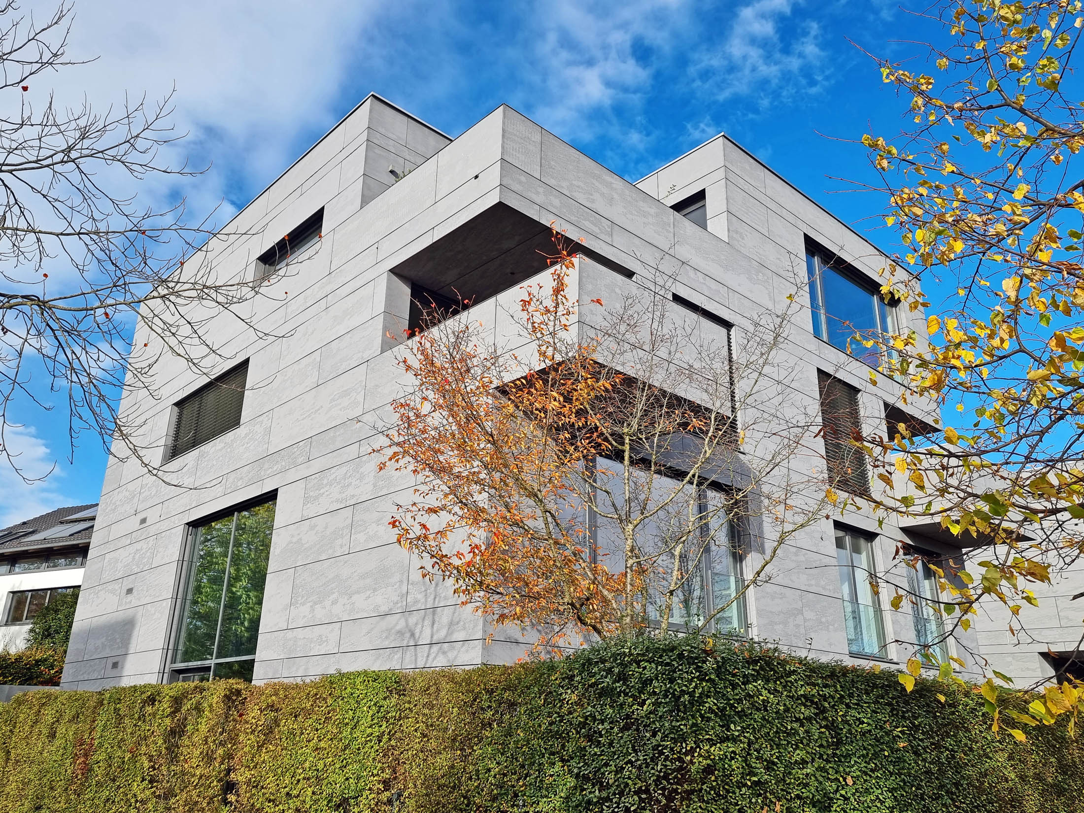 Entscheidend zur prägnanten Gestalt der Gebäude trägt die Fassade aus Eternitplatten bei. Die homogenisierende Materialität verstärkt das Zusammenspiel der beiden Wohnhäuser im Sinne einer Gemeinschaft und verleiht ihnen eine eigene starke Identität. Zugleich erzeugen die geschliffenen, betongrauen Platten eine sich ständig wechselnde Lebendigkeit der kubischen Volumina mit ihren eingeschnittenen Loggien und Dachterrassen.“
