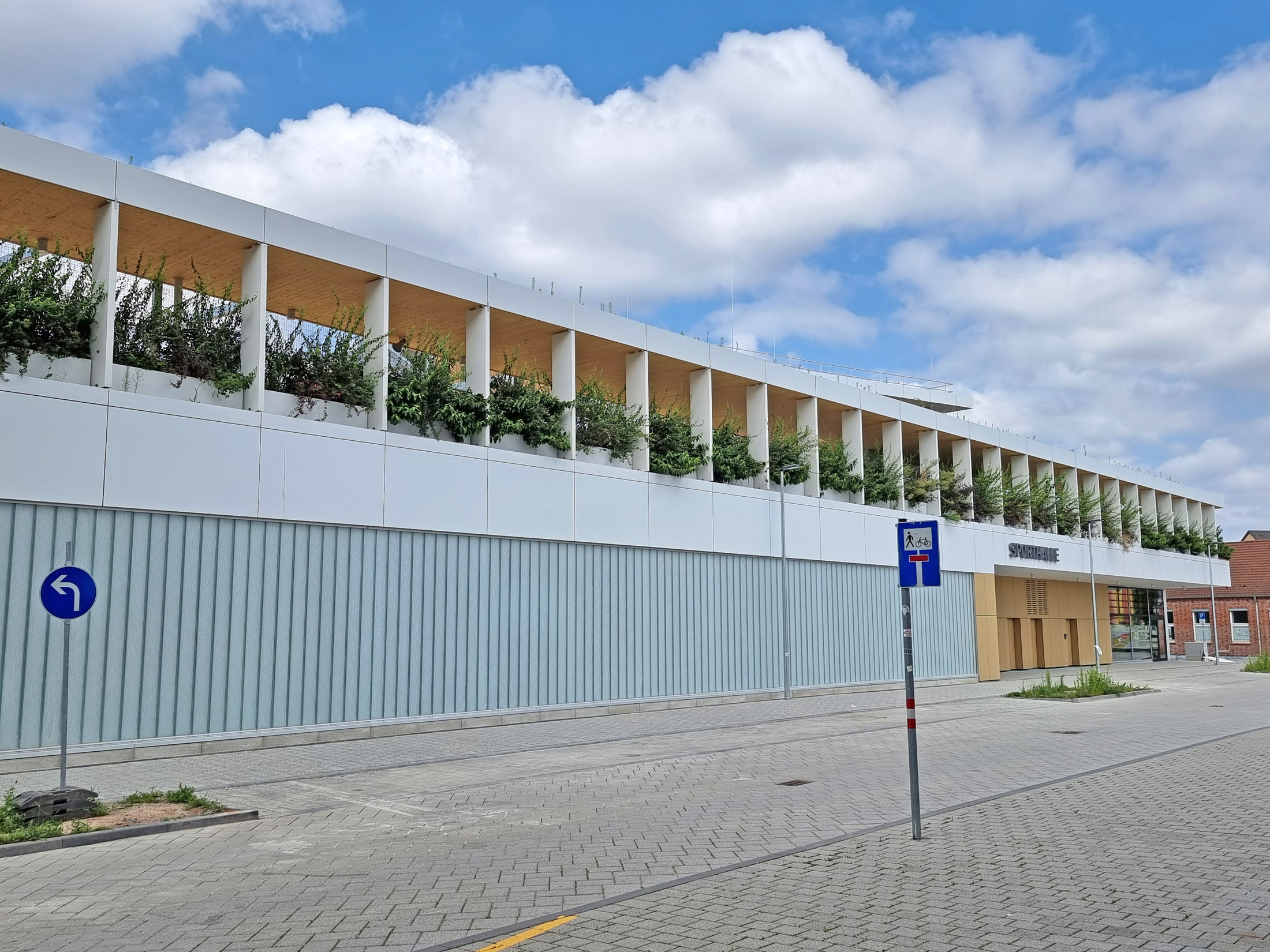 Bilder oben: das neue Parkhaus ist zugleich auch Energie- und Heizzentrale für das Quartier; ein Blickfang ist die Treppe, welche die Parketagen miteinander verbindet. Während drei Seiten des Gebäudes weitgehend offene Fassaden haben, ist die vierte Seite mit grünen, bedruckten Glaspaneelen in Rautenform geschlossen.