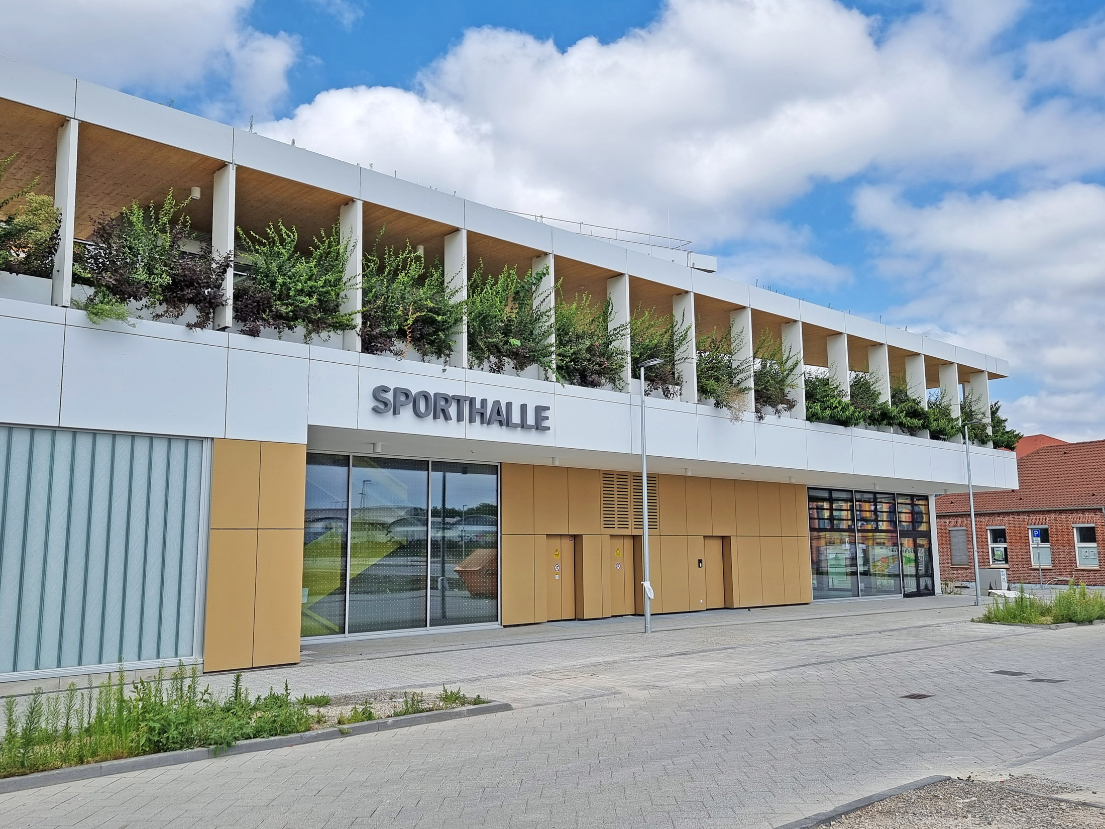 Im Innenhof zwischen den drei Baukörpern entstand ein 35 x 14 Meter großes gewölbtes Stahl-Glasdach, welches die unterirdische Sporthalle mit Tageslicht versorgt.“