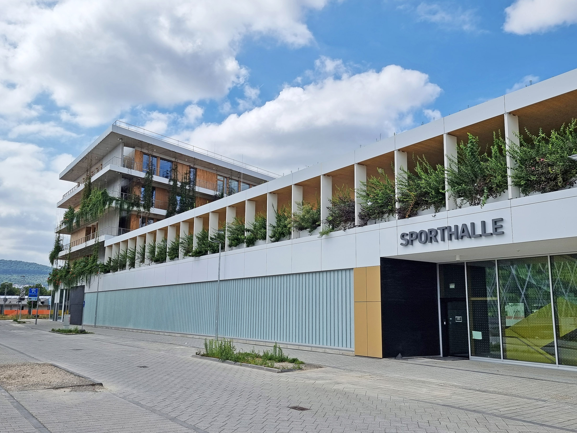 Die außen befindliche Tragstruktur besteht aus rautenförmig angeordneten Stahlträgern, ein sich darüber spannendes Edelstahlnetz dient der Absturzsicherung, gleichzeitig soll es als Rankhilfe für die Fassadenbegrünung aus Weinreben wirken. Im Untergeschoss ist die Energie- und Heizzentrale untergebracht; der Wärmebedarf für die 850 Wohnungen im Quartier, für die Gewerbegebäude und das Sportbad wird vor allem durch Wärmepumpen, die mit dem vorbeiführenden Abwasserkanal arbeiten, sichergestellt. Aber auch ein Blockheizkraftwerk ist installiert; es liefert einerseits den Strom für die Wärmepumpen und andererseits unterstützt es das Wärmenetz. Auf dem Flachdach des Gebäudes wurde zudem eine große Photovoltaik-Anlage installiert.