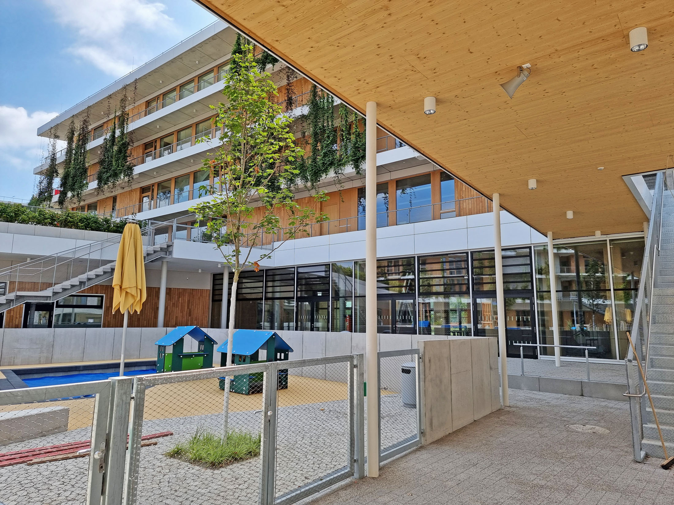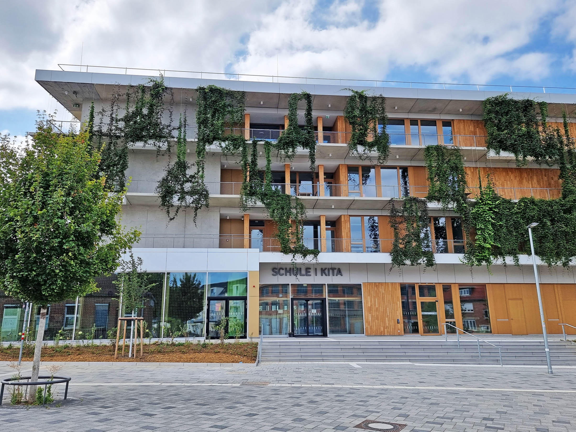 Während das Untergeschoss als Stahlbetonsockel ausgeführt ist, wurden die darüber liegenden Geschosse in Holzhybridbauweise ausgeführt. Die aus Eiche gefertigte Holzfassade ist mit ungiftigen Rankpflanzen begrünt, ebenso das Flachdach. Die Fluchtwege wurden als umlaufende Laubengänge realisiert. Das auf U-förmigem Grundriss errichtete Gebäude erhielt in der Öffnung des „U“ einen grünen Innenhof mit Spielgeräten und auf dem Dach entstand ebenfalls ein grüner Pausenhof, dazu Spielmöglichkeiten sowie ein Schulgarten. Fassaden-, Dach- und Hofbegrünung wurden von den Landschaftsarchitekten Pfrommer + Roeder ausgeführt.
