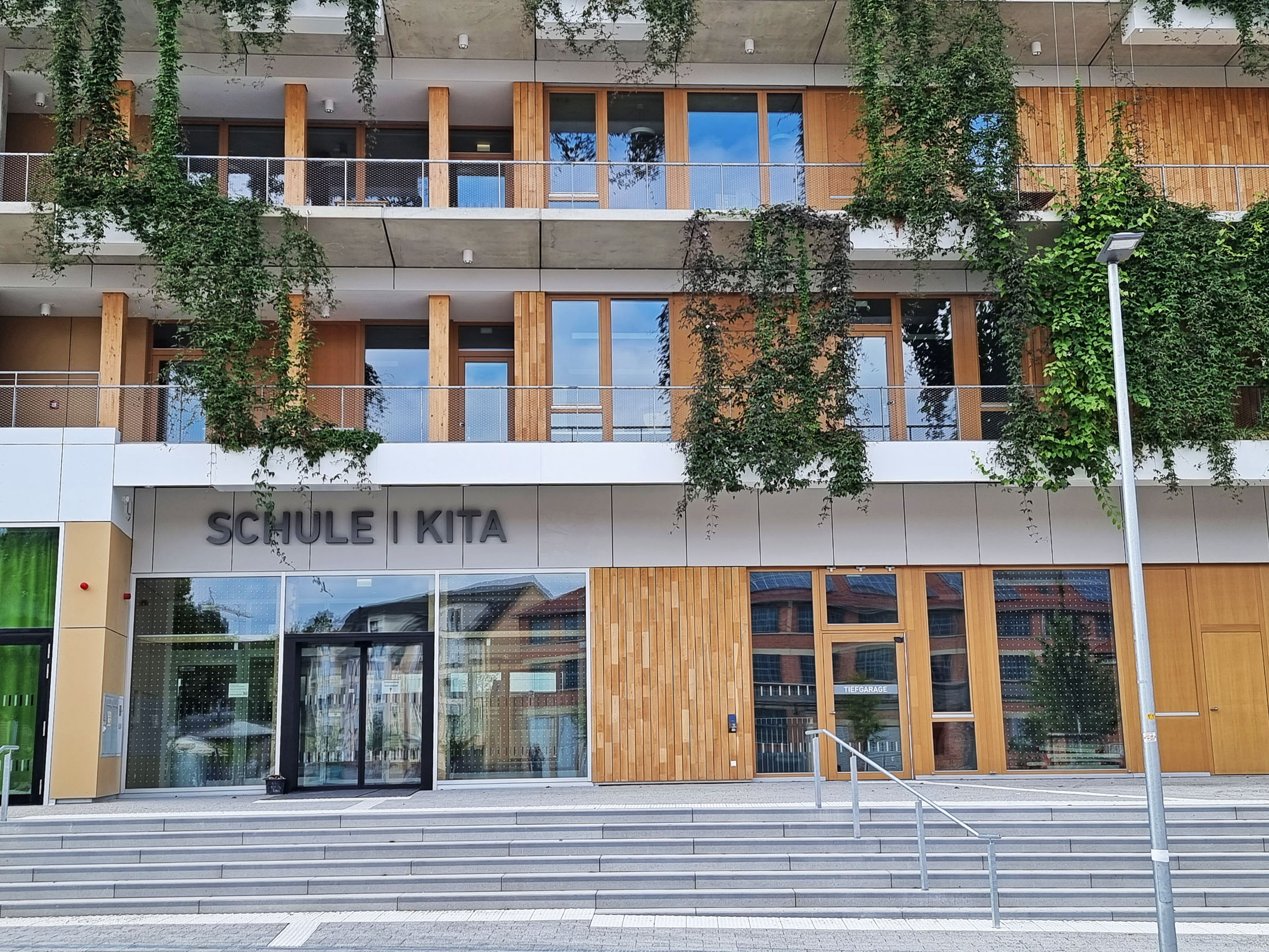 Bilder oben: der Eingang zur Grundschule und zur KiTa befindet sich an der Gebäudeseite zum Marga- von-Etzorf-Platz hin.