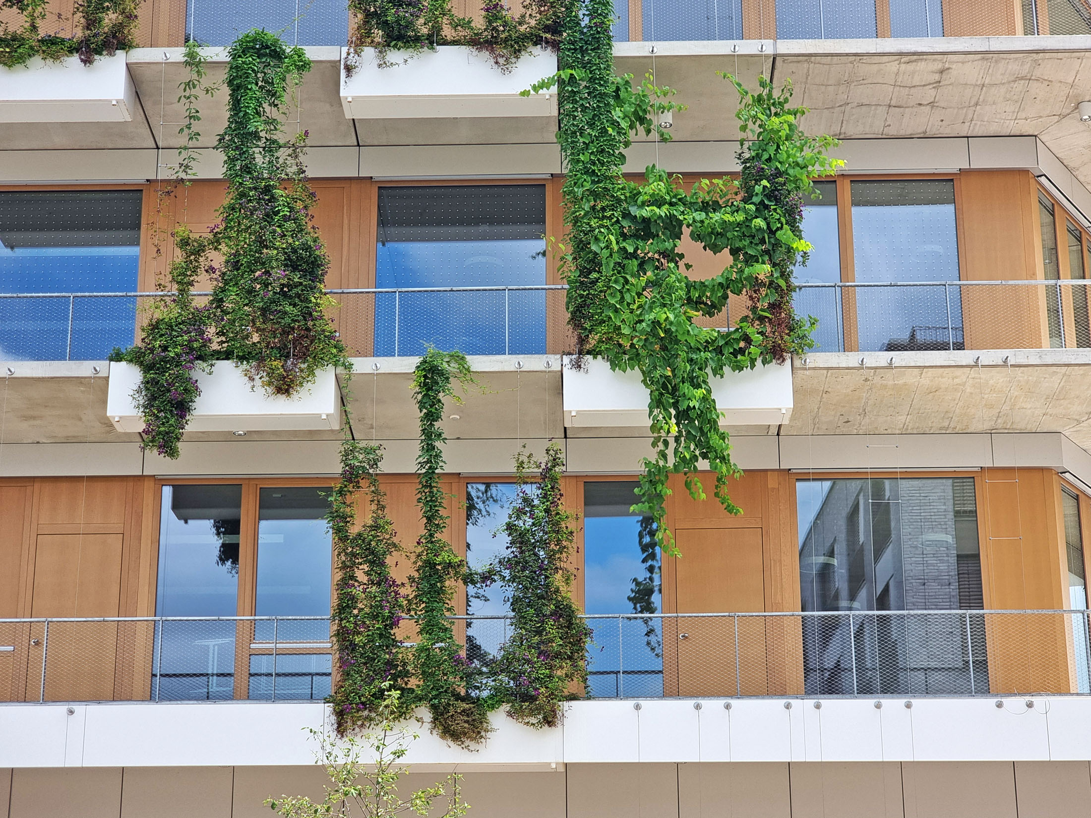 Bilder oben: Fassadenbegrünung im neuen gemischten Quartier „Neckarpark“ im Stuttgarter Veielbrunnen-Gebiet. Mittlerweile gibt es ausgeklügelte Systeme für die Montage und Bewässerung einer solchen „lebenden Fassade“.