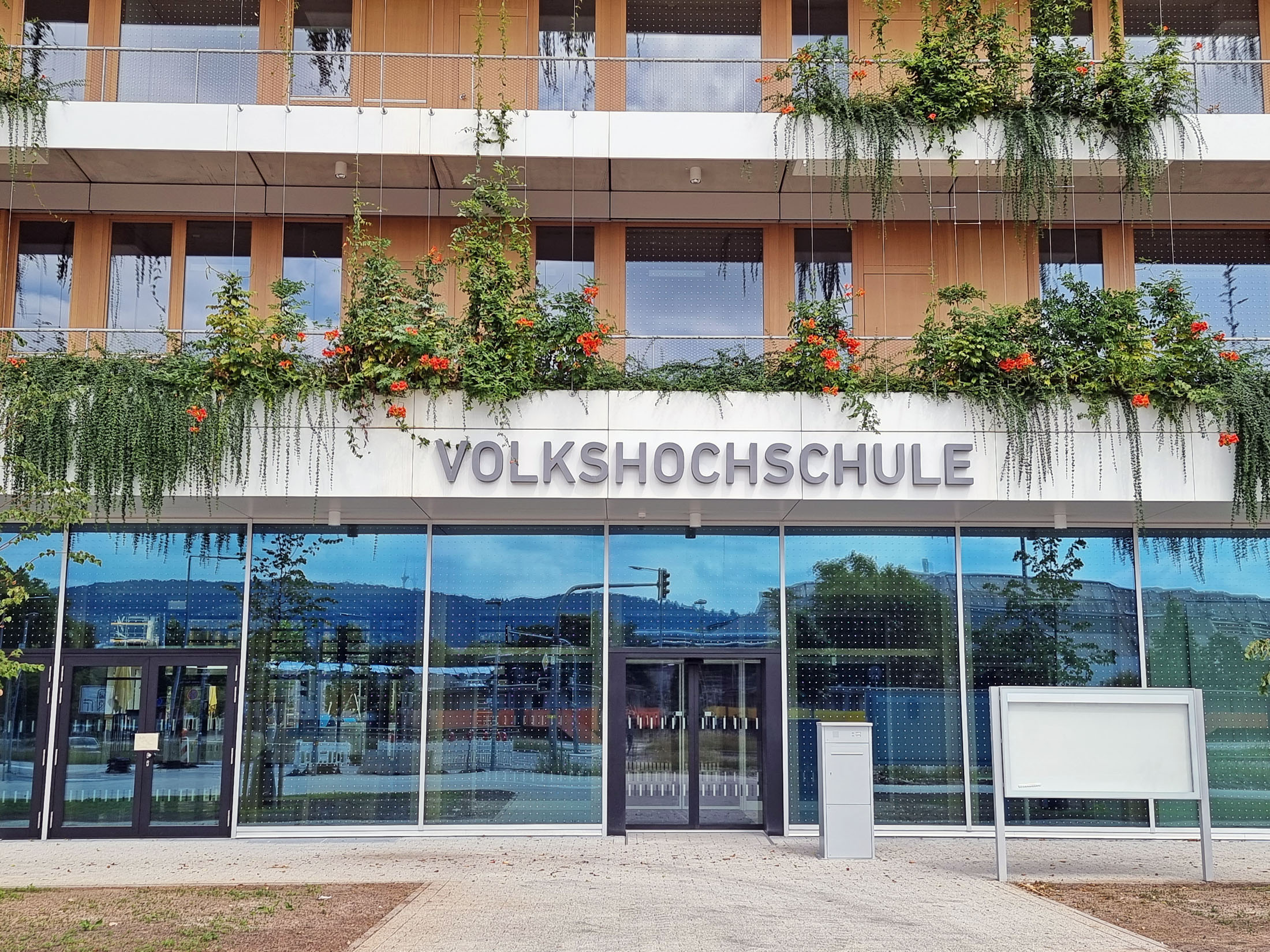 Bilder oben: Eingangsbereich der Volkshochschule im Bildungshaus an der Benzstraße.