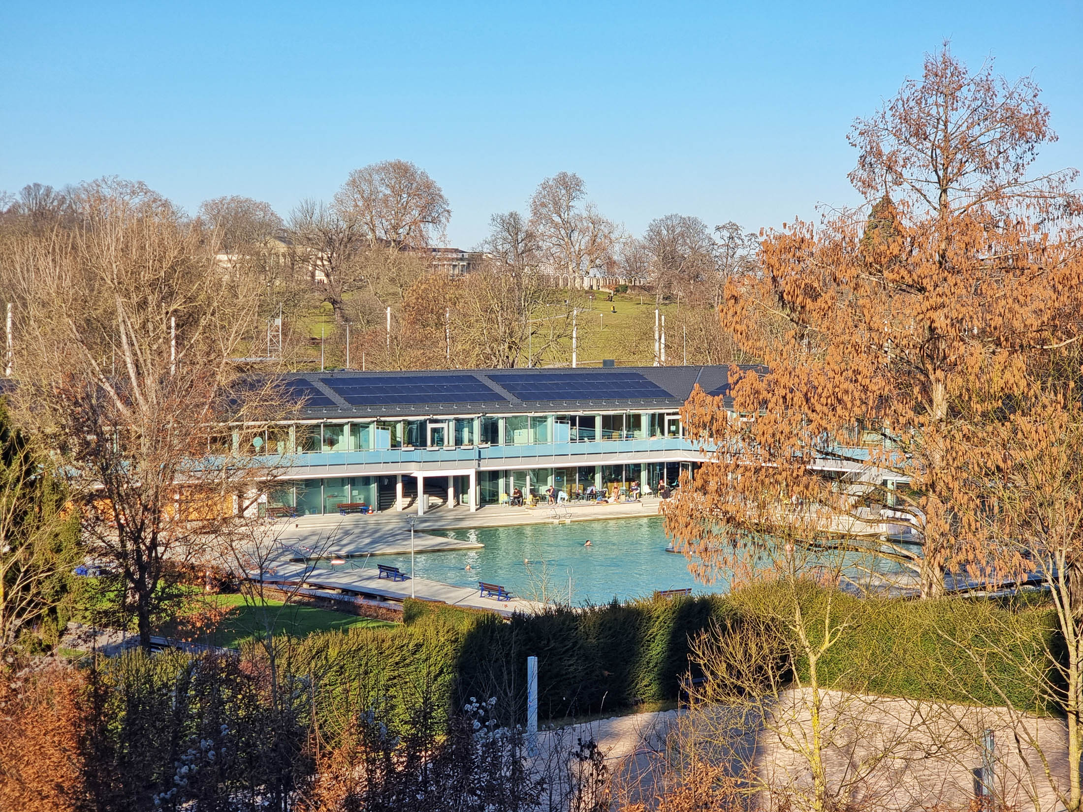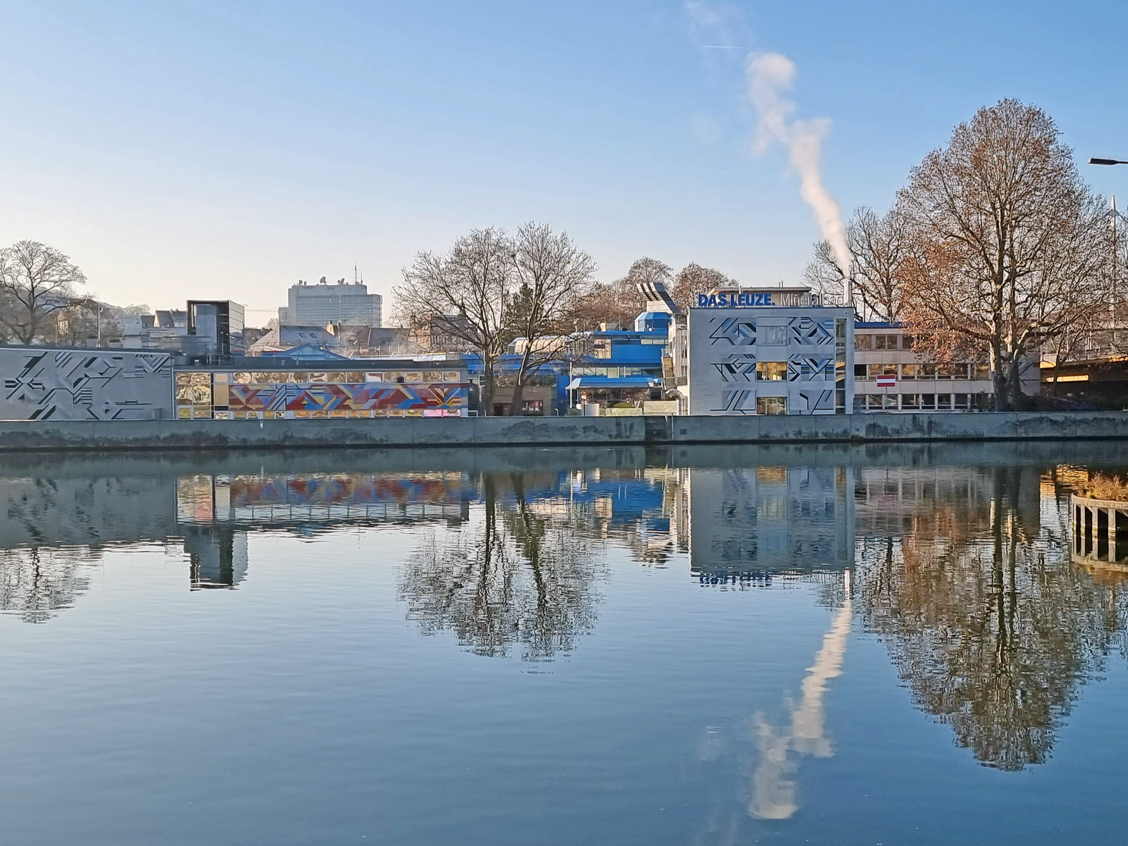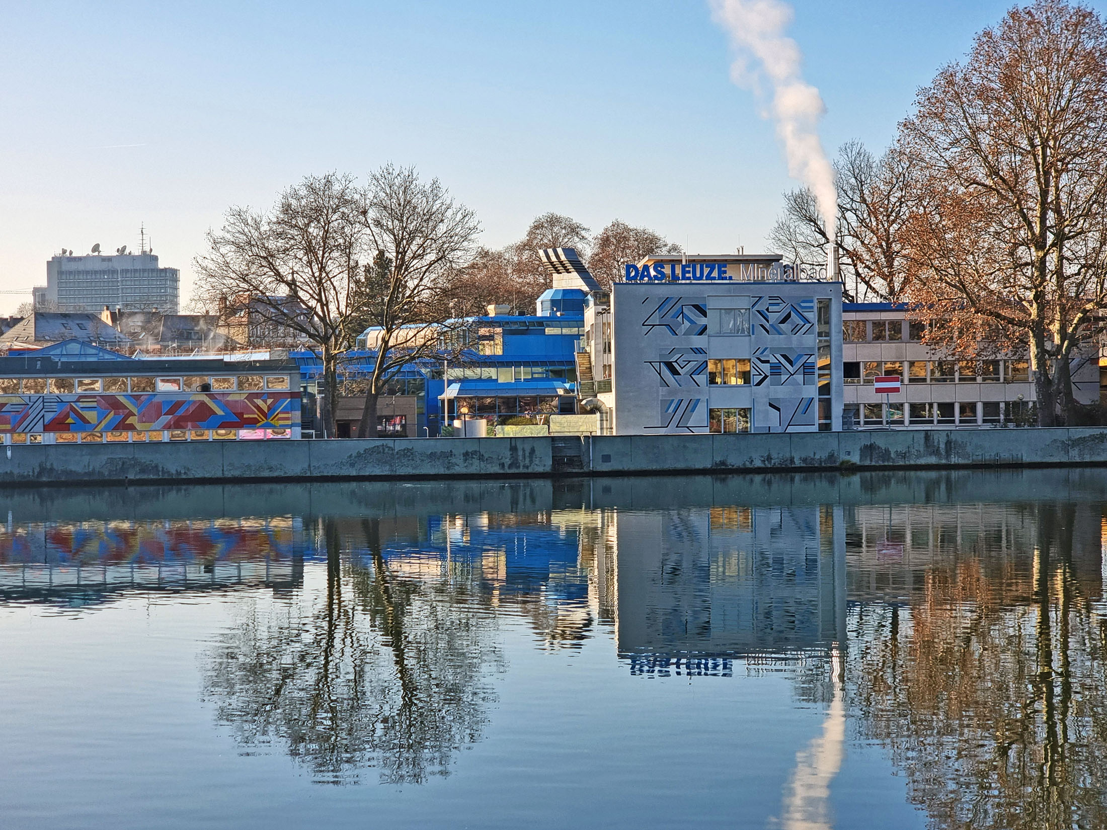 Bilder oben: Blick vom gegenüberliegenden Neckar-Ufer (Mercedes-Straße) auf das Mineralbad Leuze.