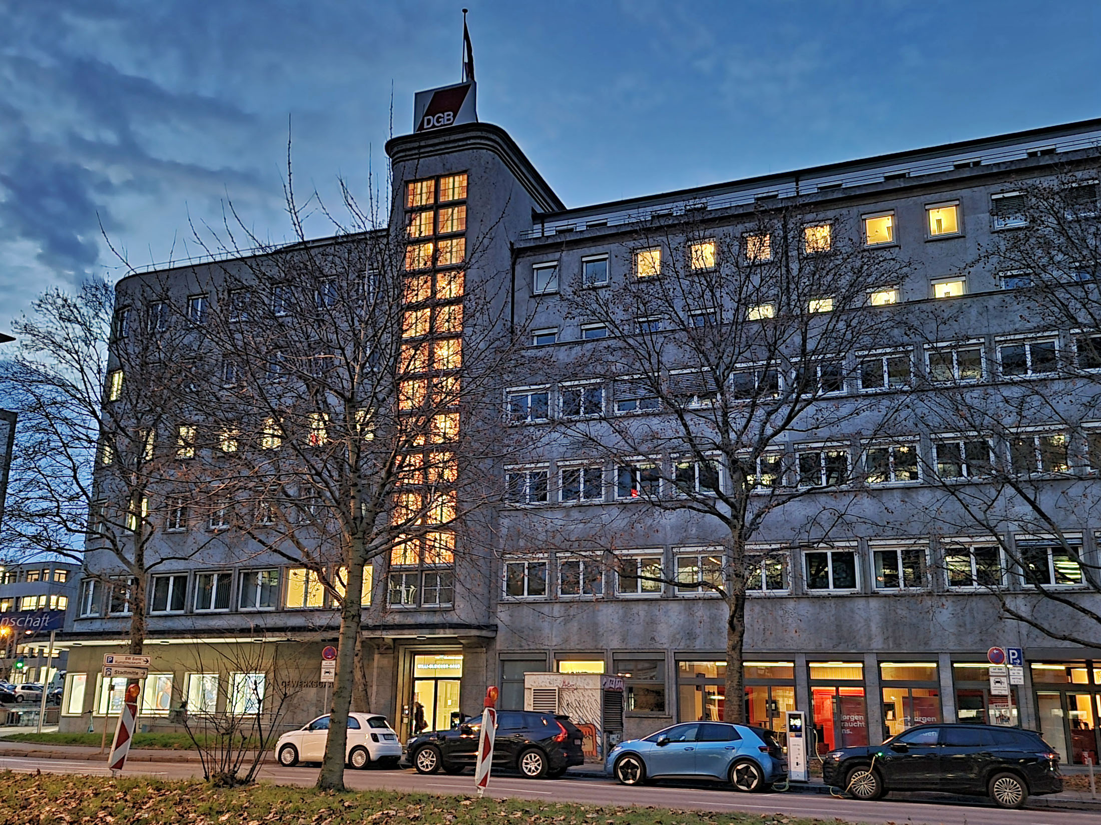 Bilder oben: das Gewerkschaftshaus am Abend.