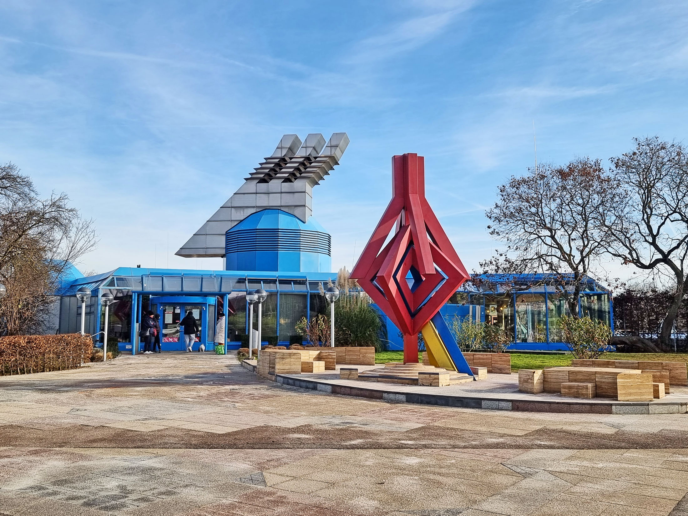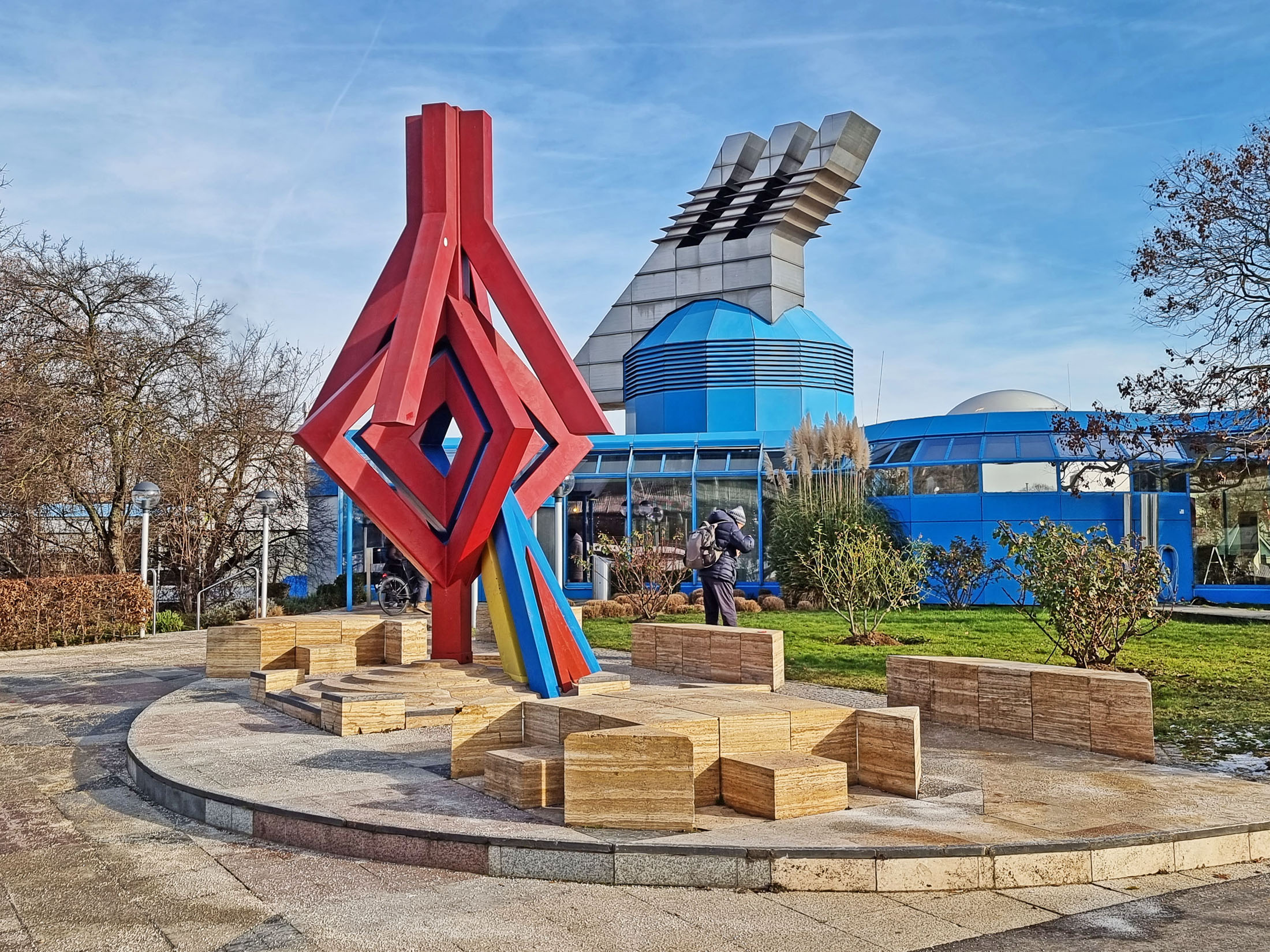 Bilder oben: am Gebäude und an der vor dem Eingang aufgestellten Plastik ist die Handschrift des Künstlers Otto Herberg Hajek sofort zu erkennen.