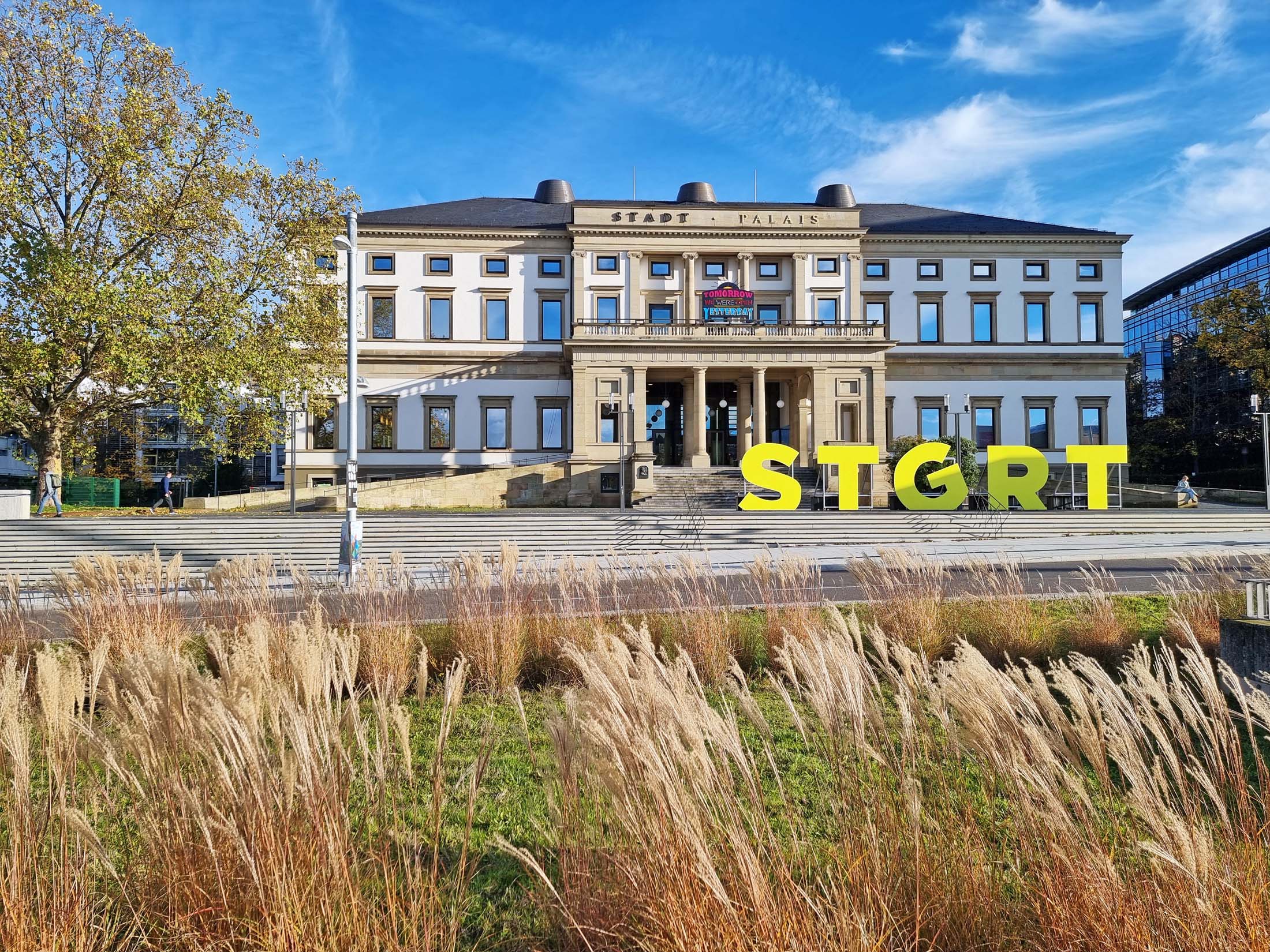 Zum Bild: an der Glasfassade des Kunstmuseums am Stuttgarter Schlossplatz ist der Name der Stadt in verschiedenen Sprachen/Schriften dargestellt, zusammen mit der Silhouette bekannter Gebäude.