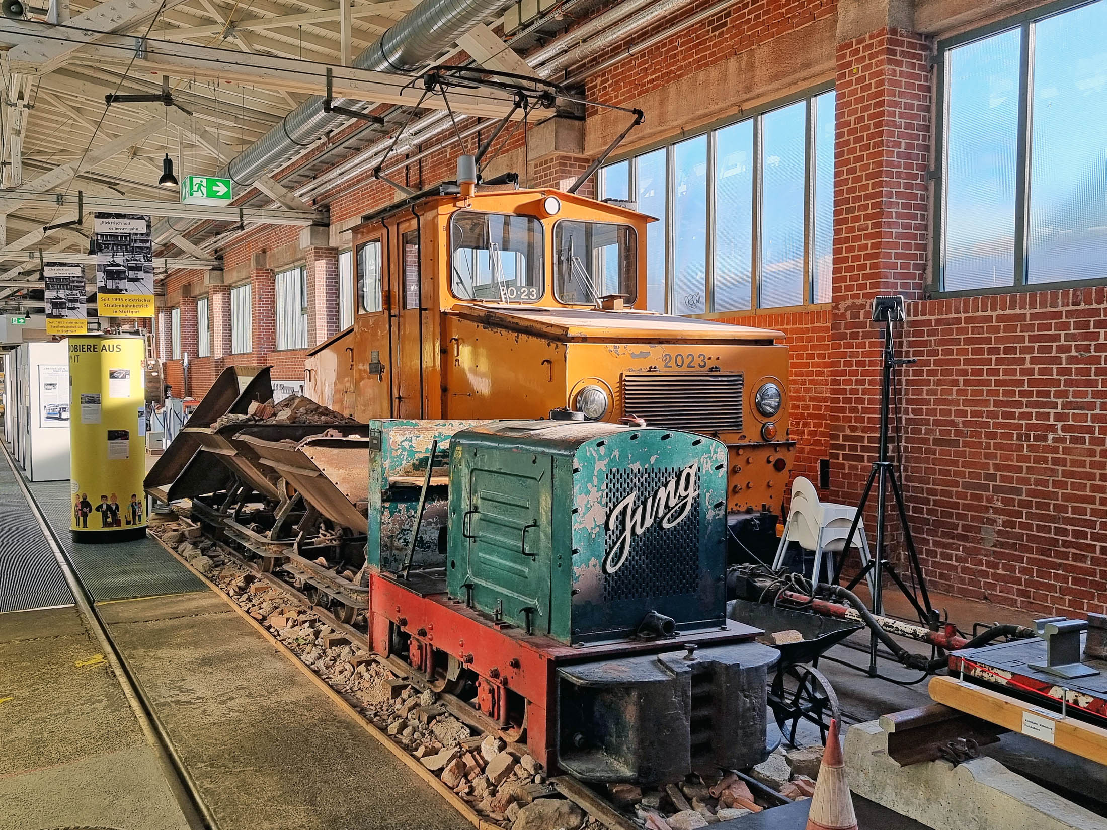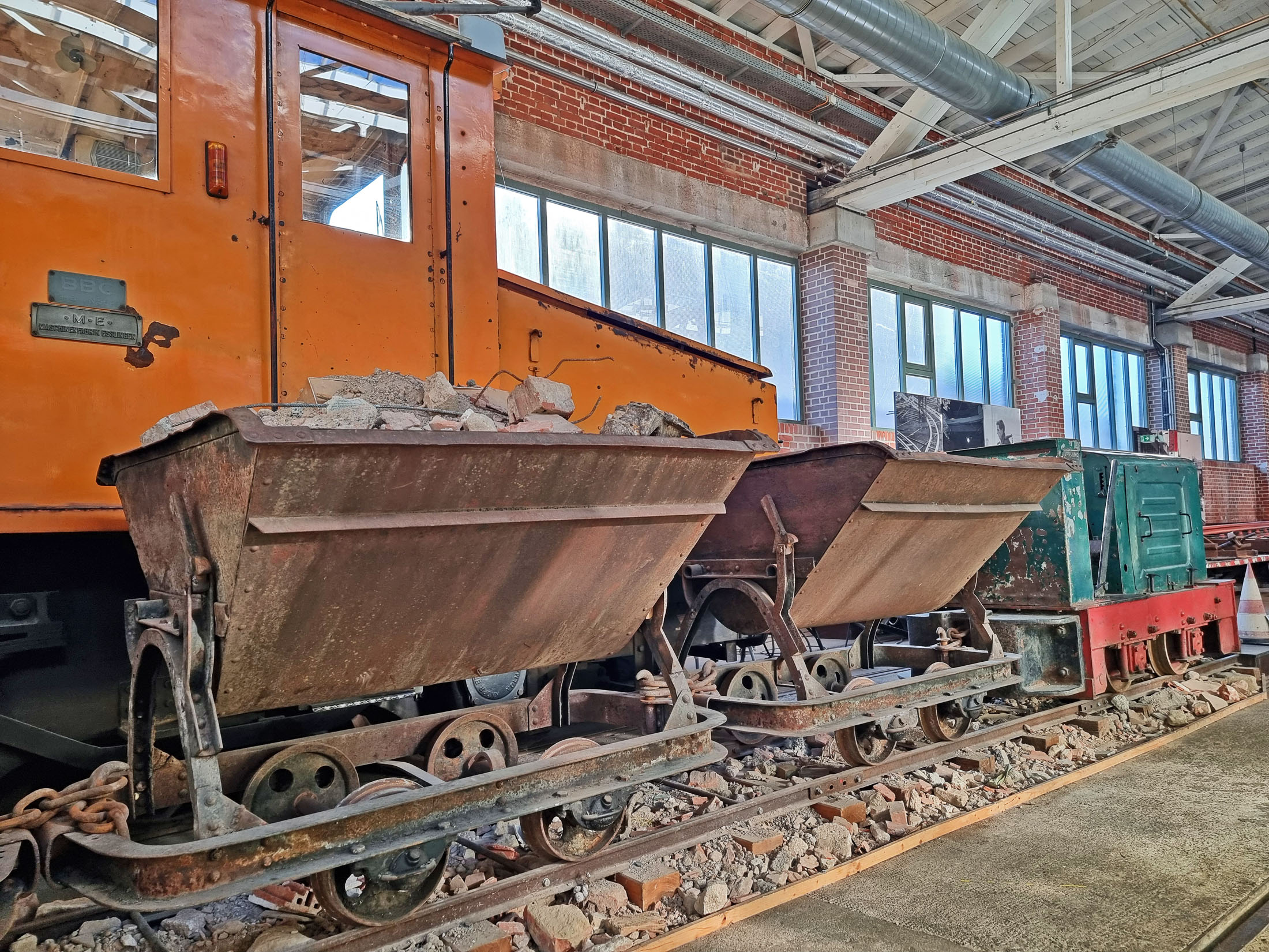 Bilder oben: „Trümmer-Lokomotive“ und dazugehörige Wagen im Stuttgarter Straßenbahn-Museum: mit solchen Zügen (Baujahr 1946) wurden in der Nachkriegszeit Trümmer aus der Stadt geschafft.