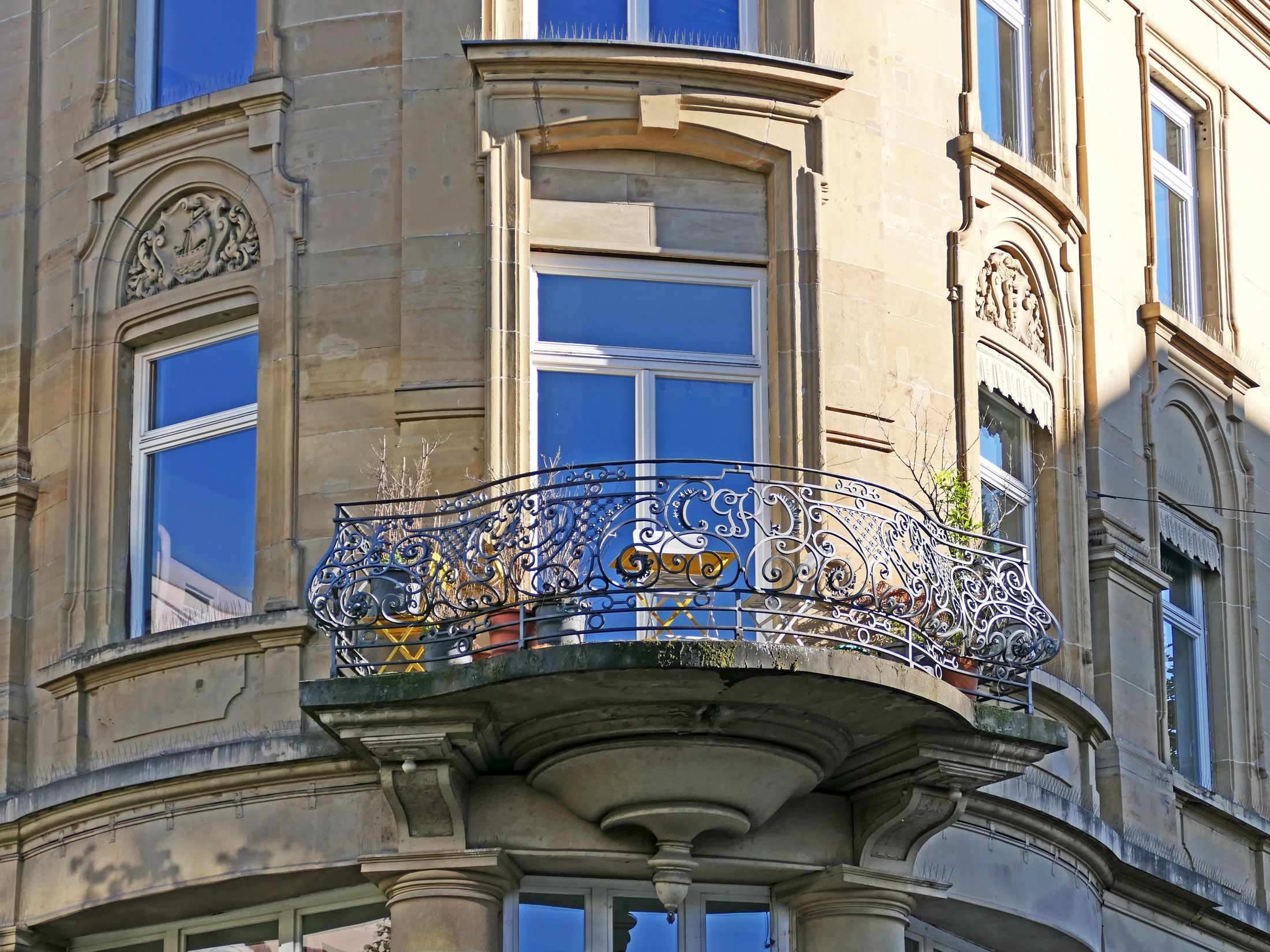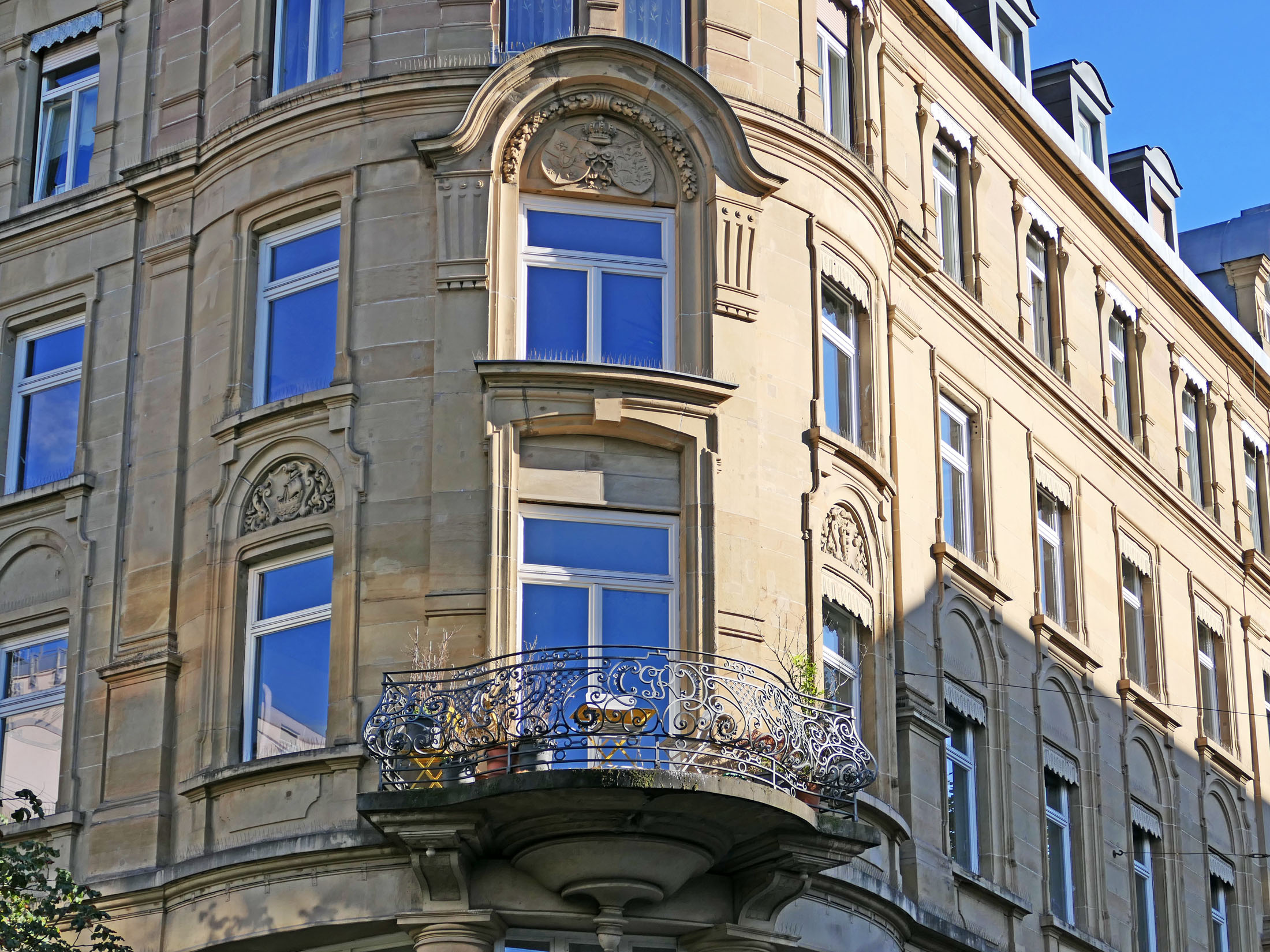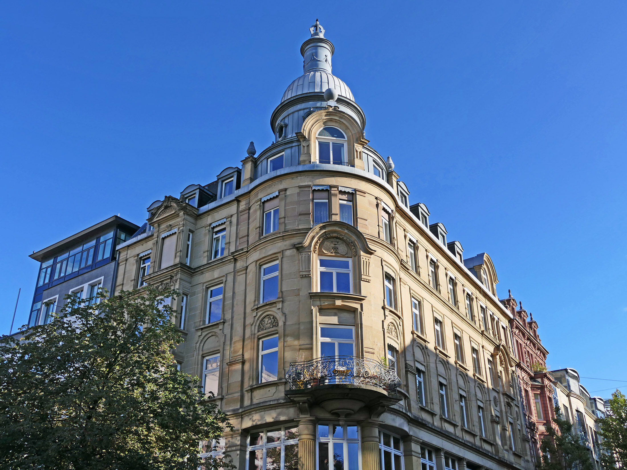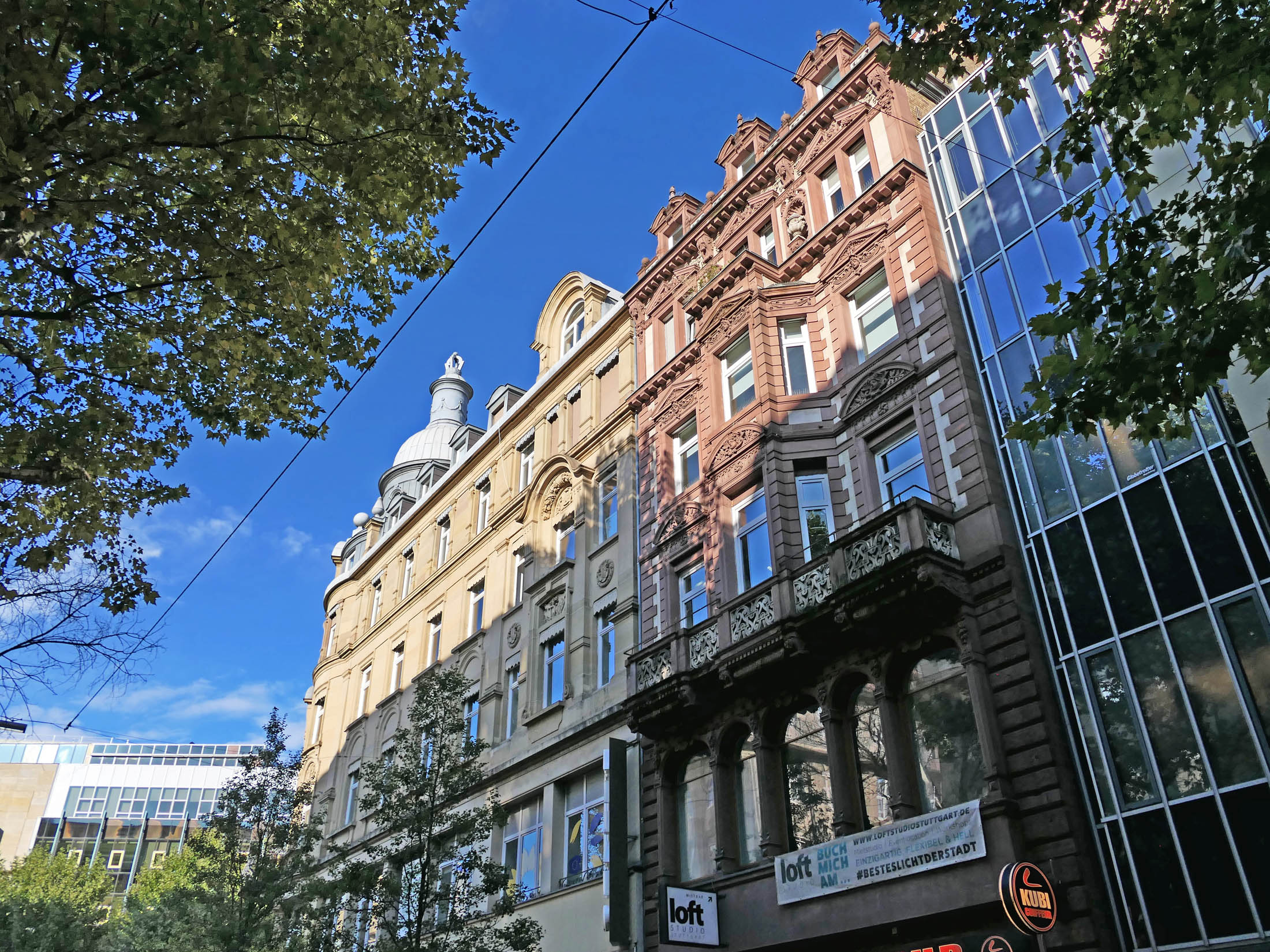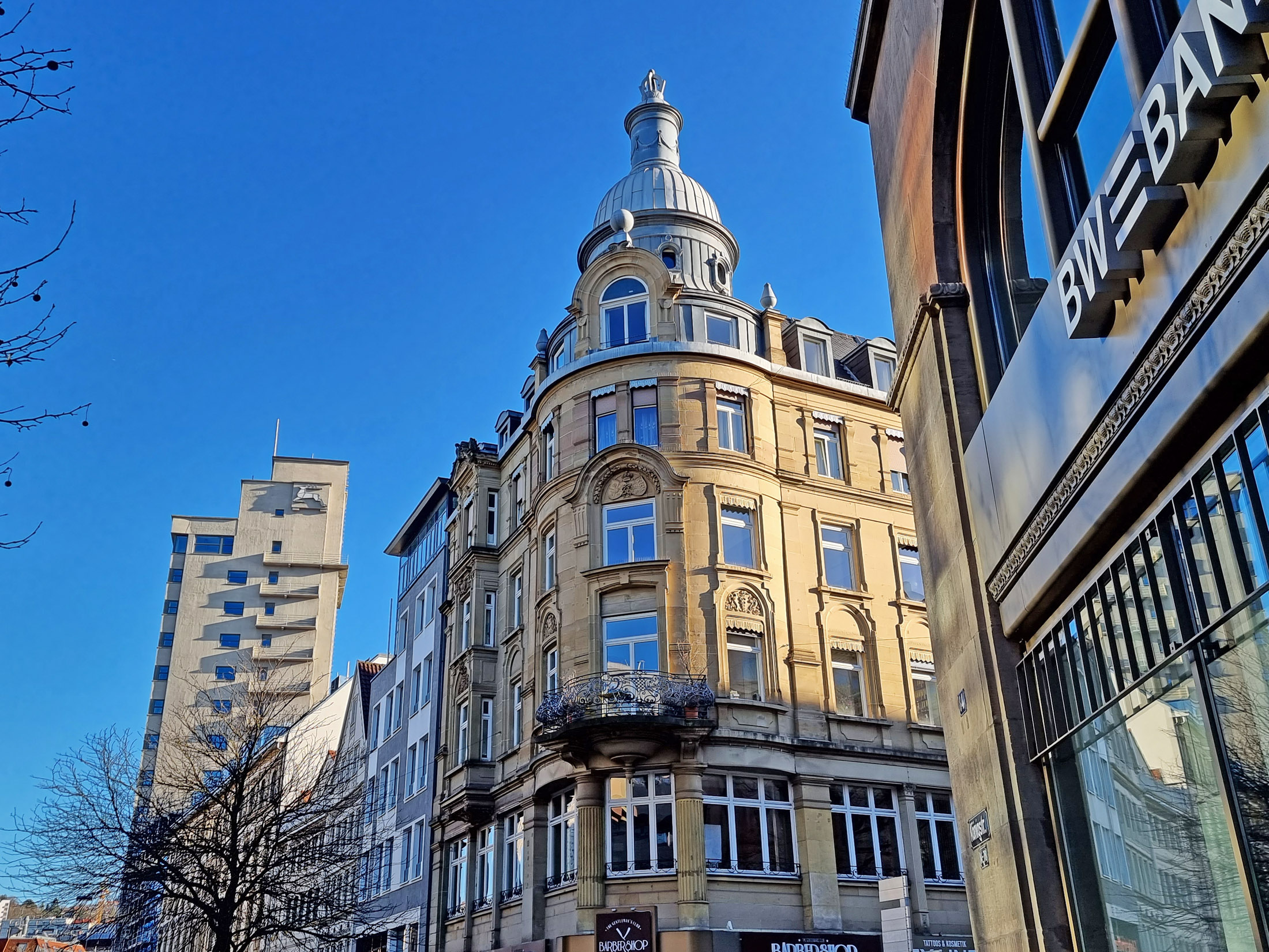 Bilder oben: der Carl-Eugen-Bau spiegelt sich in der Fassade des gegenüberliegenden Bankgebäudes.