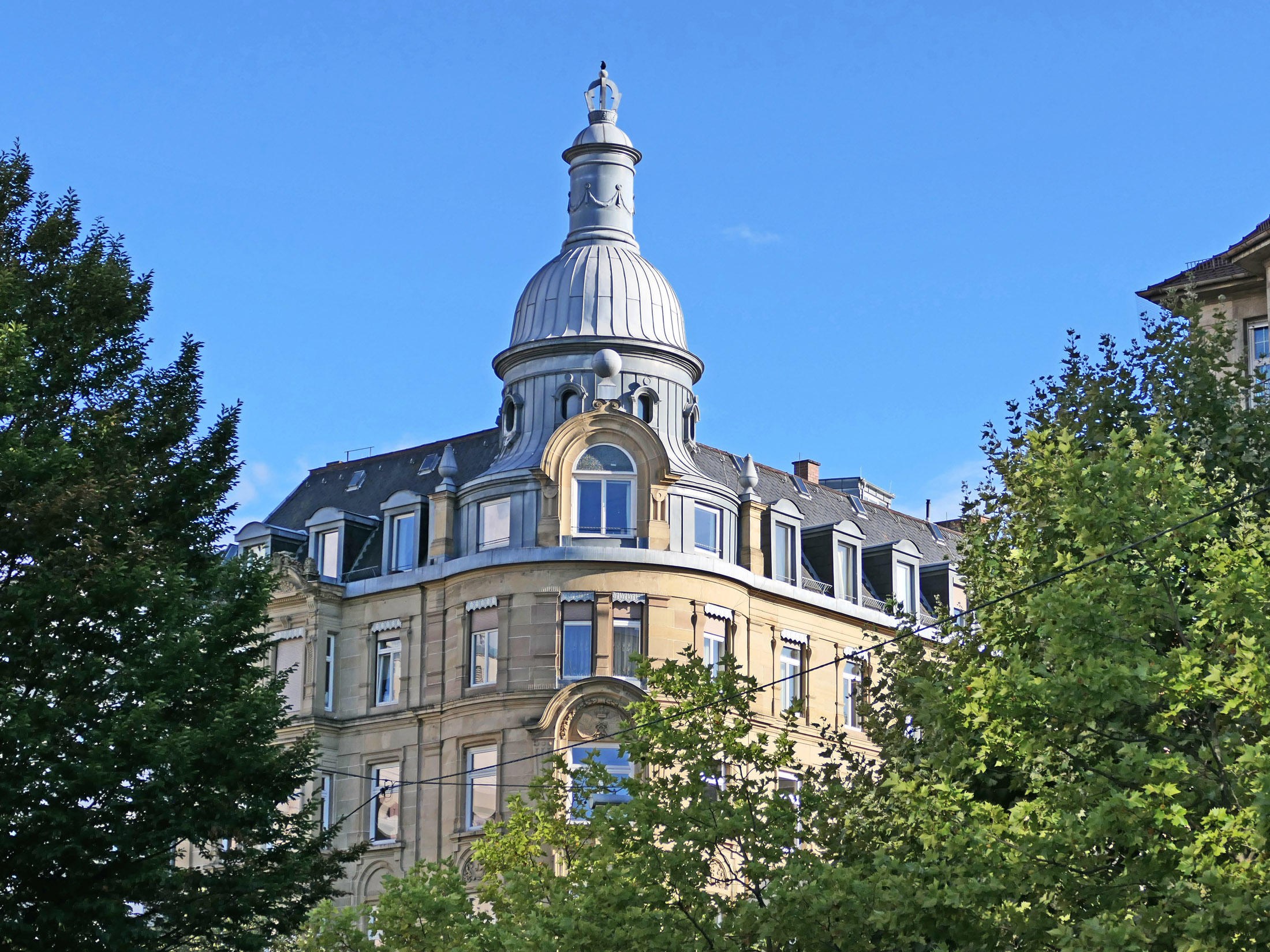 Bild oben: das ifa-Gebäude am Charlottenplatz (mit dem Charlottenplatz-Hochhaus); Blick vom Riesenrad, das im Herbst 2021 im Ehrenhof des Neuen Schlosses aufgestellt war. Das Gebäude hat einen trapezförmigen Grundriss; auffallend ist das Walmdach mit den Dacherkern.