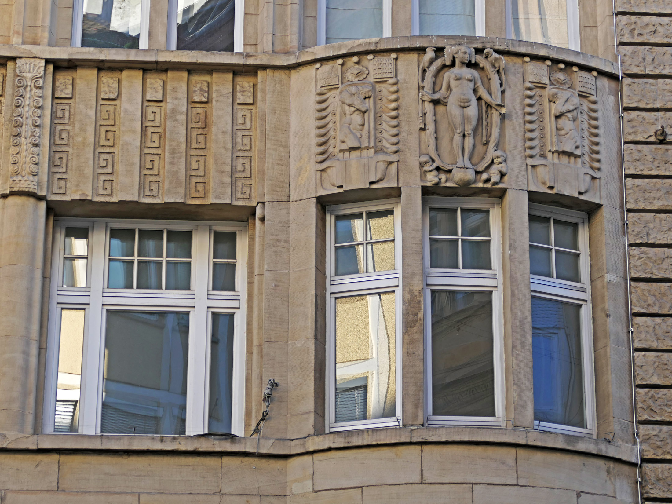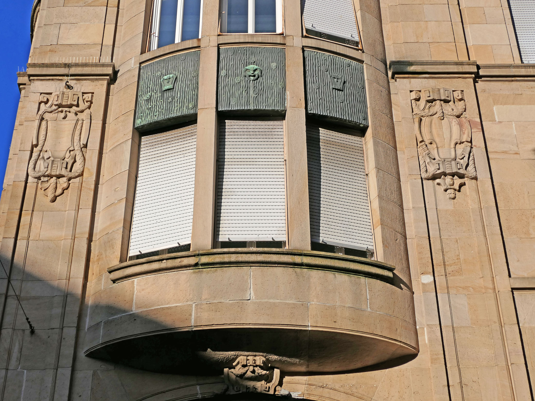 Das in Stahlbeton gefertigte Gebäude zeigt an der mit Muschelkalk verkleideten Fassade zum Bahnhof hin hohe, sich über drei Stockwerke erstreckende Arkadenbögen; die beiden oberen Stockwerke waren gestaffelt nach hinten gesetzt.