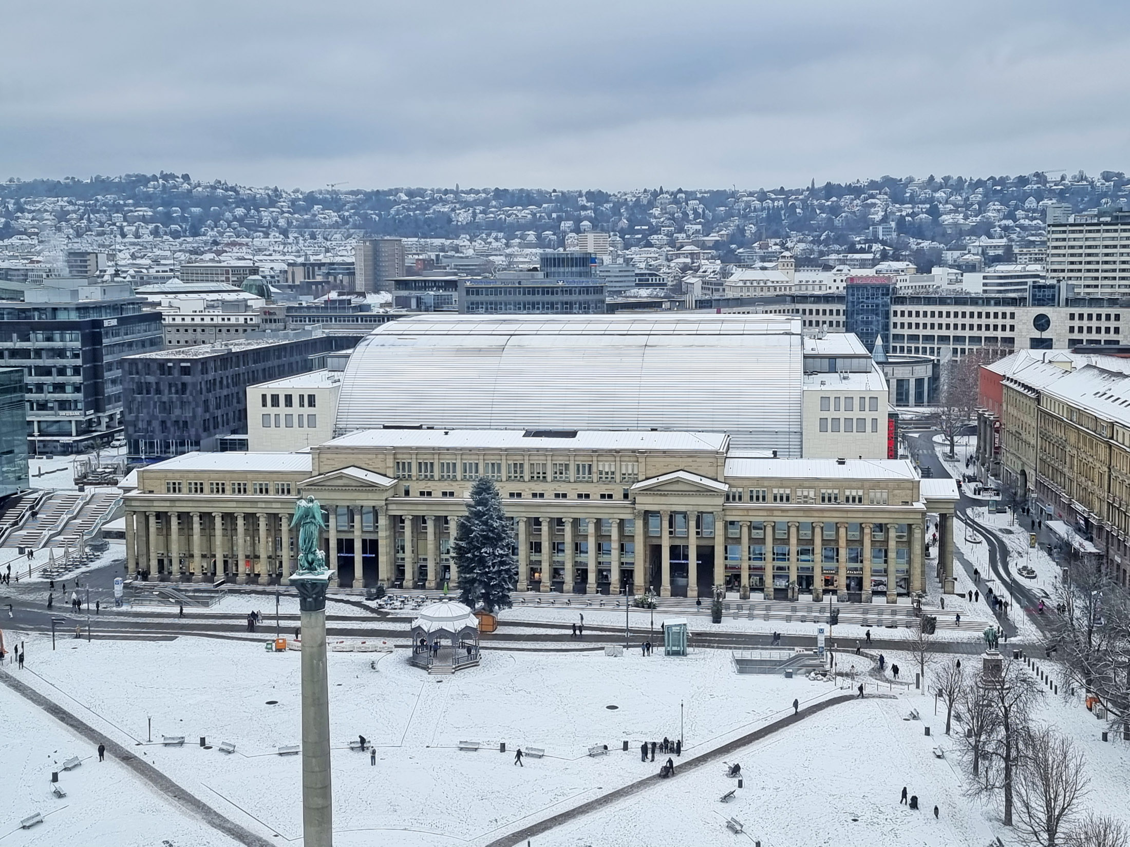 Bild oben: das ifa-Gebäude am Charlottenplatz (mit dem Charlottenplatz-Hochhaus); Blick vom Riesenrad, das im Herbst 2021 und im Winter 2025 im Ehrenhof des Neuen Schlosses aufgestellt war. Das Gebäude hat einen trapezförmigen Grundriss; auffallend ist das Walmdach mit den Dacherkern.